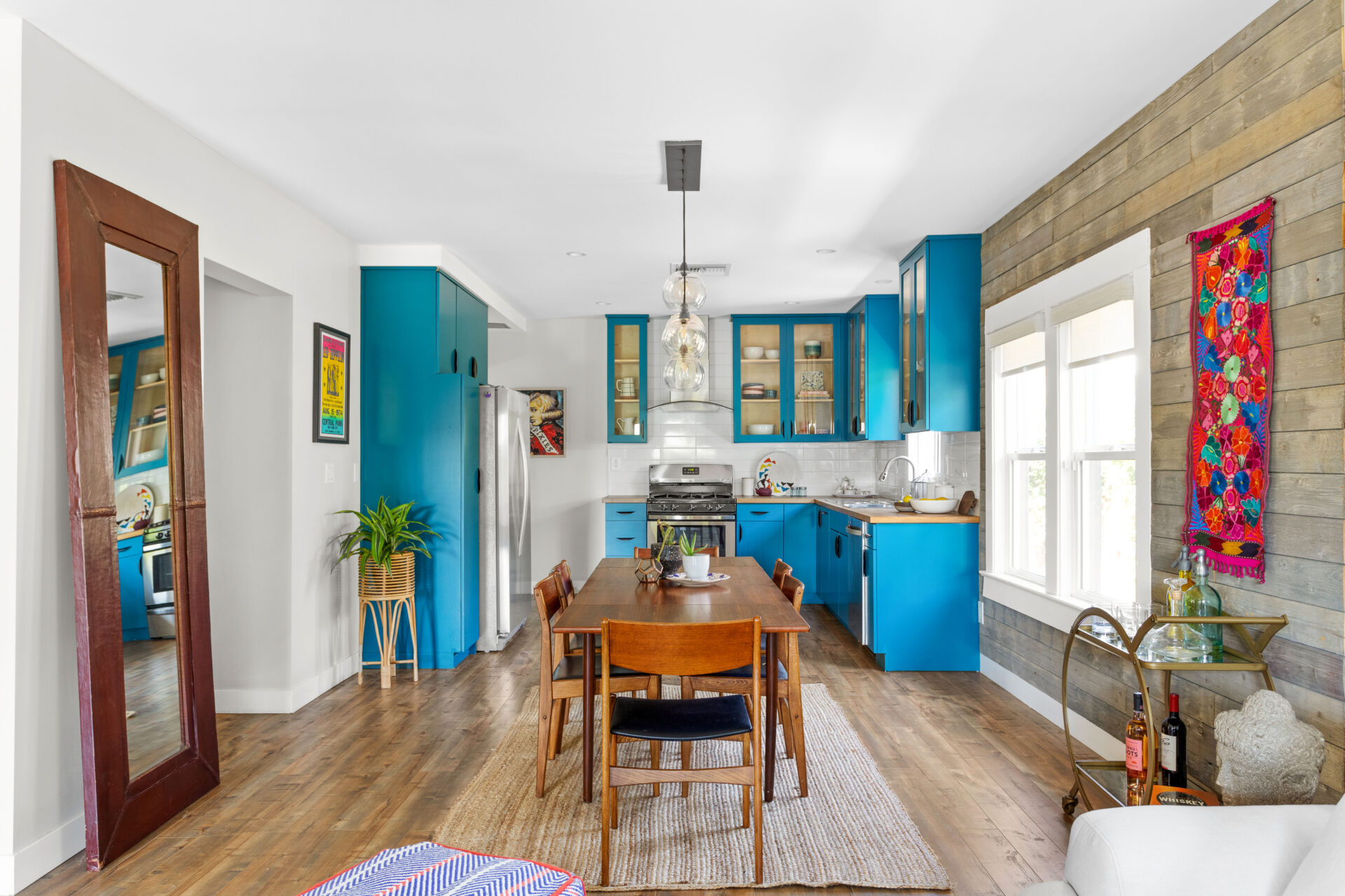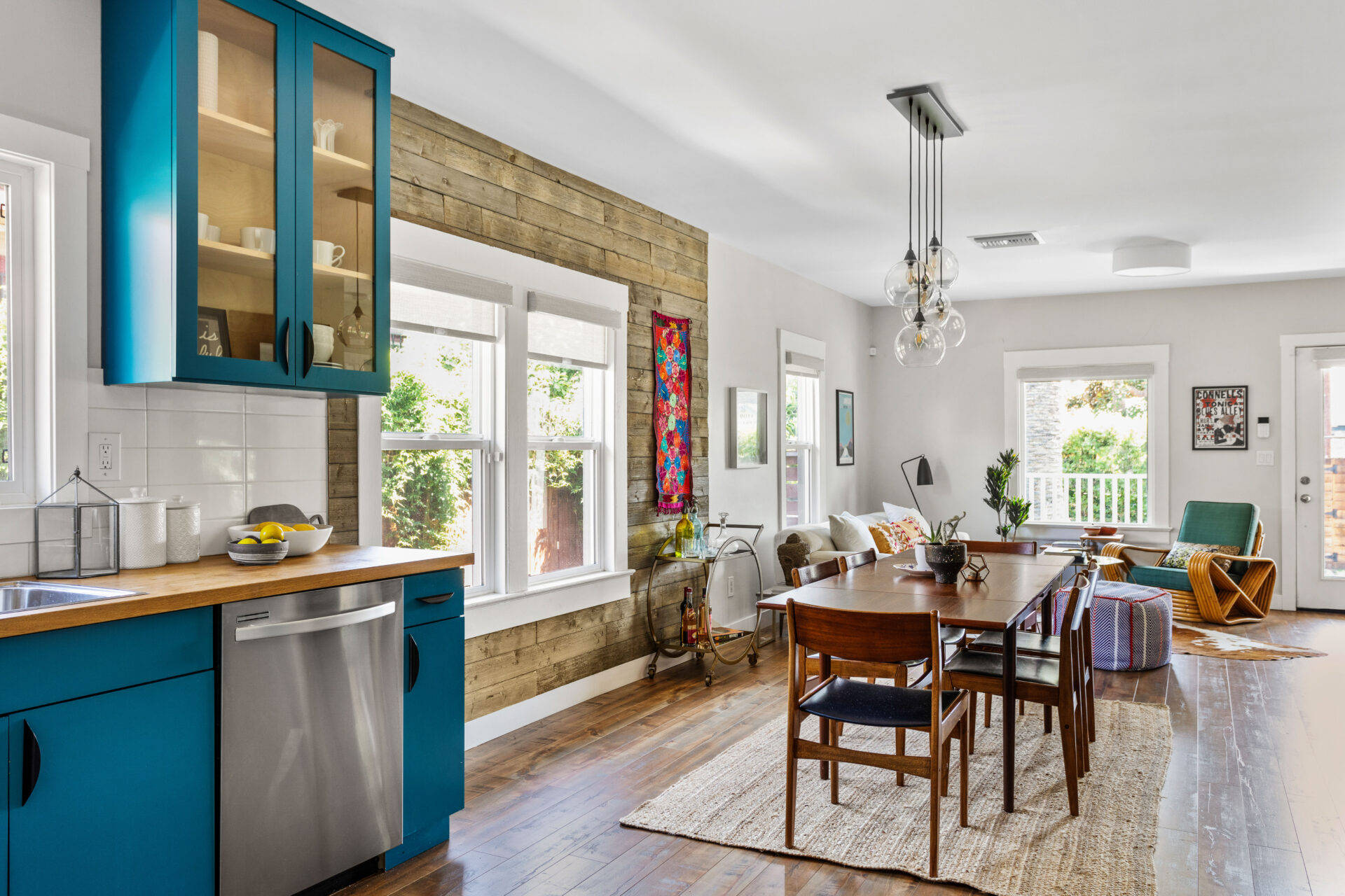 Large living room/dining room/kitchen makes a dramatic impact, from the modern dining lighting to the character blue cabinets with butcherblock counters, subway tile backsplash and stainless steel appliances.