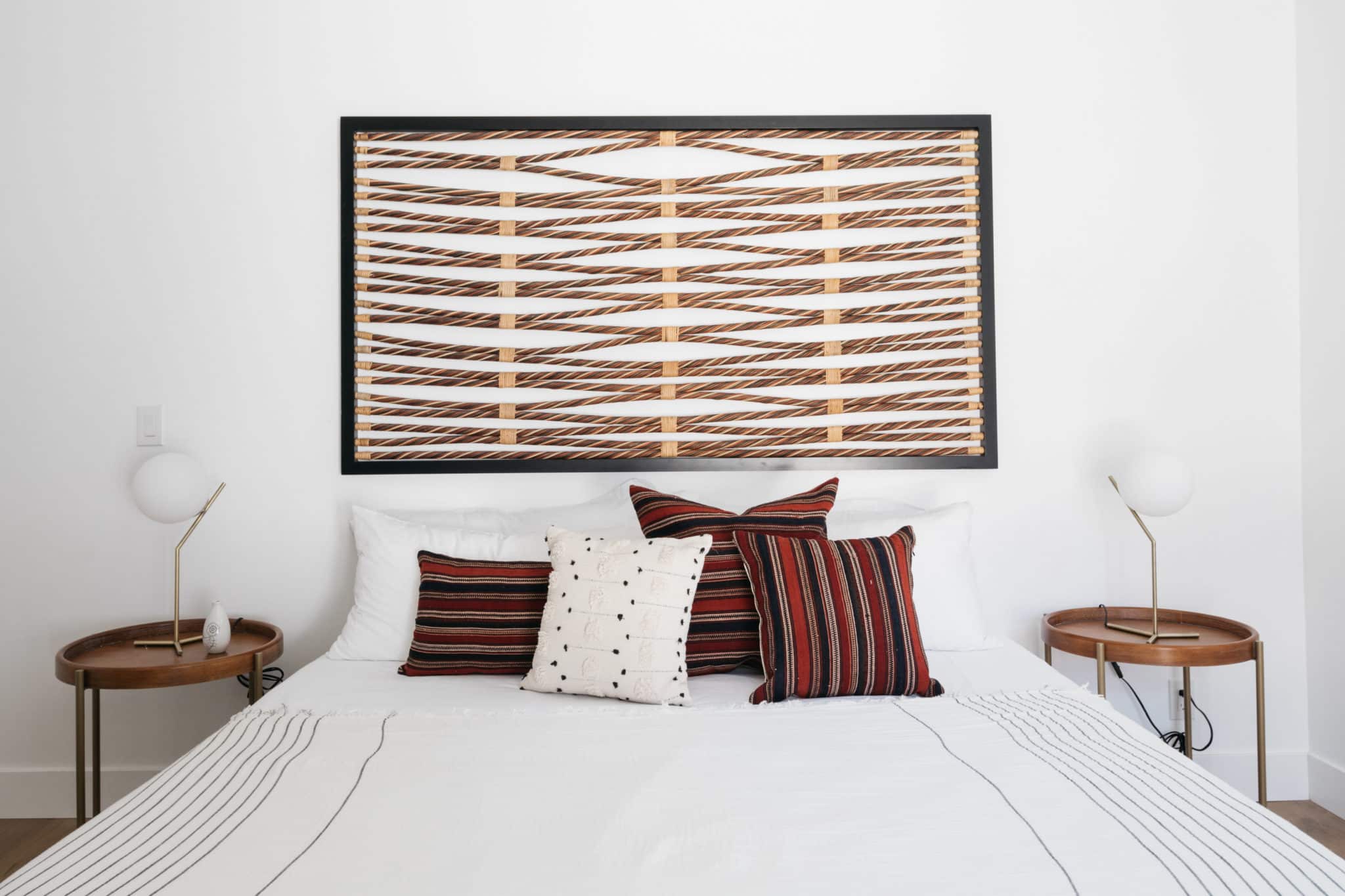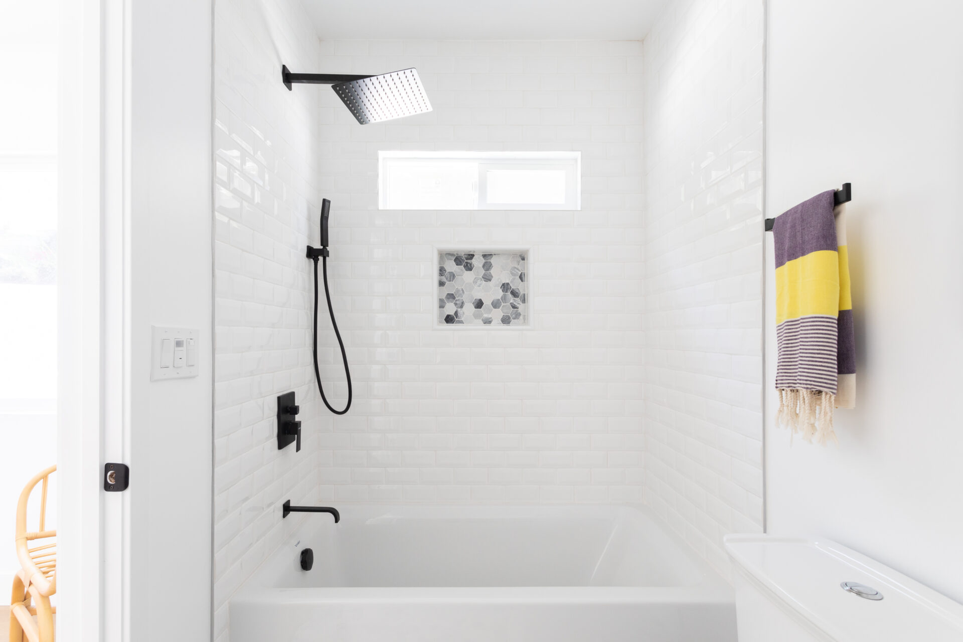 Two spacious guest bedrooms, one with ensuite bath featuring fresh subway tiling, matte black finishes and rainfall shower over tub, offer perfect overflow space.