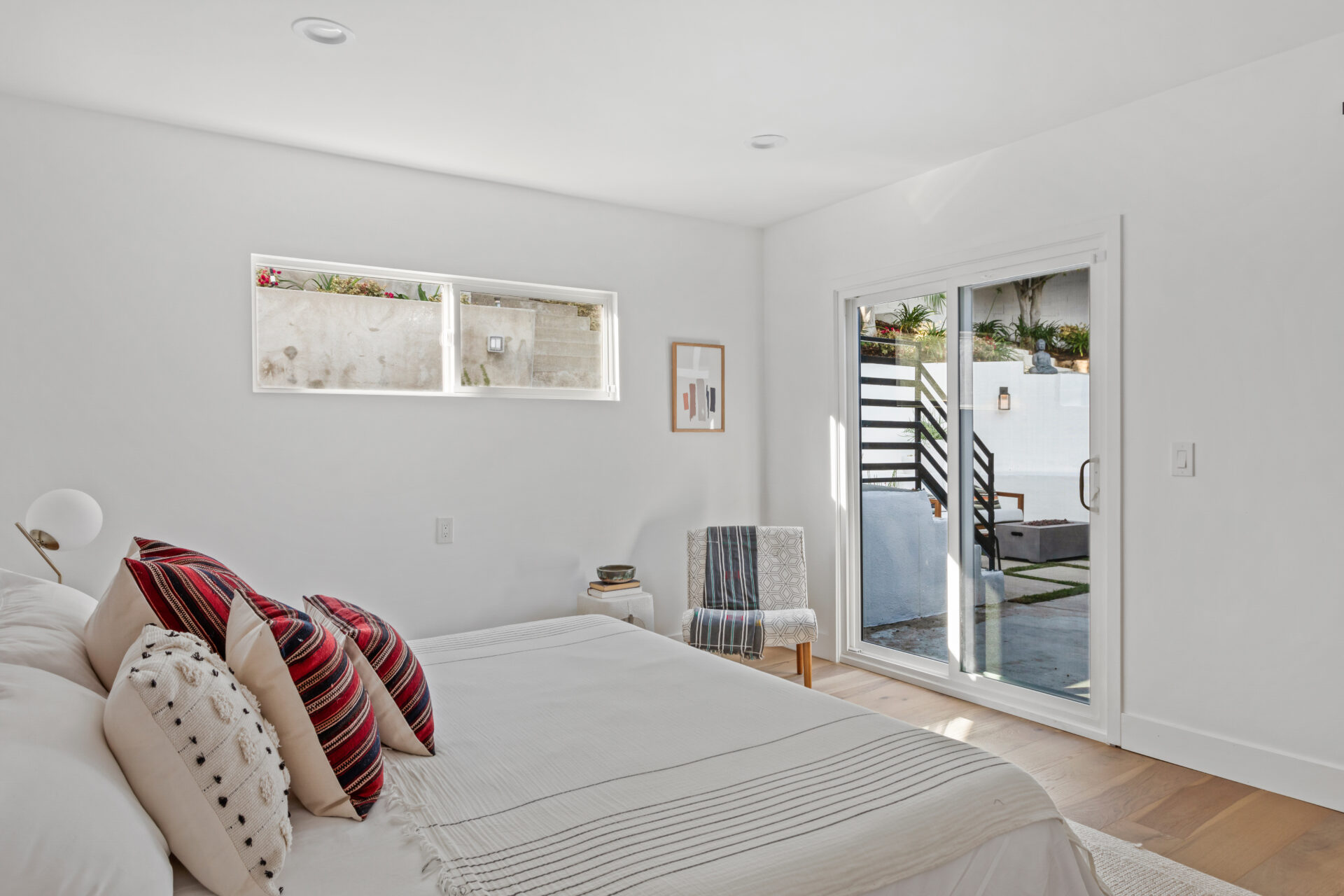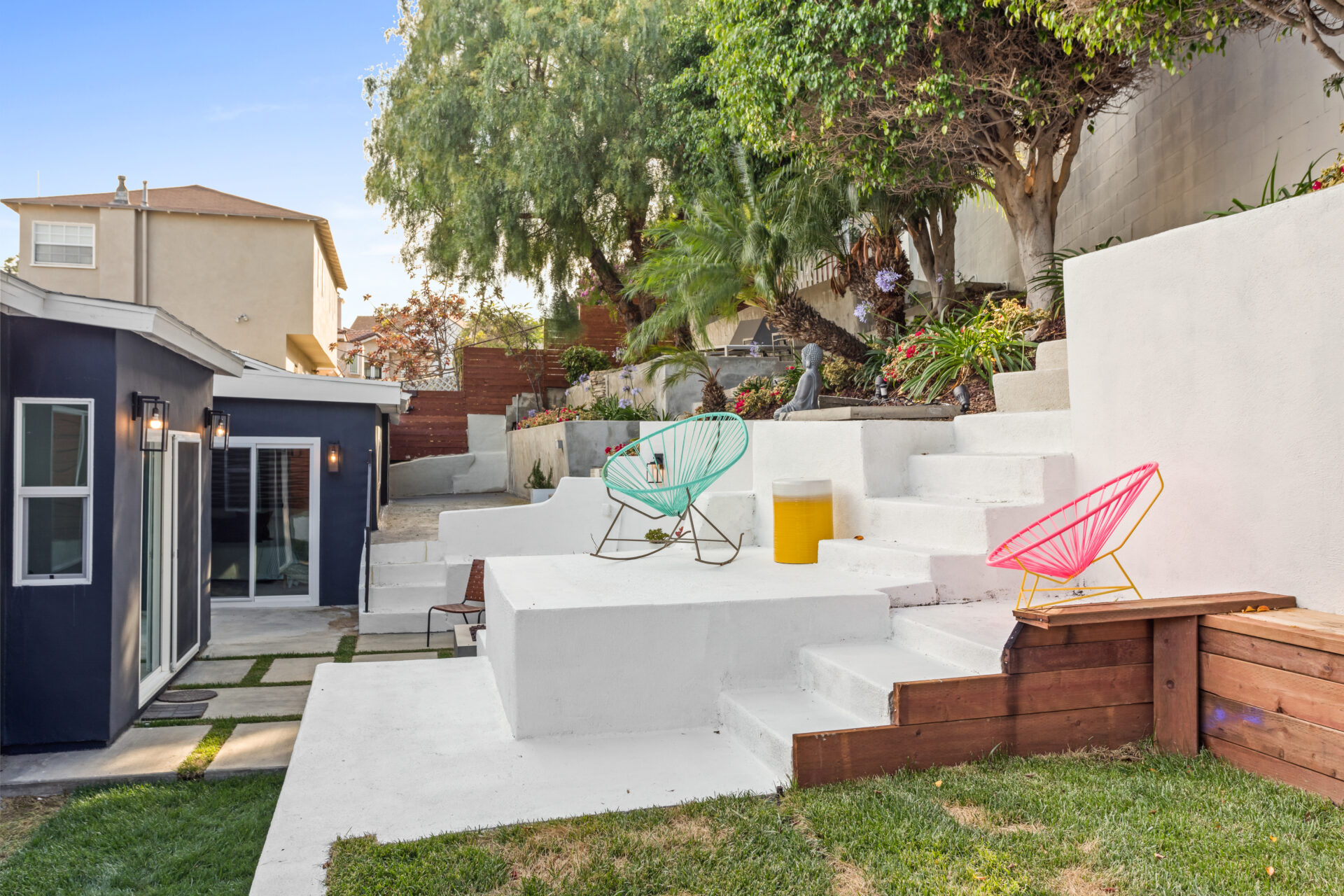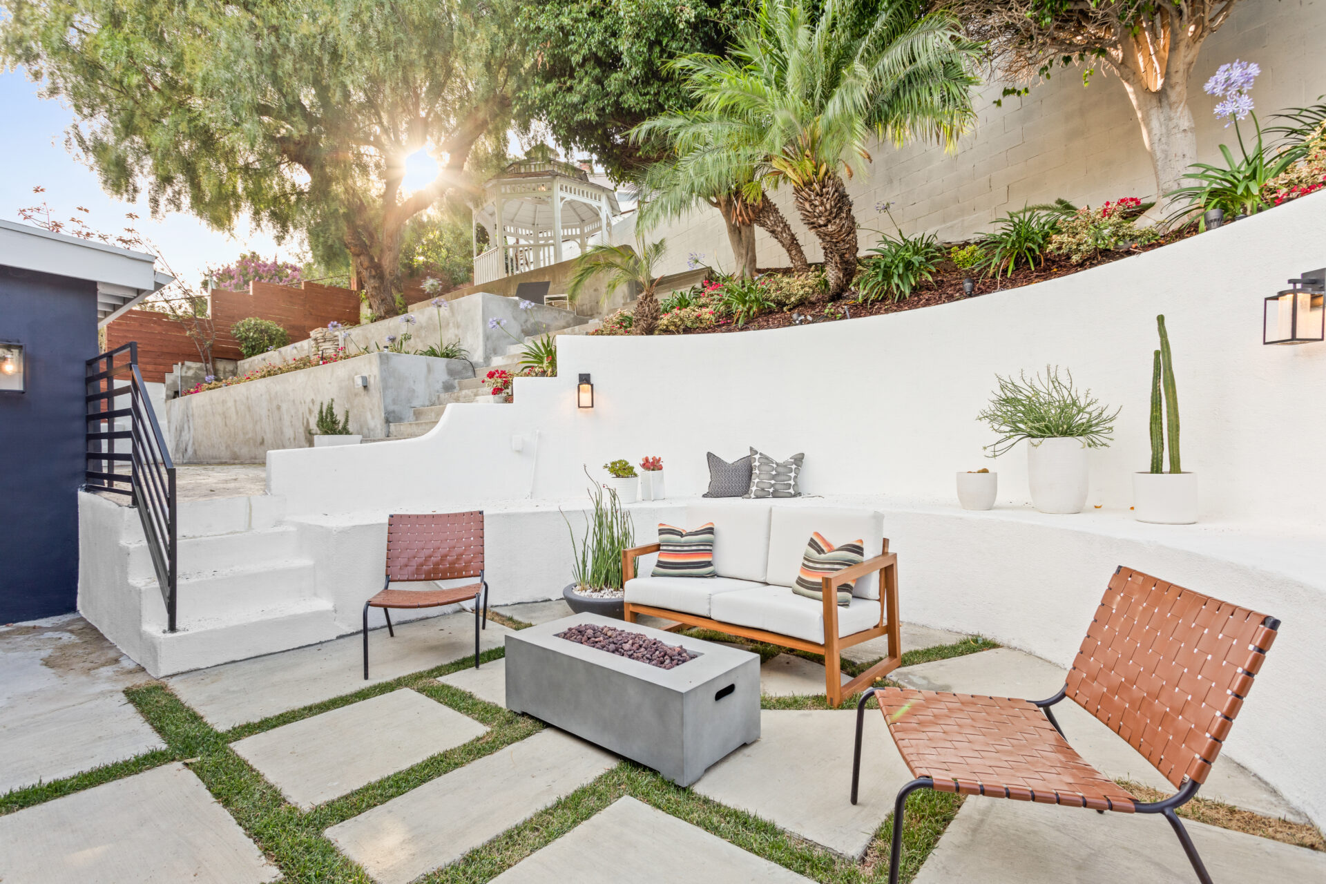 The terraced backyard, easily accessible through sliding doors in the principal suite and den is perfect for enjoying an evening with friends and family, lounging beneath the mature trees, or taking in a moment of serenity in the gazebo.