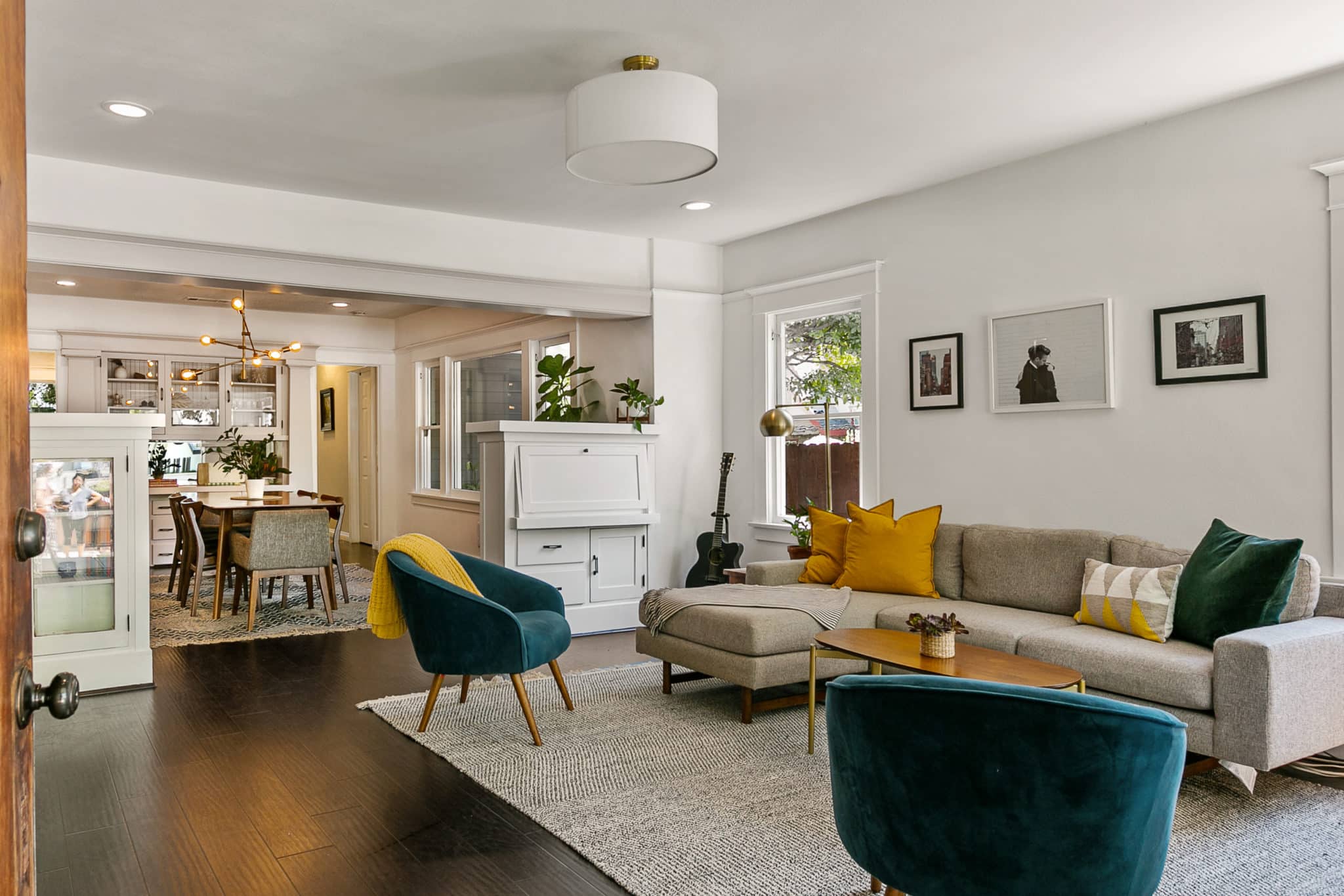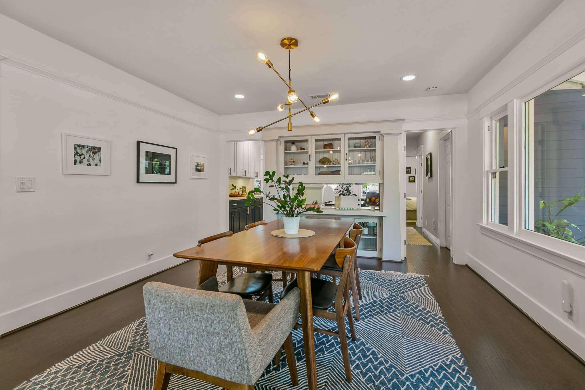 The formal dining room with built-ins galore and delightful living room flow seamlessly for entertaining.