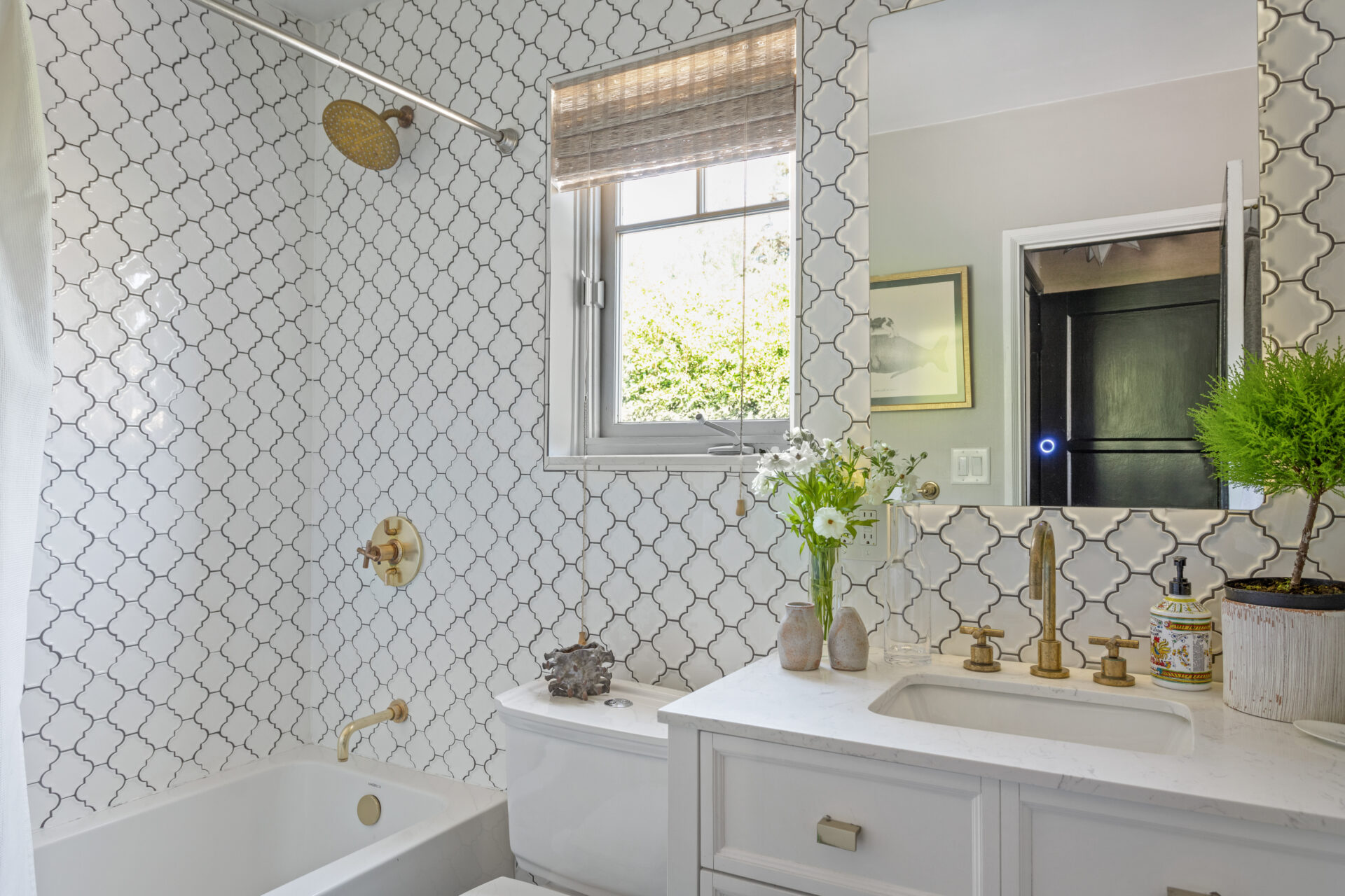 Two ample bedrooms, each with dedicated full bath, allow you to choose your principal suite! Downstairs, enjoy a large bedroom with dual vanity tile bathroom, large closets and tons of light. Upstairs features Phillip Jeffries wallpaper, custom closets and private balcony.