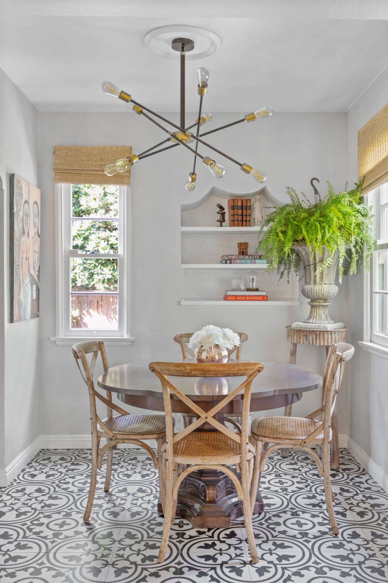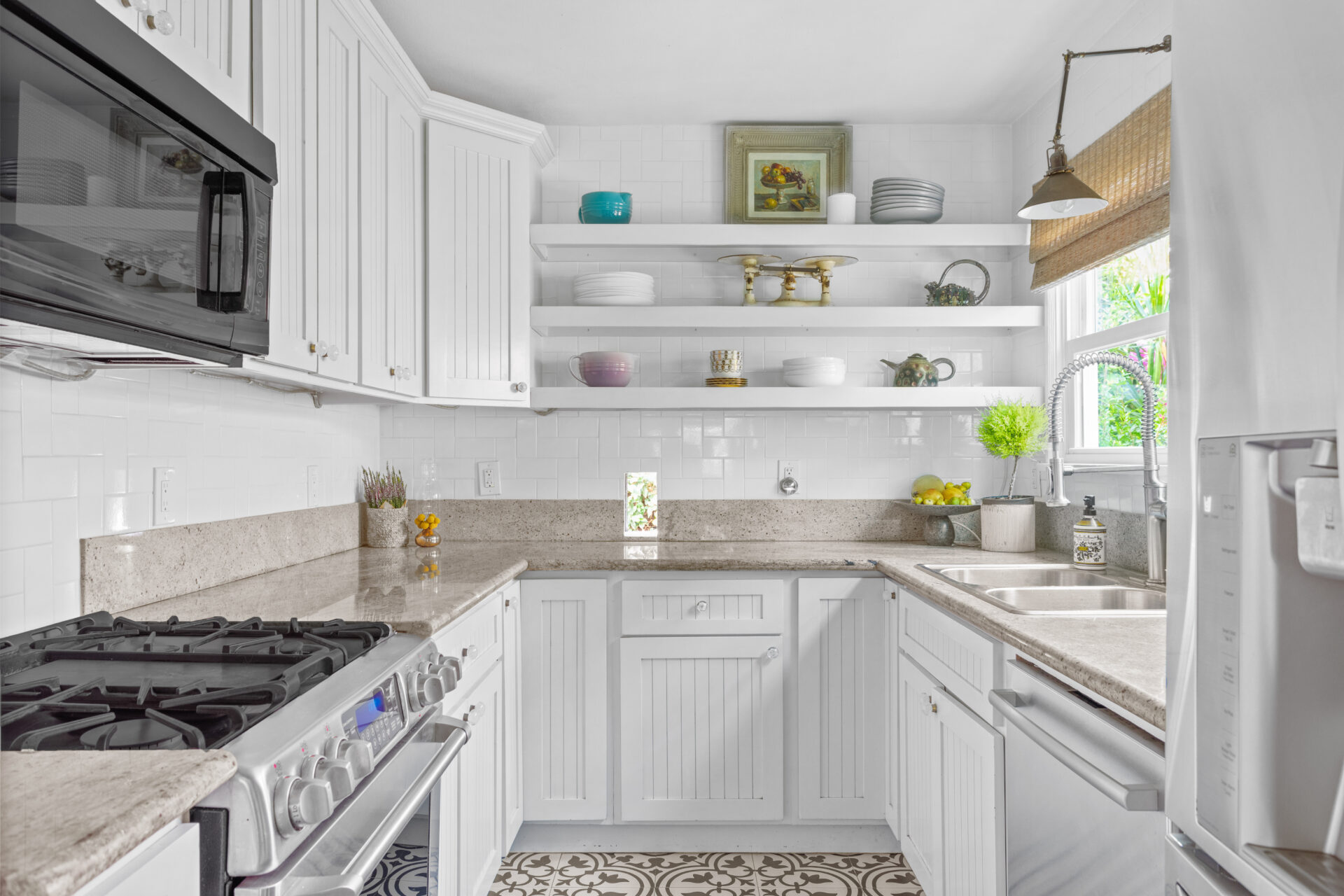 Formal dining with period built-ins and modern lighting plus PDC designer tile floors, leads to clean and chic modern kitchen featuring stone counters, tons of storage, high-end appliances and open shelving.