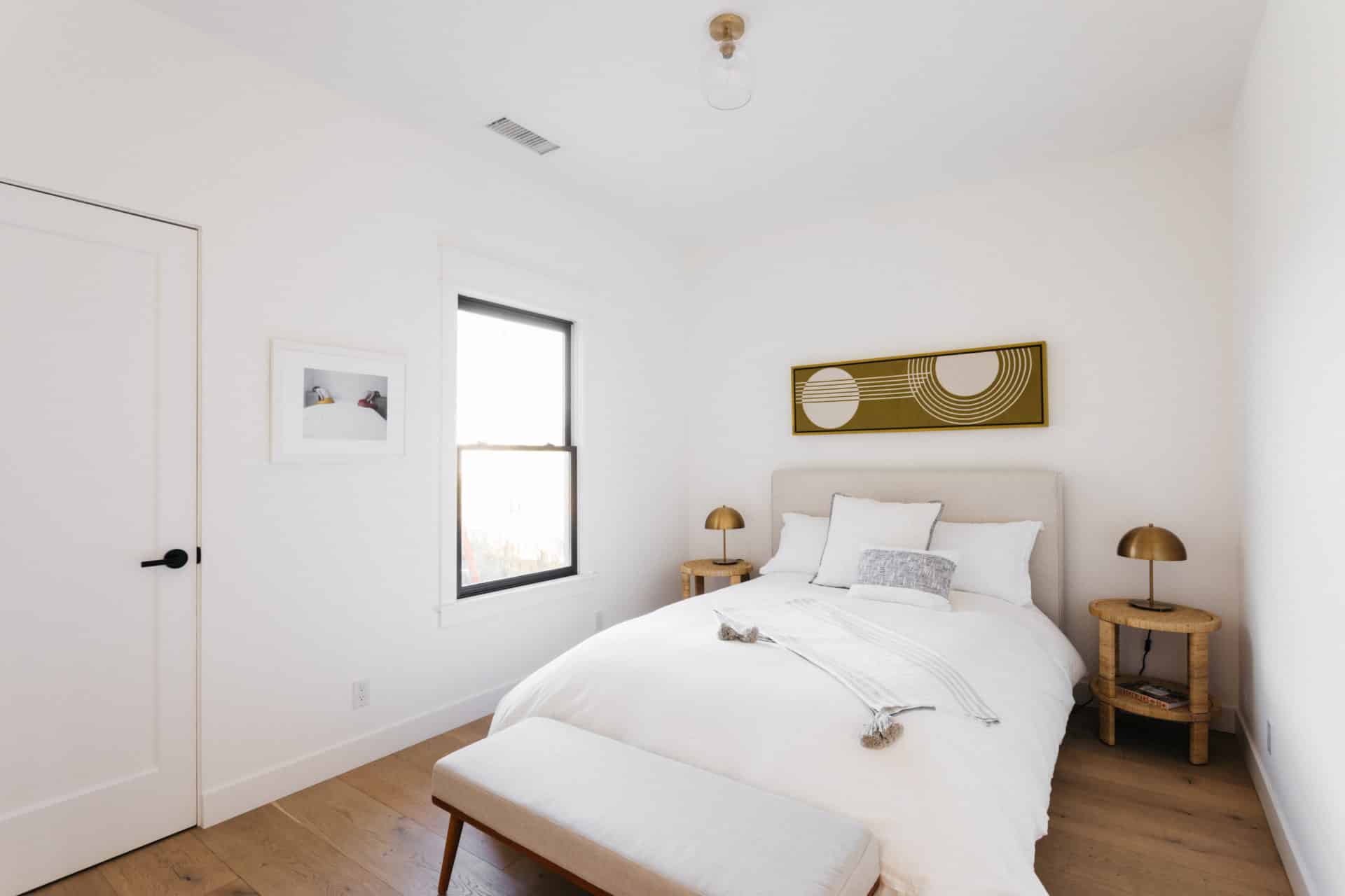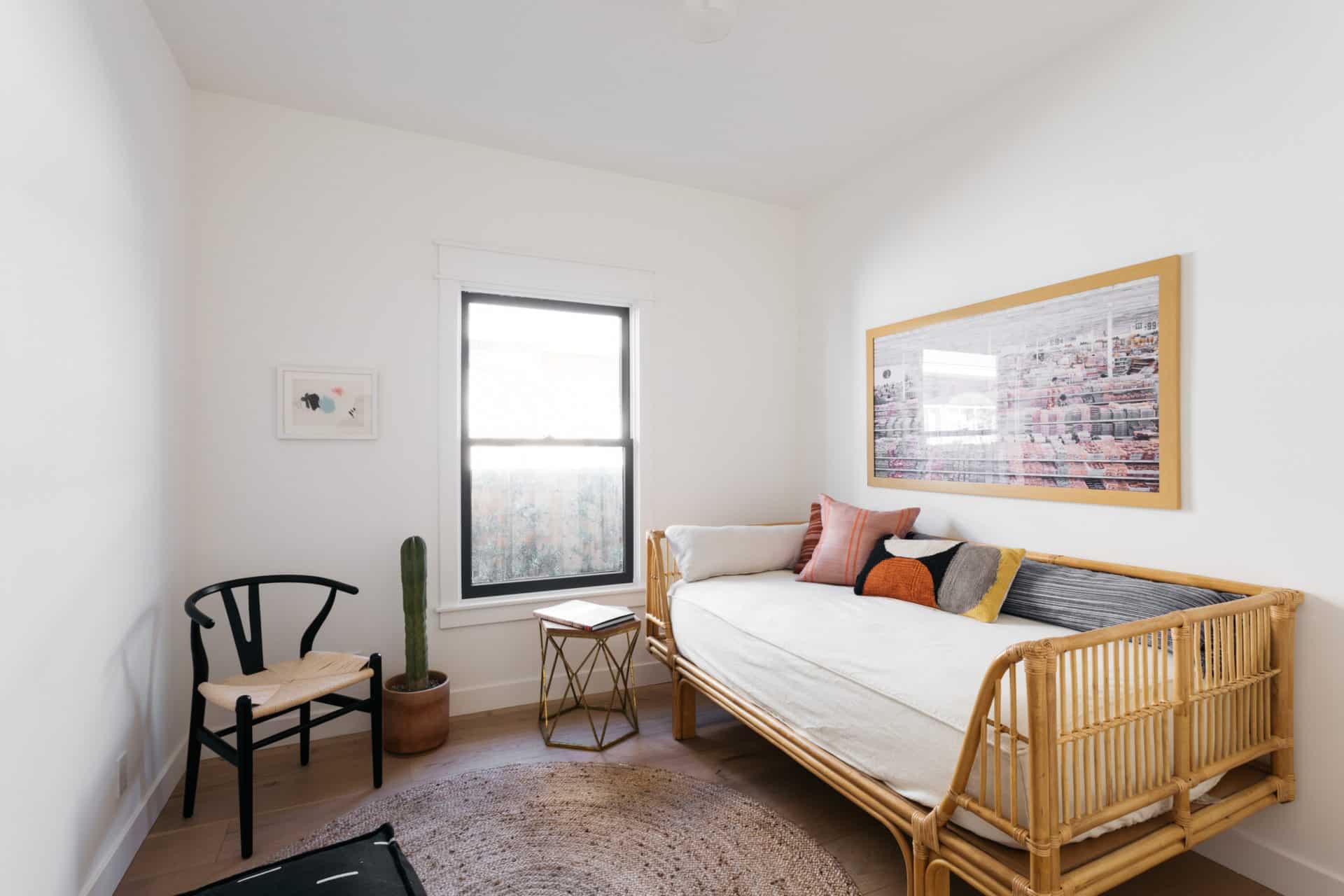 Let the hallway take you to a guest bath featuring a custom vanity with Carrara marble counter and shower/tub. Pass two guest bedrooms on the way to the divine principal suite with vaulted ceilings, a walk-in closet, and French doors leading to the spacious backyard. Find zen in the tadelakt clad walls of the en-suite bath with freestanding soaking tub, open shower with bench, custom white oak dual vanity topped with calacatta marble