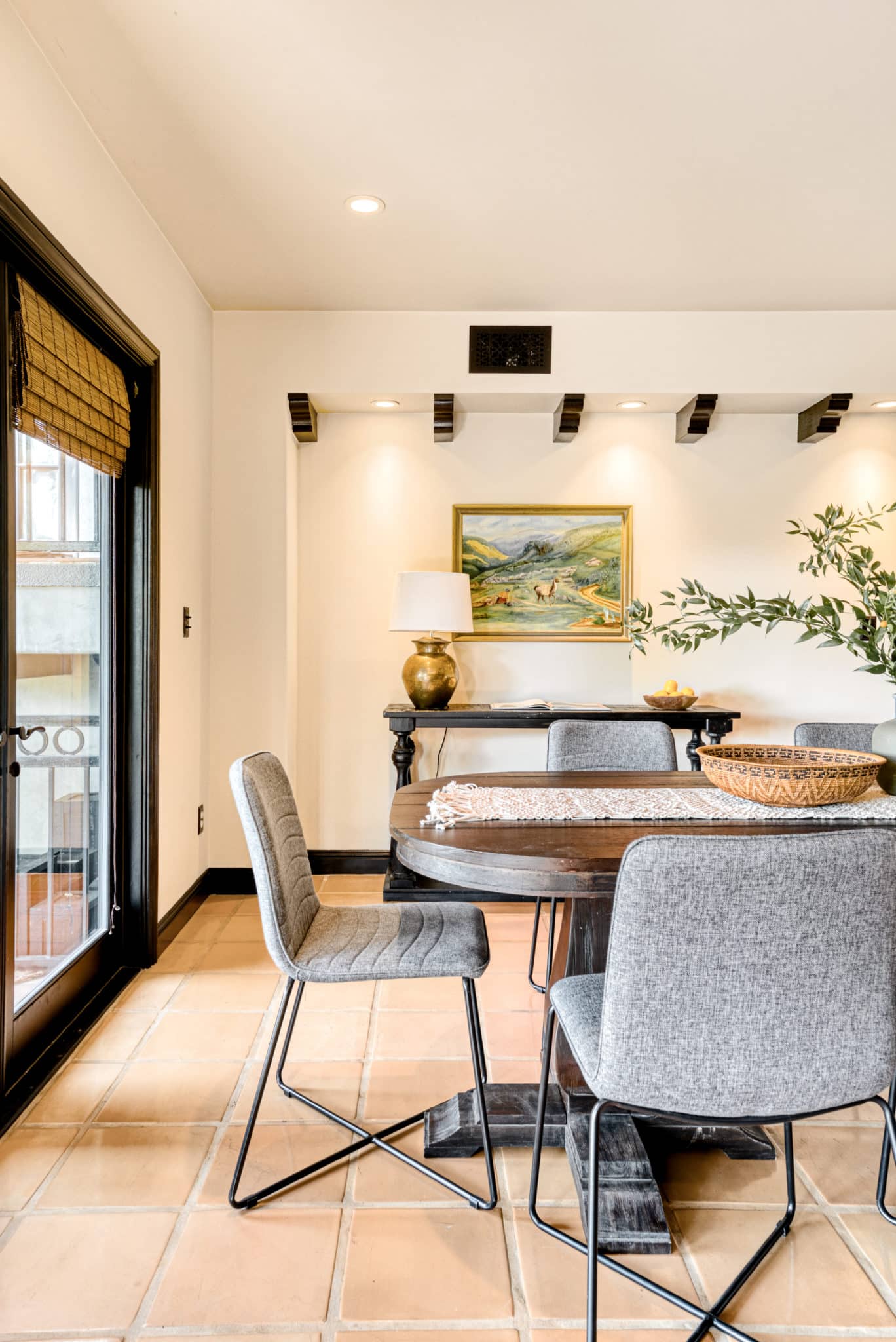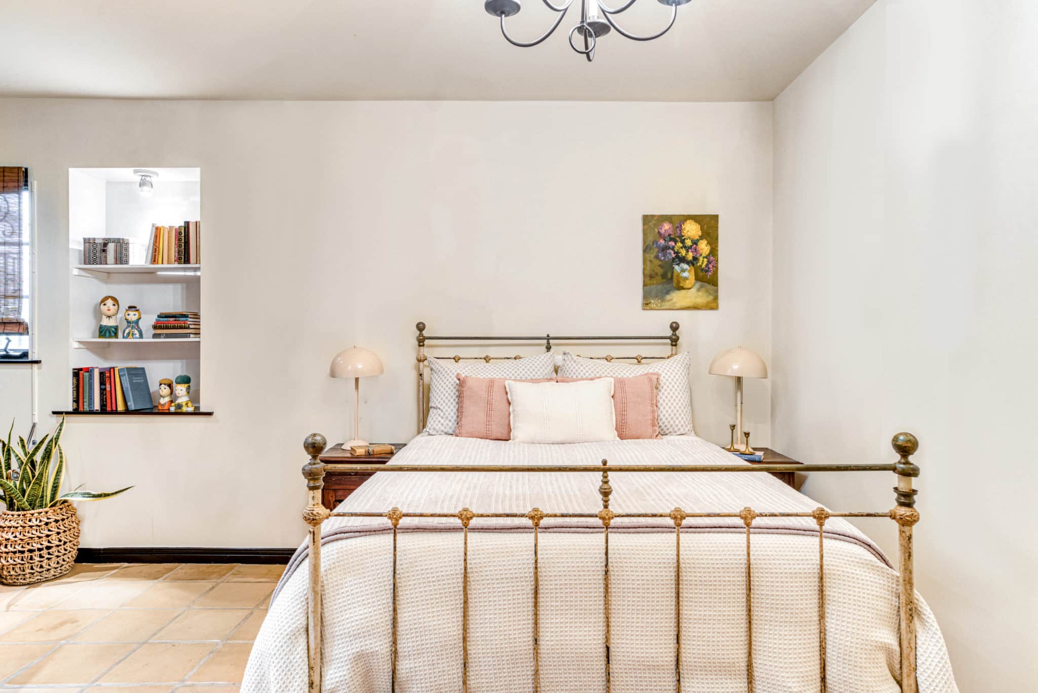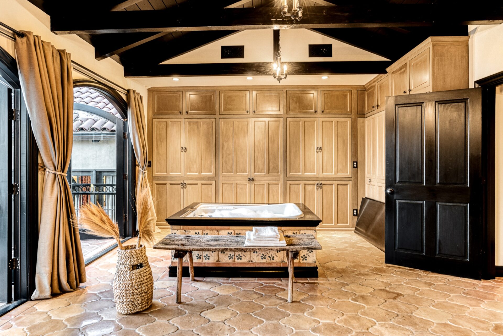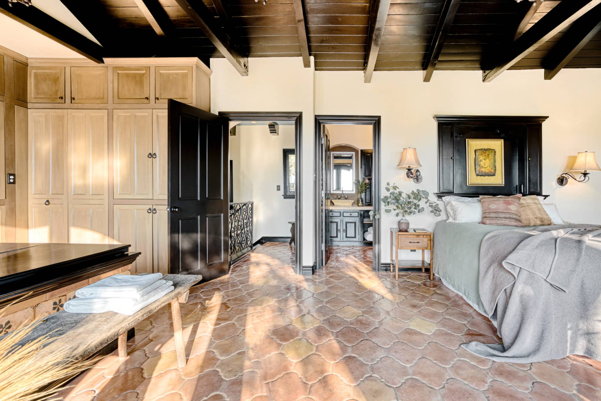 The principal suite located on the top level is a sanctuary of its own, featuring french doors leading to a private balcony, fireplace, an ensuite bathroom with dual vanity, saltillo tile floors, and an in-room spa tub for luxury living. Built-in cabinets and carefully curated lighting adorn the home throughout.