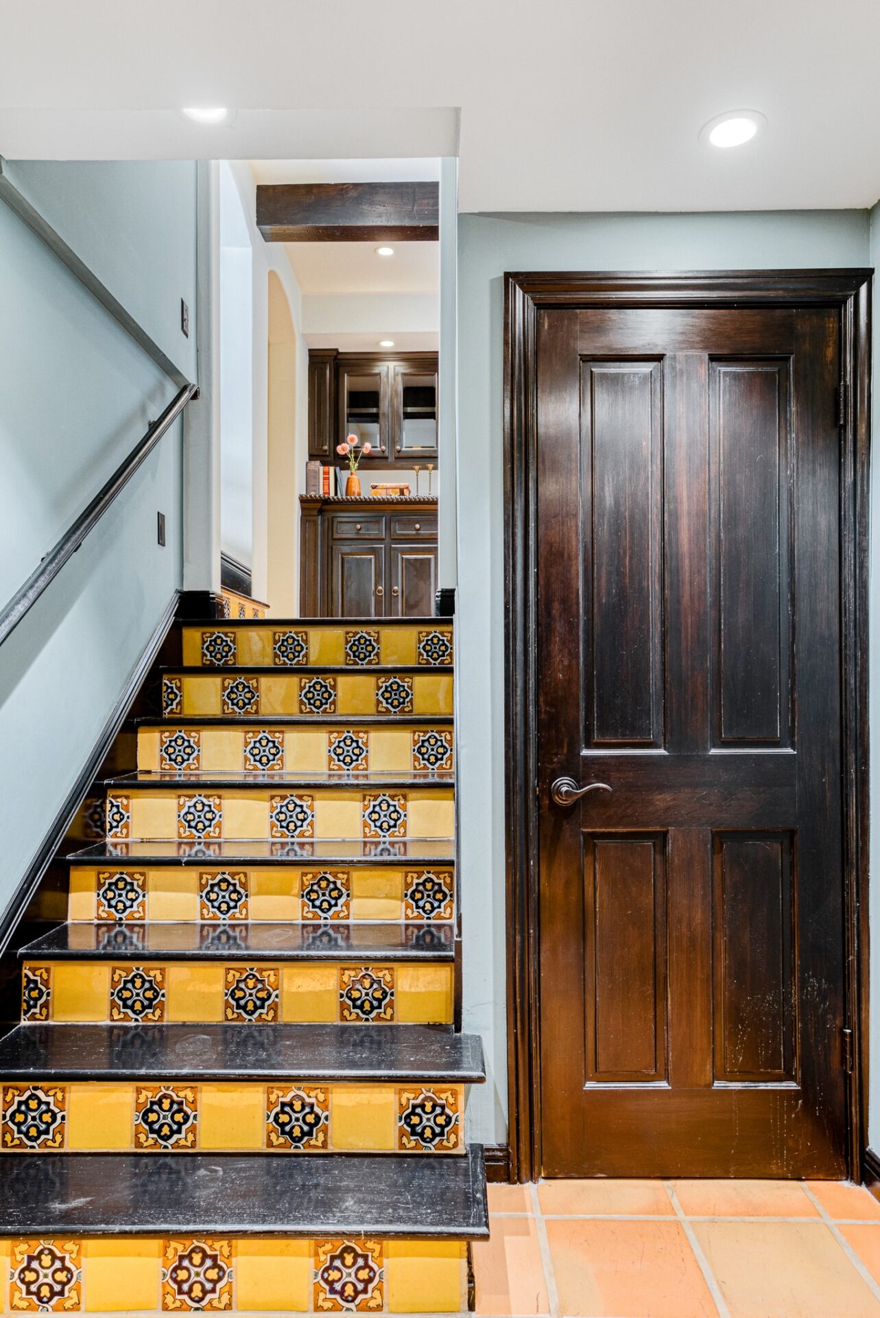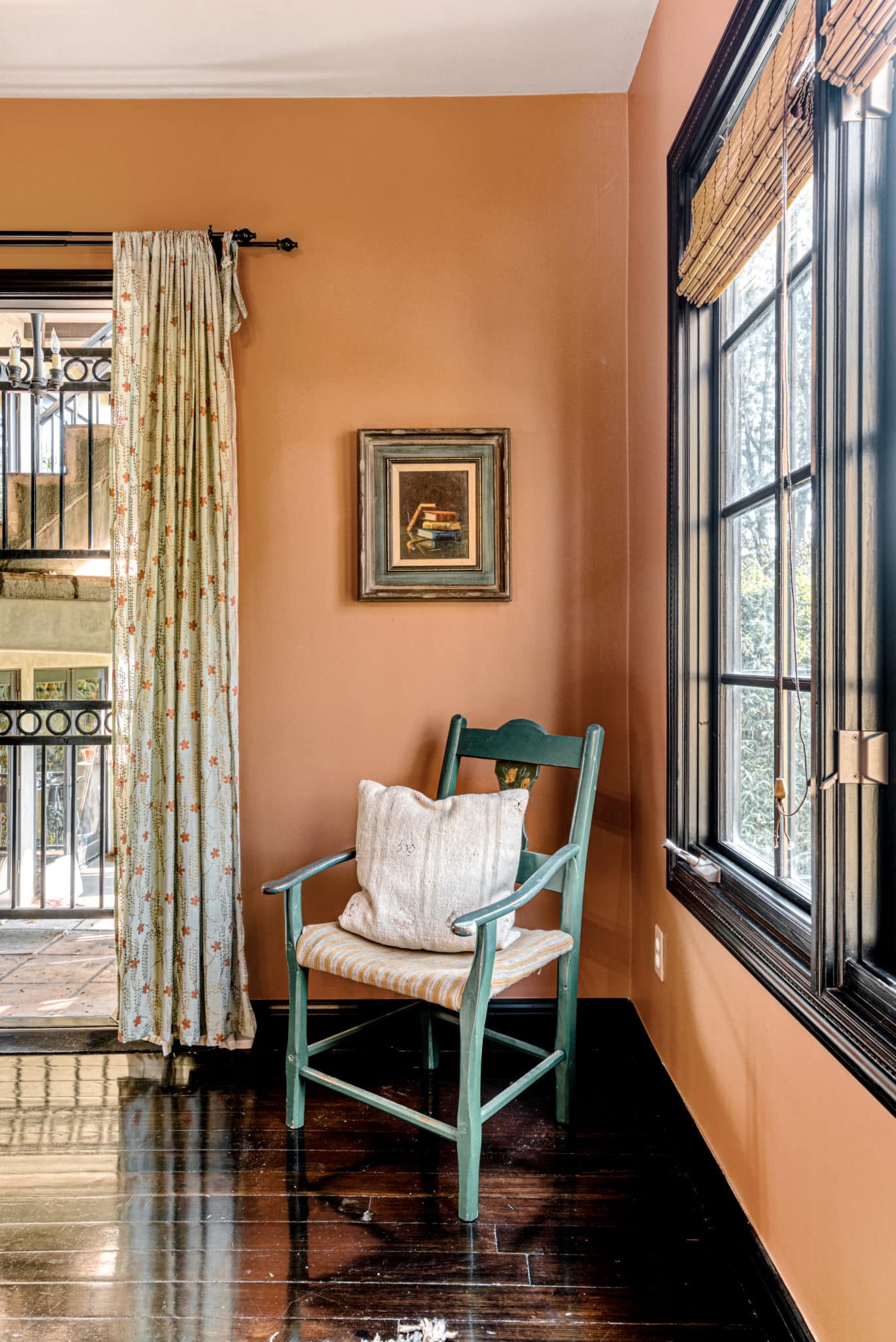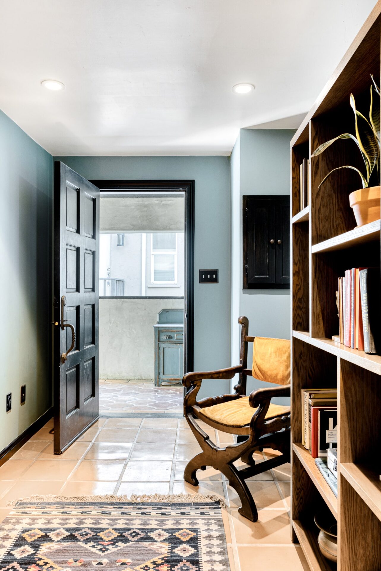 The principal suite located on the top level is a sanctuary of its own, featuring french doors leading to a private balcony, fireplace, an ensuite bathroom with dual vanity, saltillo tile floors, and an in-room spa tub for luxury living. Built-in cabinets and carefully curated lighting adorn the home throughout.