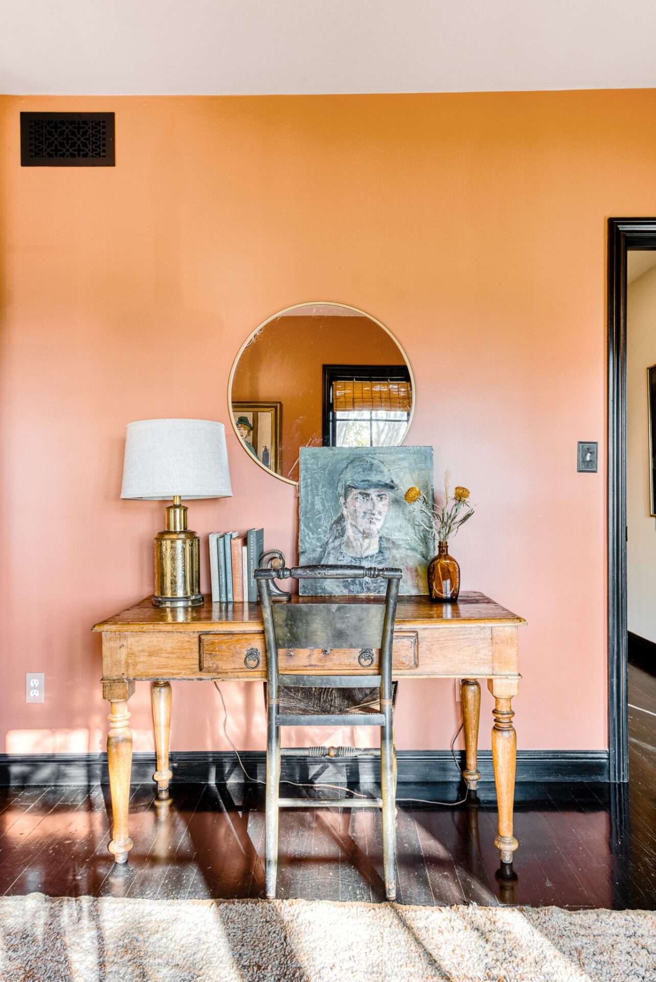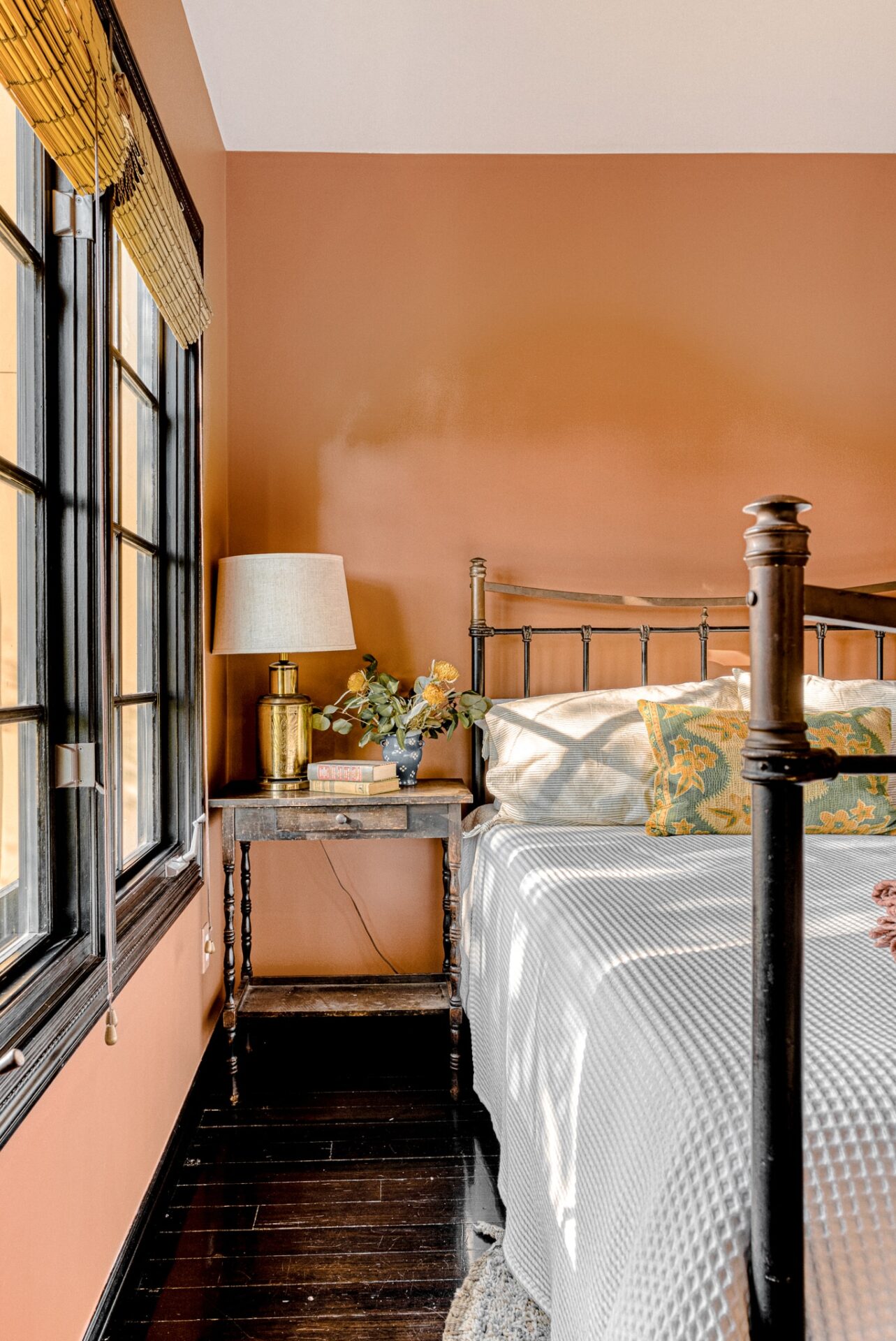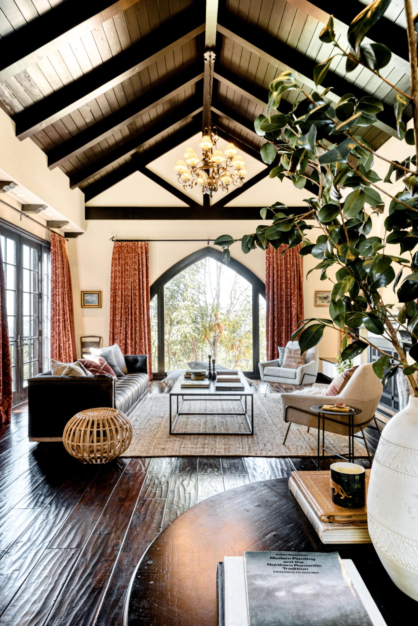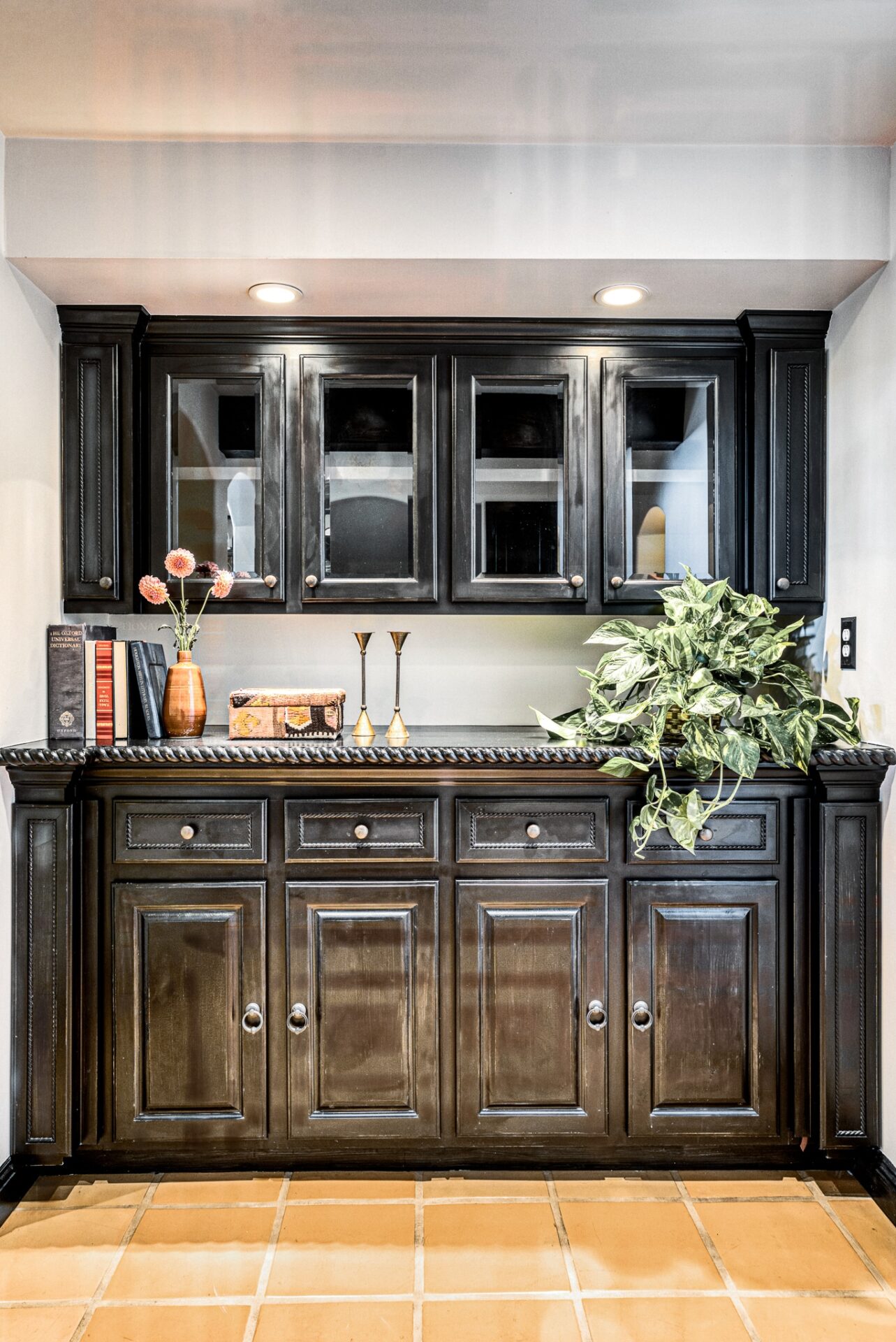 The principal suite located on the top level is a sanctuary of its own, featuring french doors leading to a private balcony, fireplace, an ensuite bathroom with dual vanity, saltillo tile floors, and an in-room spa tub for luxury living. Built-in cabinets and carefully curated lighting adorn the home throughout.