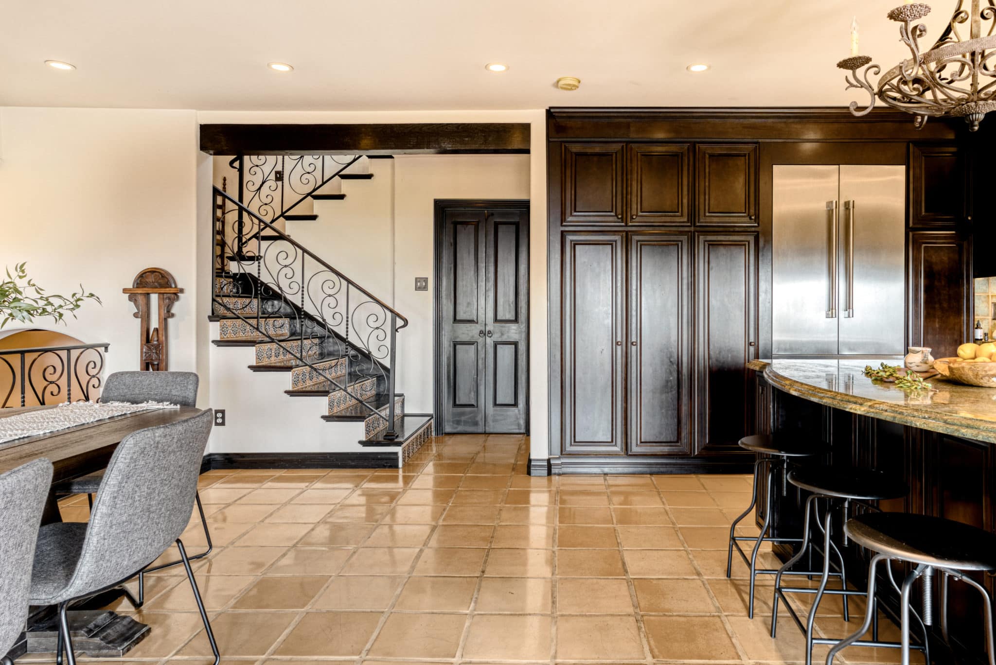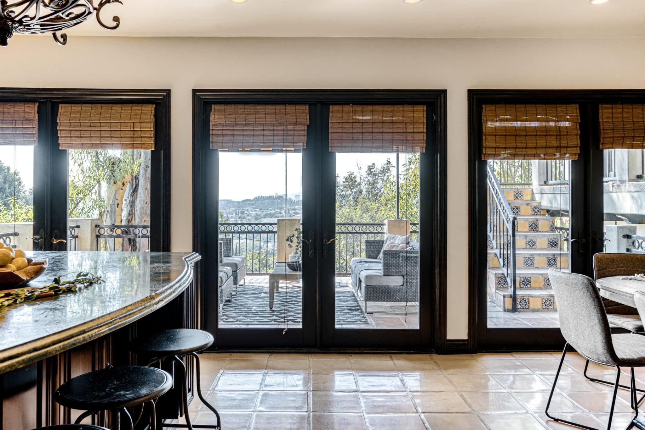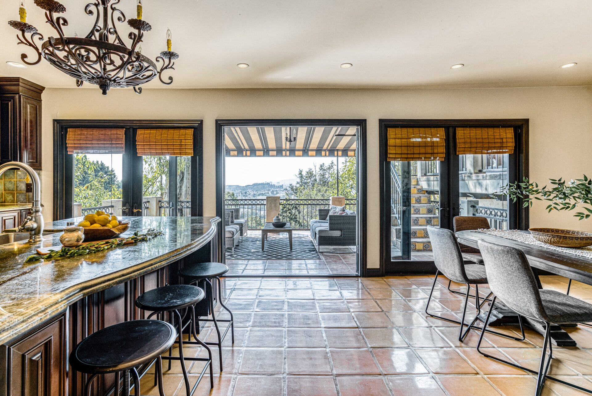 An open concept chef’s kitchen and dining area showcasing cherrywood cabinets, golden lightning granite counters, Thermador appliances, pot filler, warming drawer plus a large island with seating for 3 invite you to entertain. A powder room plus a large laundry area provides access to the garage. Multiple french doors off the kitchen lead to the expansive deck and the most magical views LA has to offer.
