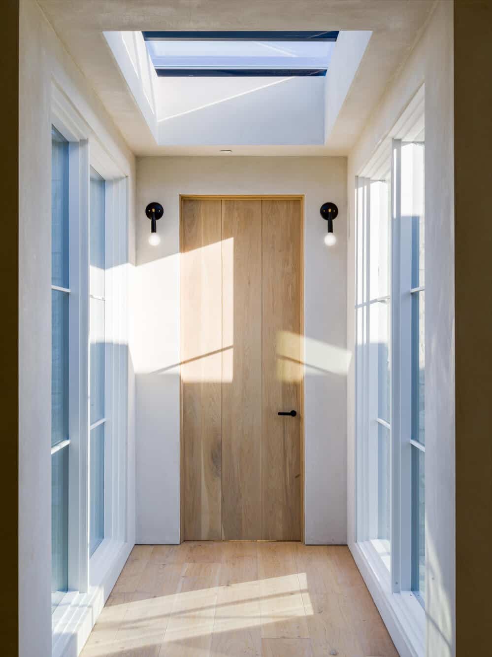 Huge glass doorway opens into a stone entry with built-in nook for coats and bags. What a dream.