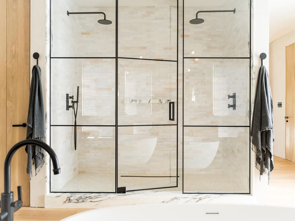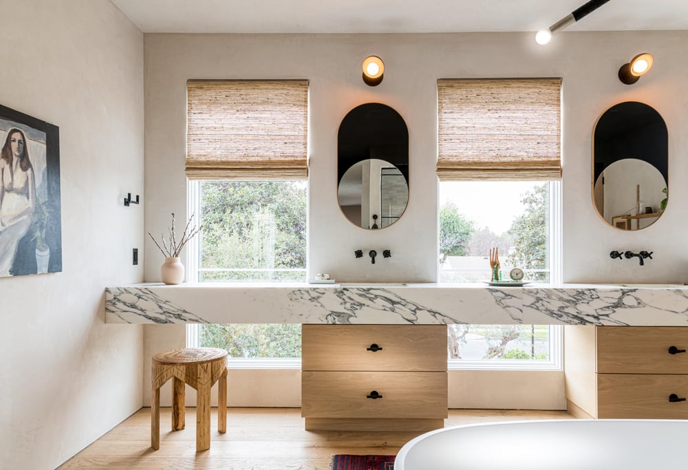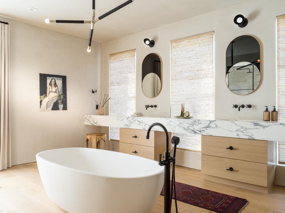 Home features 4 stunning bedrooms, including an expansive primary suite with a magazine-worthy bathroom boasting a soaking tub, huge glass-enclosed shower lined in marble and featuring Clé tile within. Plus, double vanity with Bower Studio mirrors offers a wall of marbled counter space. Truly superb.