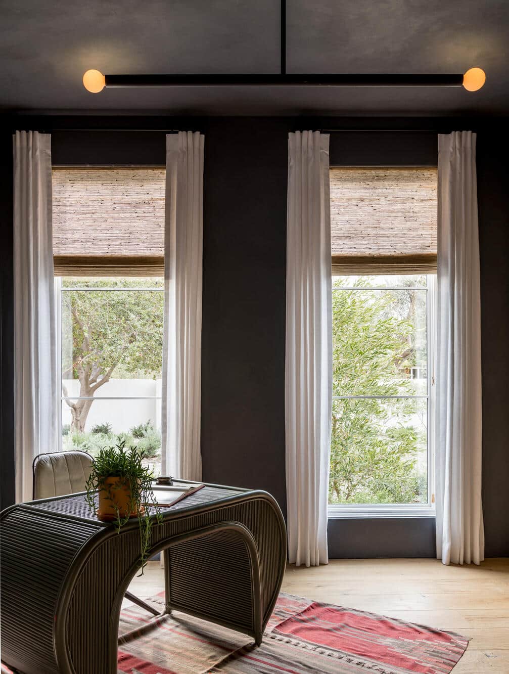 Fabulous dining room with a Clayworks plaster wall + stunning brass light fixture truly makes a statement. Glass double doors open out to the backyard, making for incredible indoor-outdoor flow.