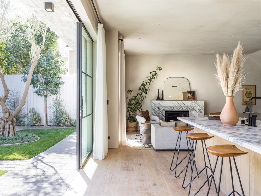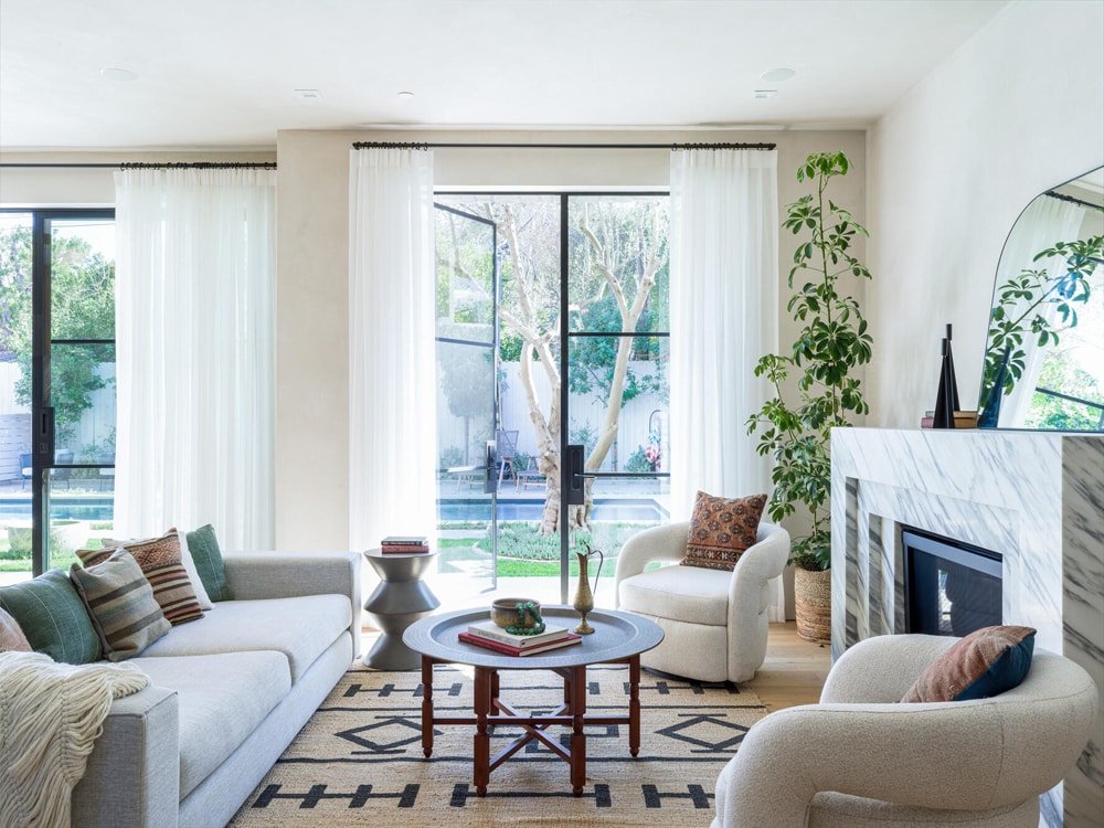 Bright living room with gorgeous fireplace framed by Arabescato Calacatta marble.