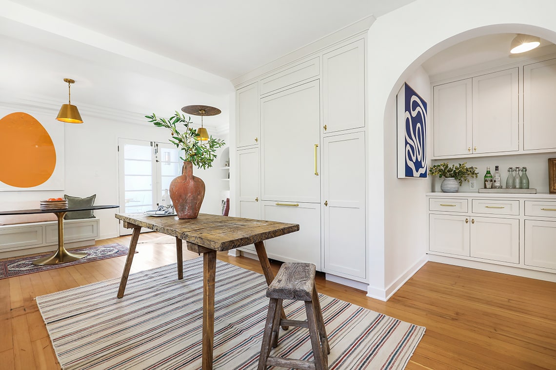 The new farmhouse kitchen is like out of a magazine. Gorgeous cabinetry, new appliances, pantry & built-in banquette. I also love the ceiling-height backsplash, open shelving and well curated light fixtures. French doors lead to the outdoor dining patio.