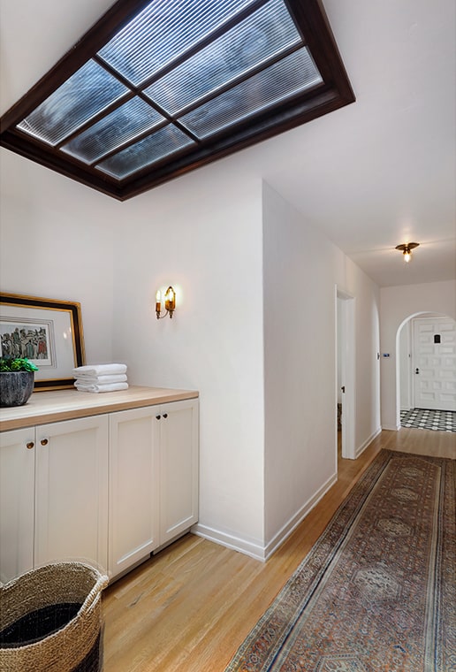 Lovely center hallway with skylight + built-ins.