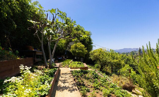 Currently tiered and terraced, the yard is a verdant oasis with pockets for lounging and planters perfect for growing herbs and veggies. The sloping yard has tons of potential – how great would an infinity pool be?!