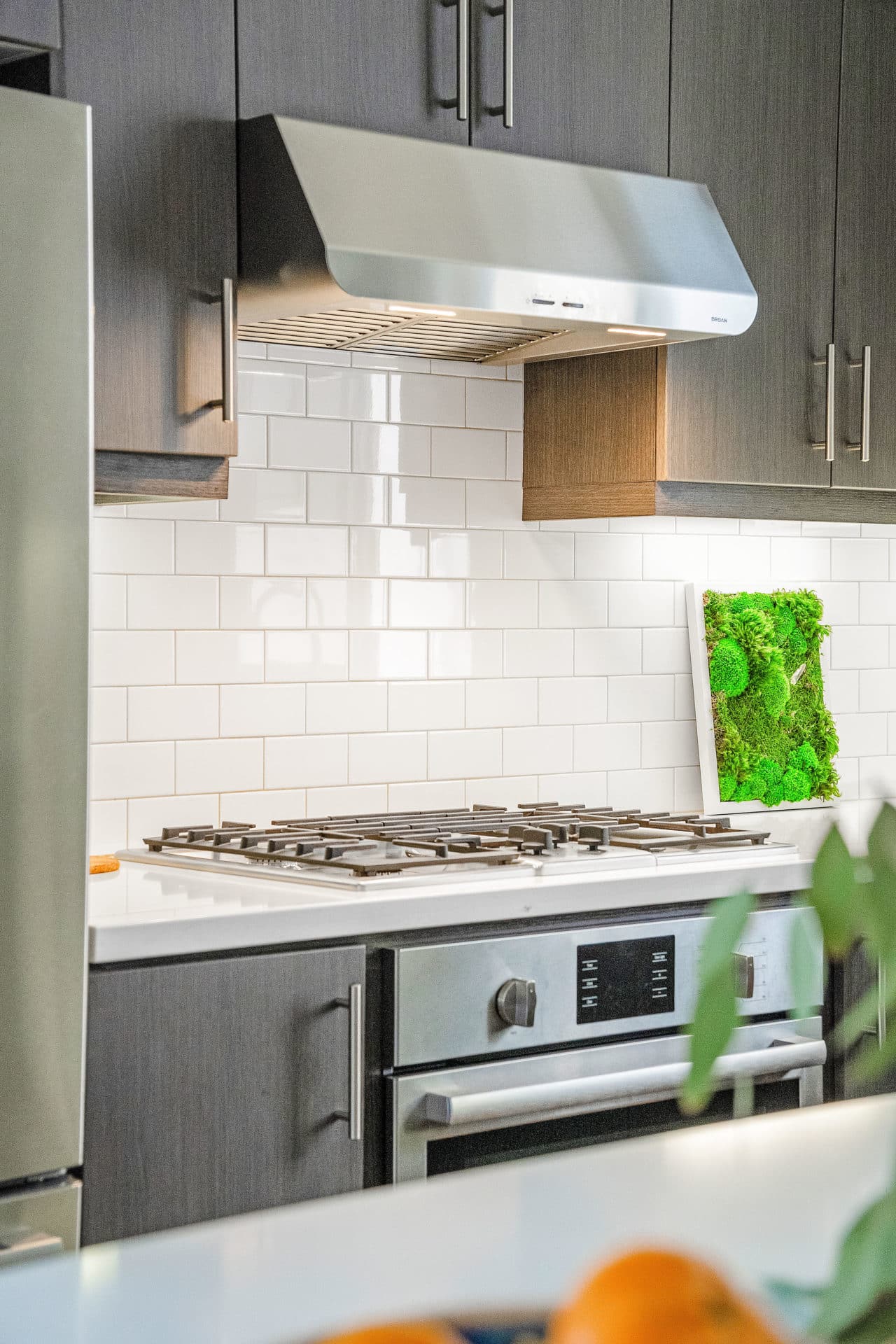 Dreamy Quartz countertops provide ample food prep and serving space at the eat-in island.