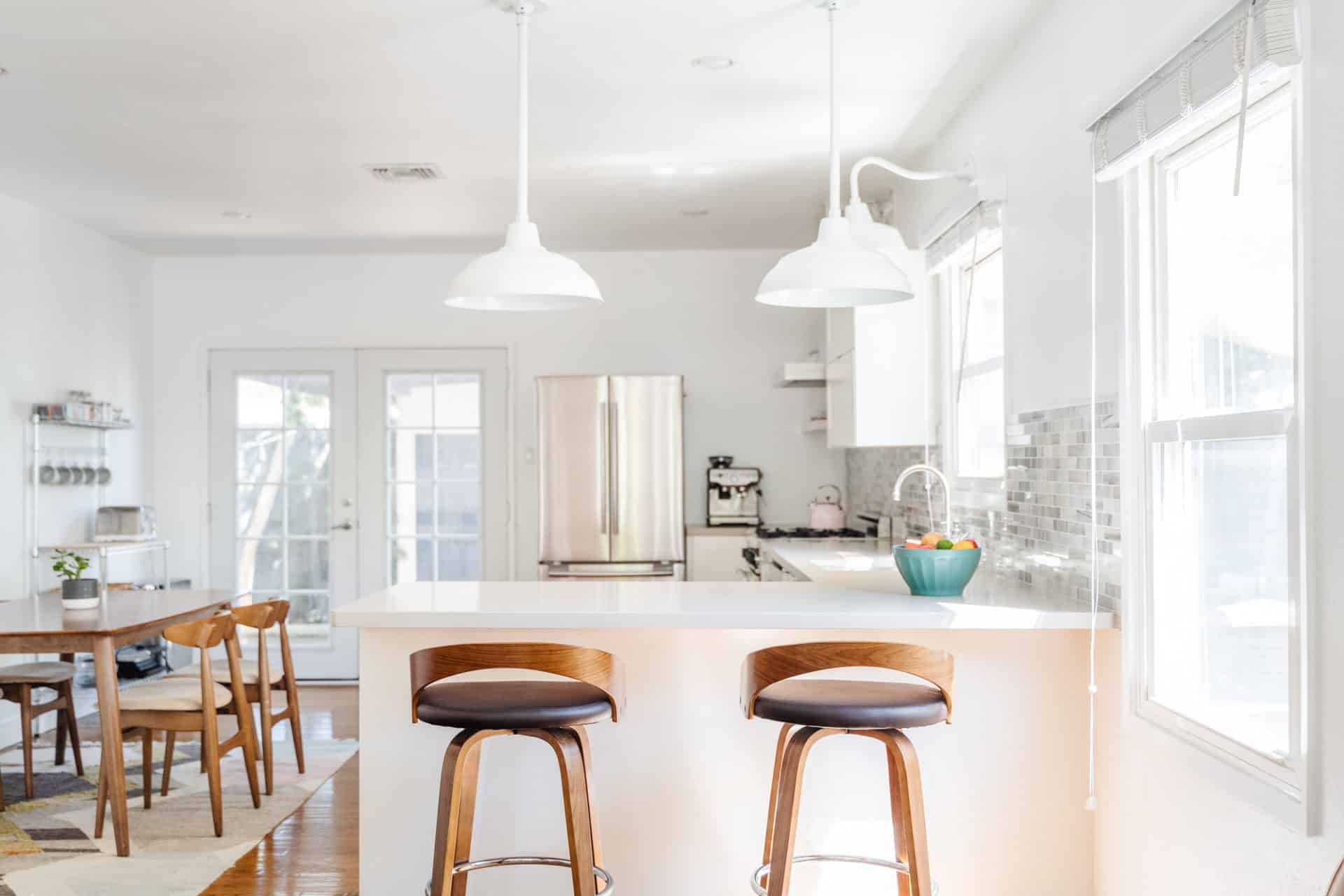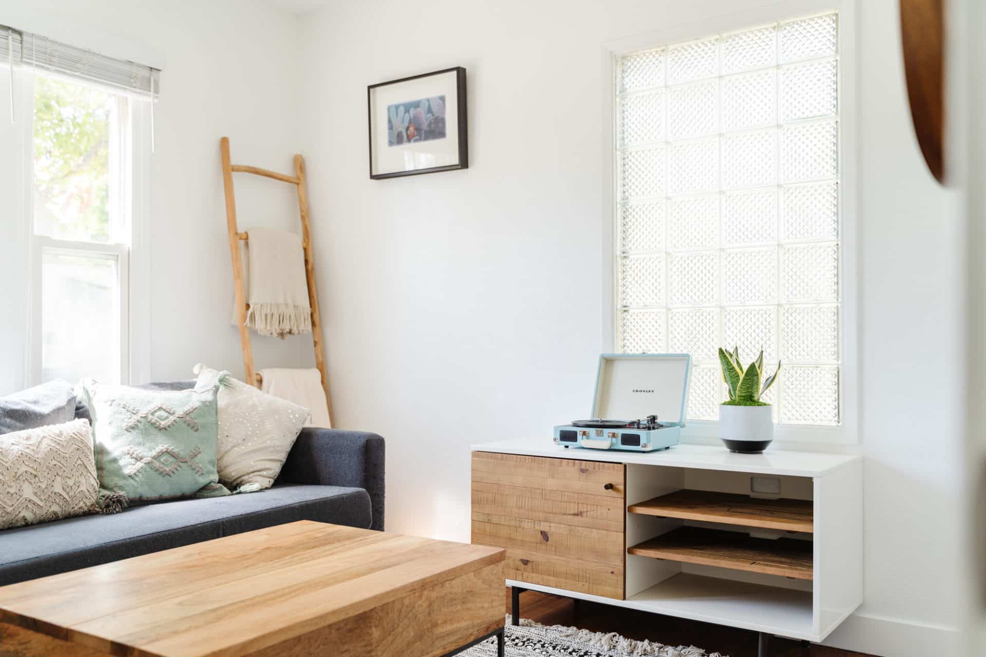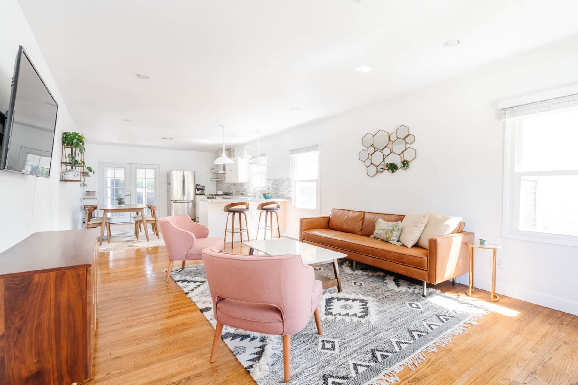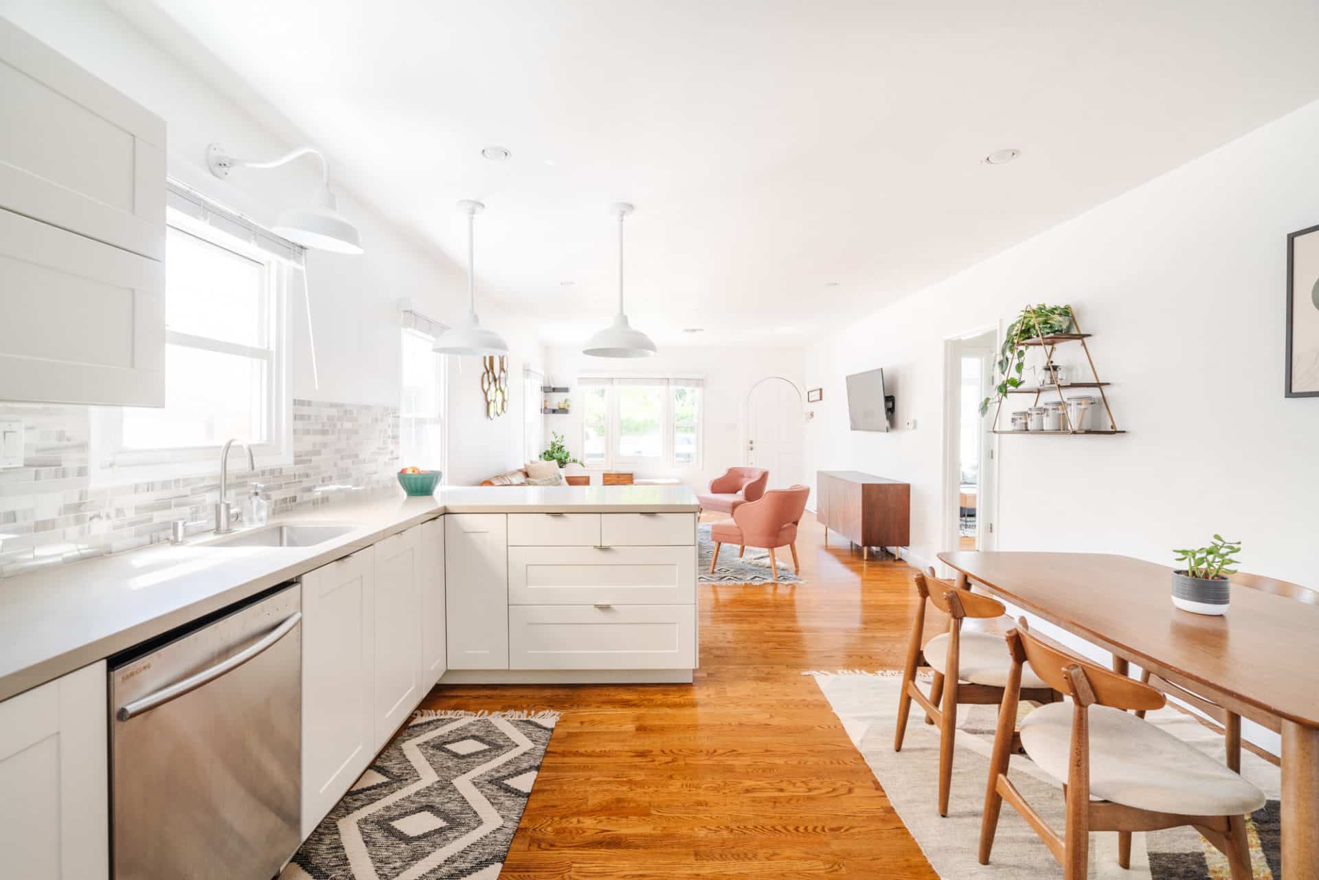 Sunlight pours into the living room, which opens to a renovated kitchen, boasting quartz counters, bright cabinets, tile backsplash + stainless steel appliances.