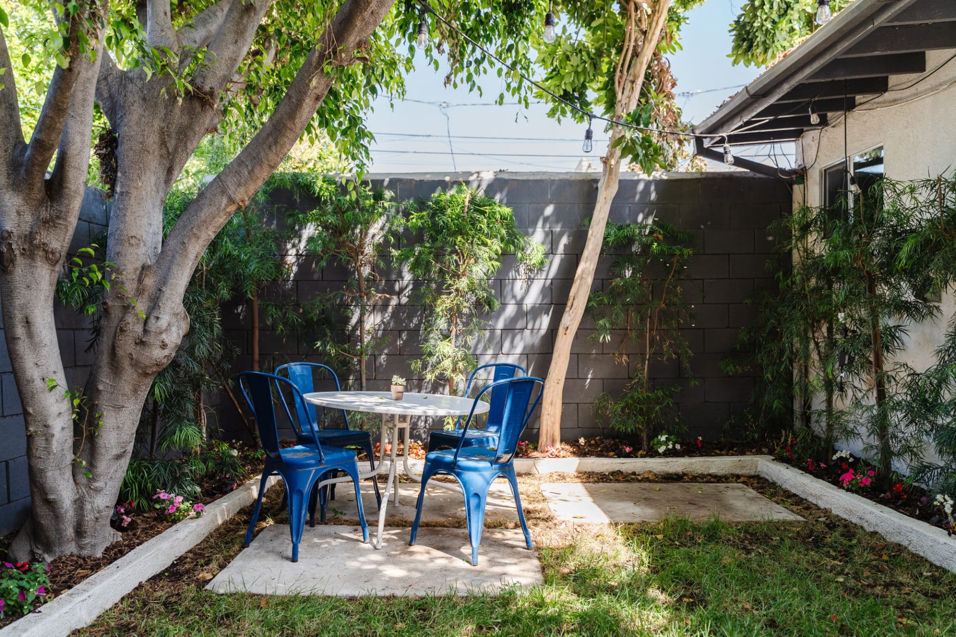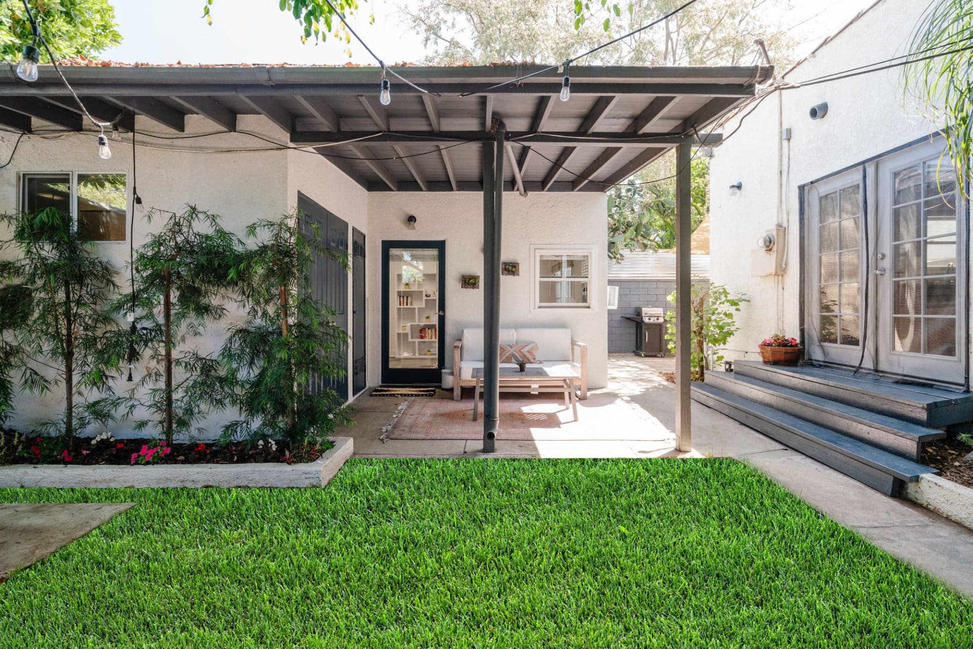 Step outside through french doors off the kitchen into a private green yard, W/D closet, and converted garage — a perfect overflow space featuring concrete floors, renovated bath w/clawfoot tub, and built-in storage.