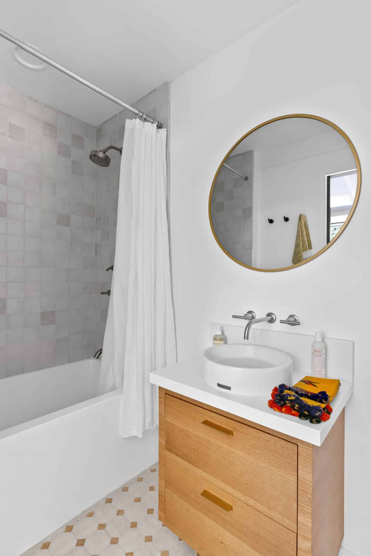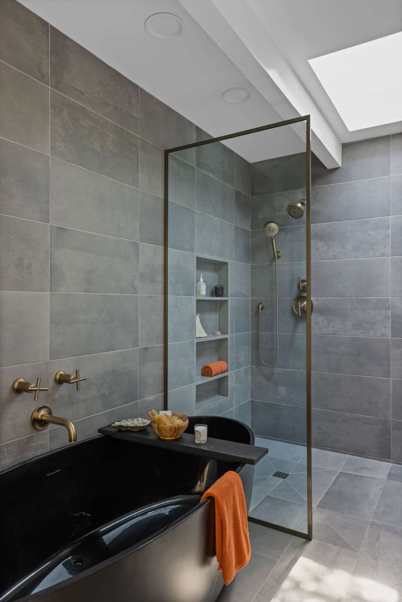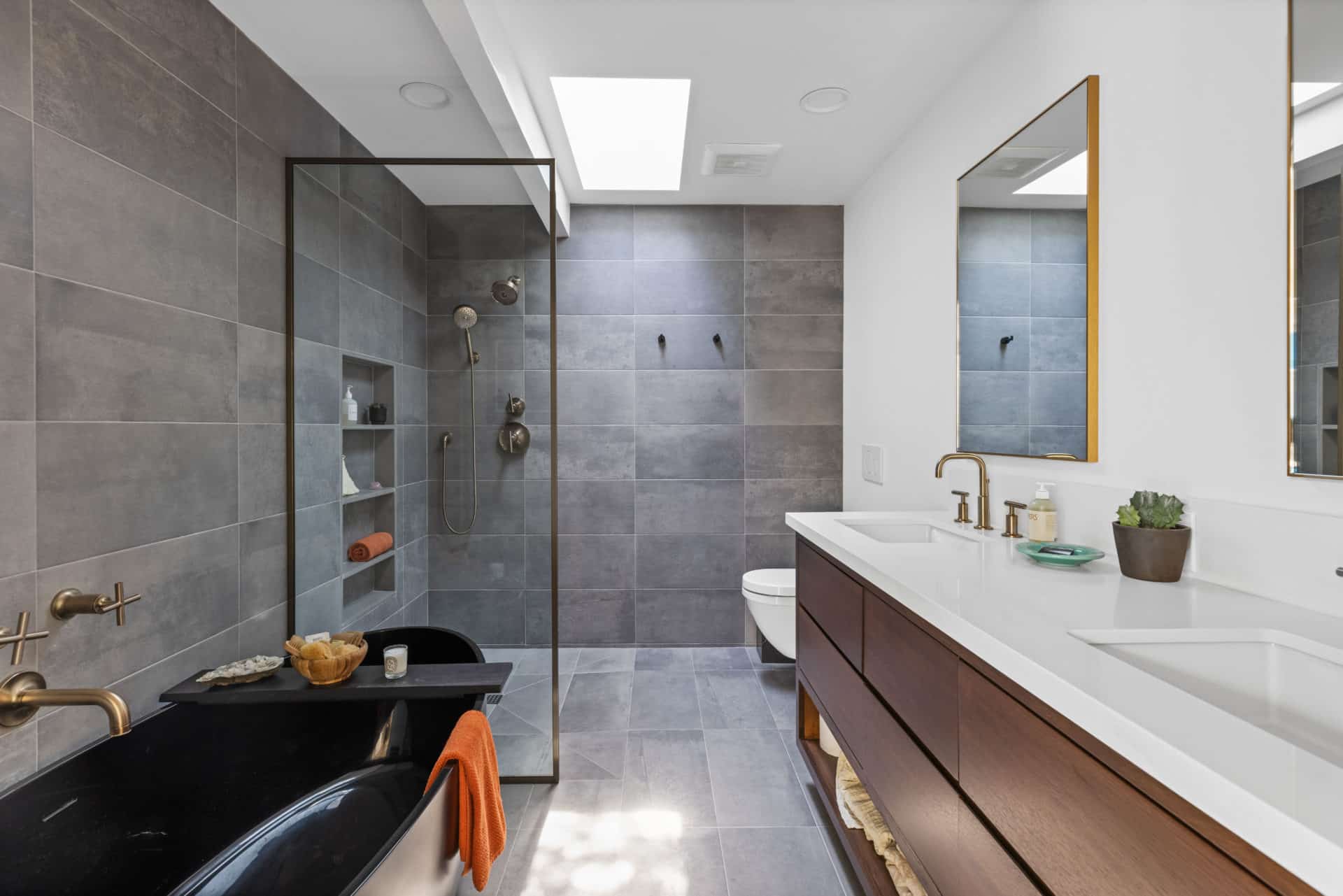 Brand new master bath with Lusso free-standing tub, concrete tiles, and double sinks.