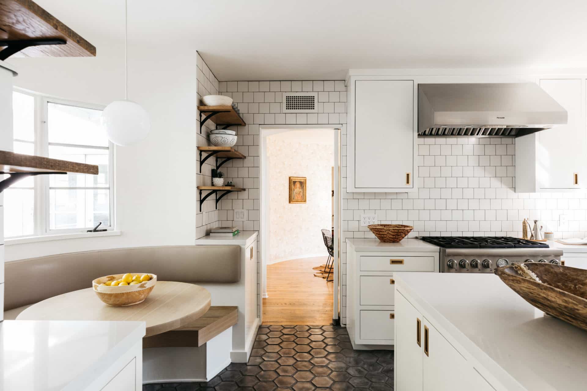 Enter a formal domed entry leading to the unique, oval formal dining room & chef’s kitchen with built-in banquette, brushed gold Waterstone faucet, large farm sink & Thermador gas Range.