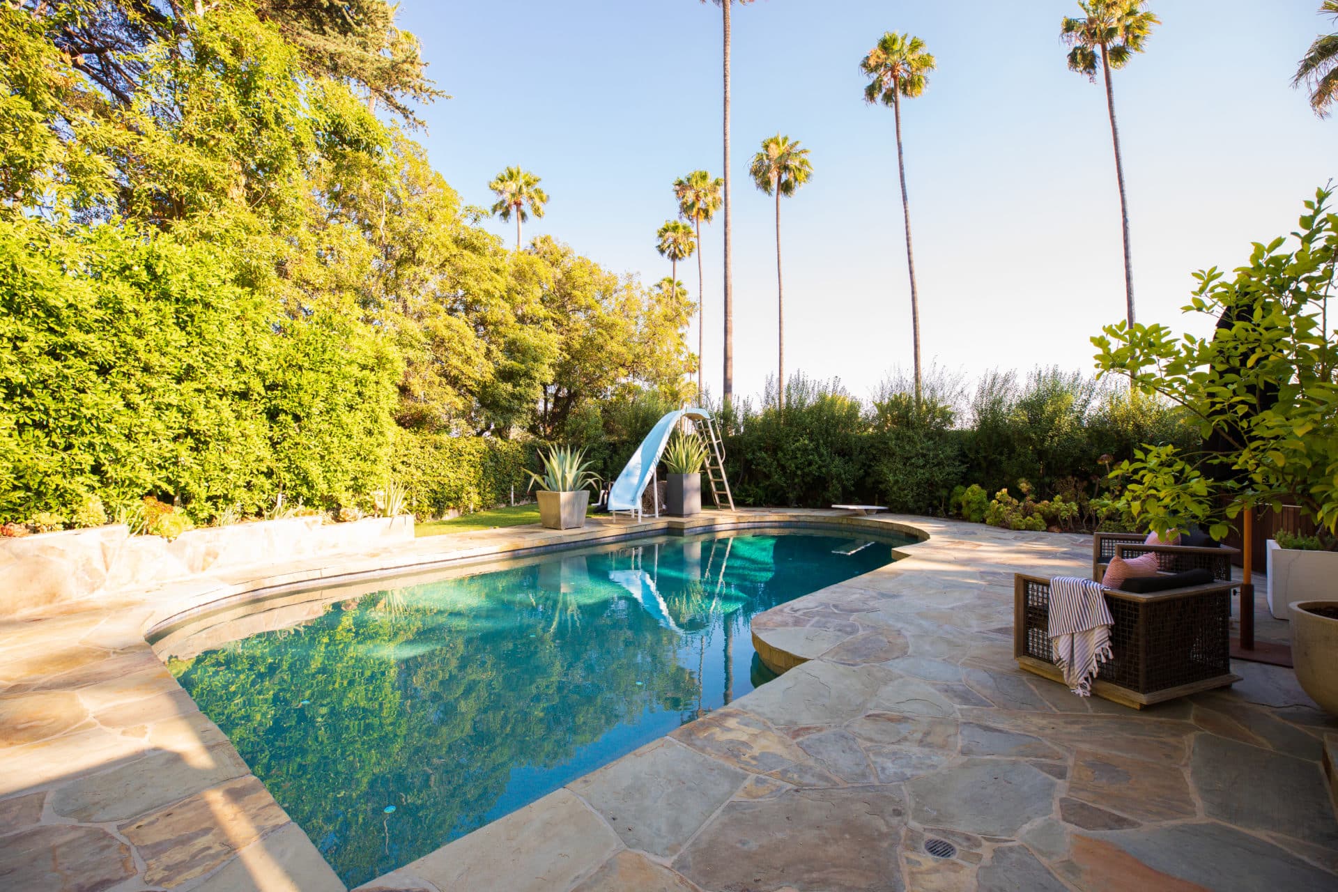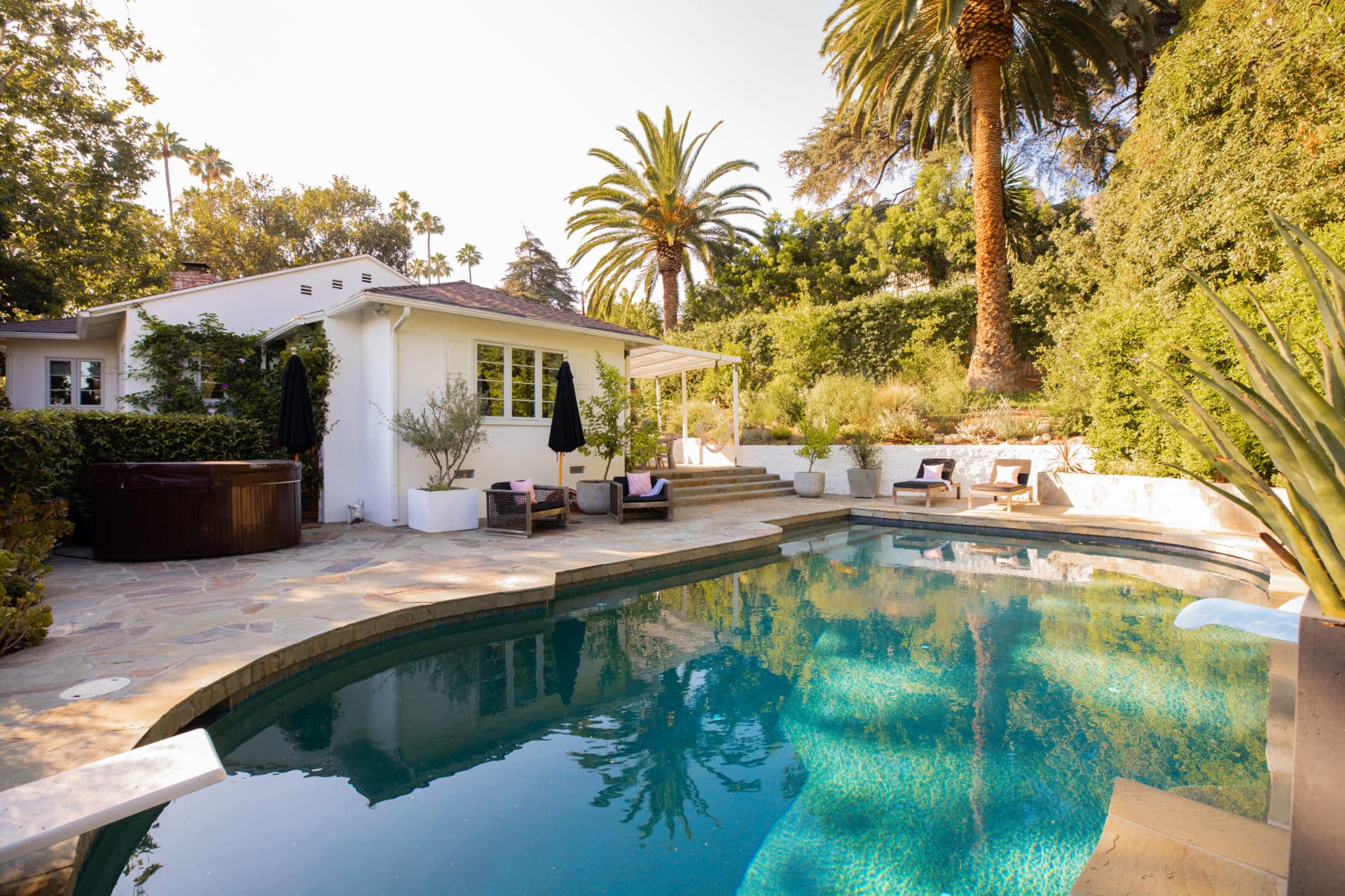Master Retreat & large second bedroom both open to patio w/pergola, yard w/CA Native landscaping, fruit trees, huge salt water pool, palm tree views & hot tub.