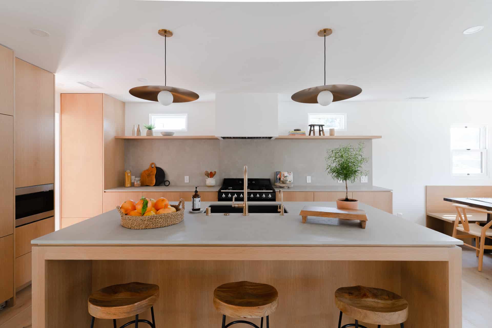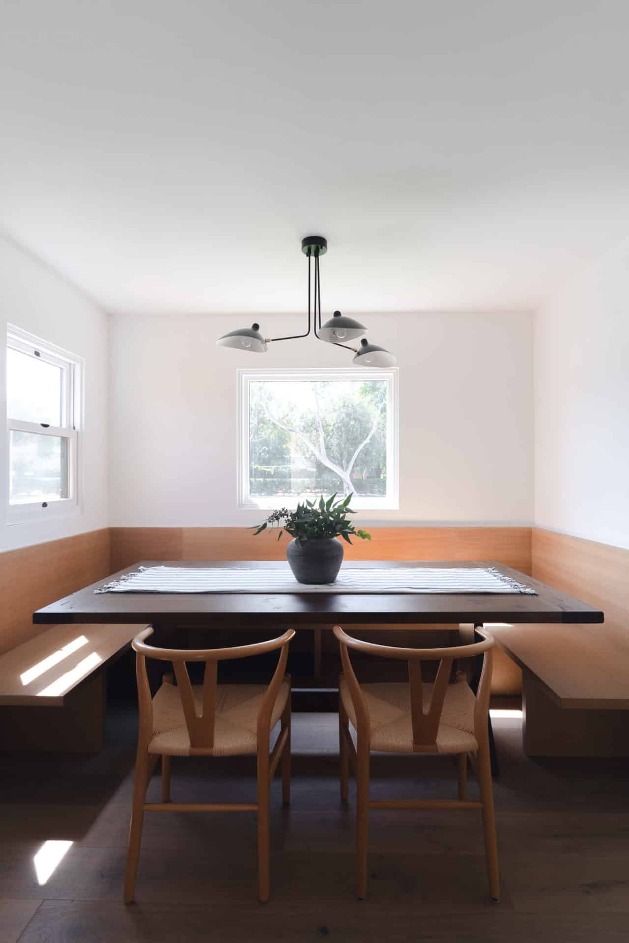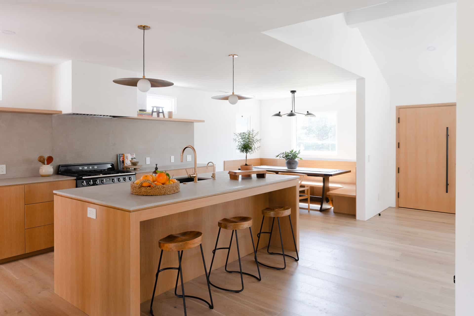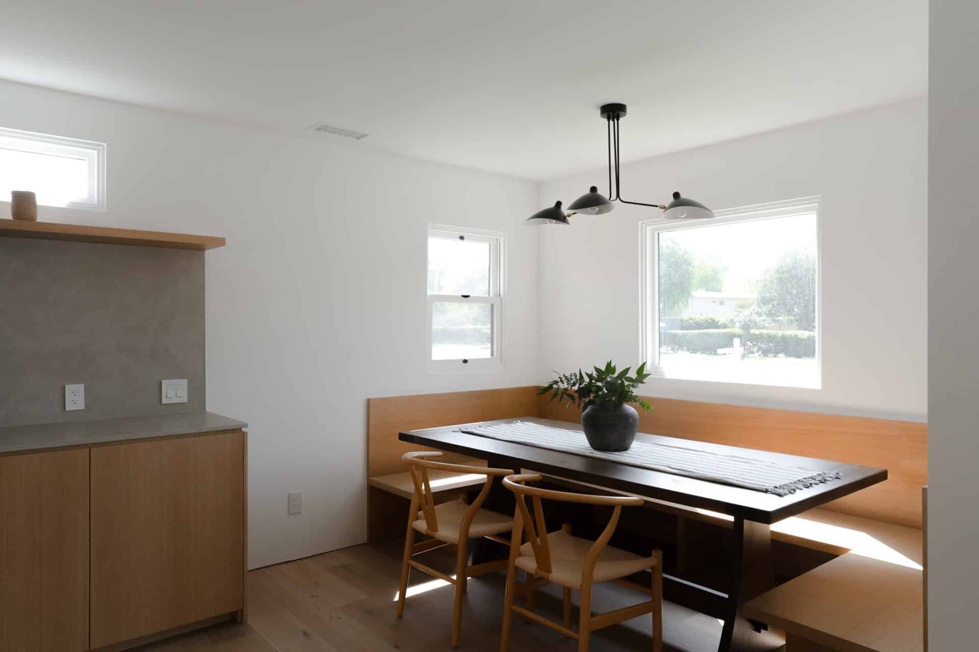 The chef’s kitchen is a content creator’s dream featuring custom cabinetry wrapped in limestone counters and top of the line appliances. A Dwell-worthy built-in banquette offers the perfect place for a morning meetup, or dine al fresco at the private outdoor space off of the kitchen complete with an herb garden.
