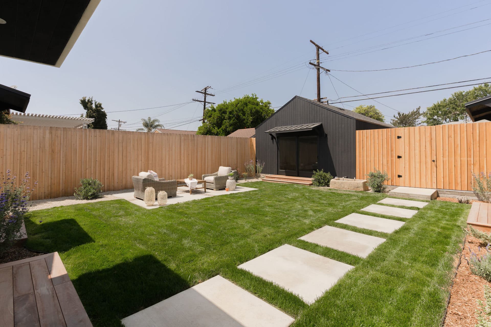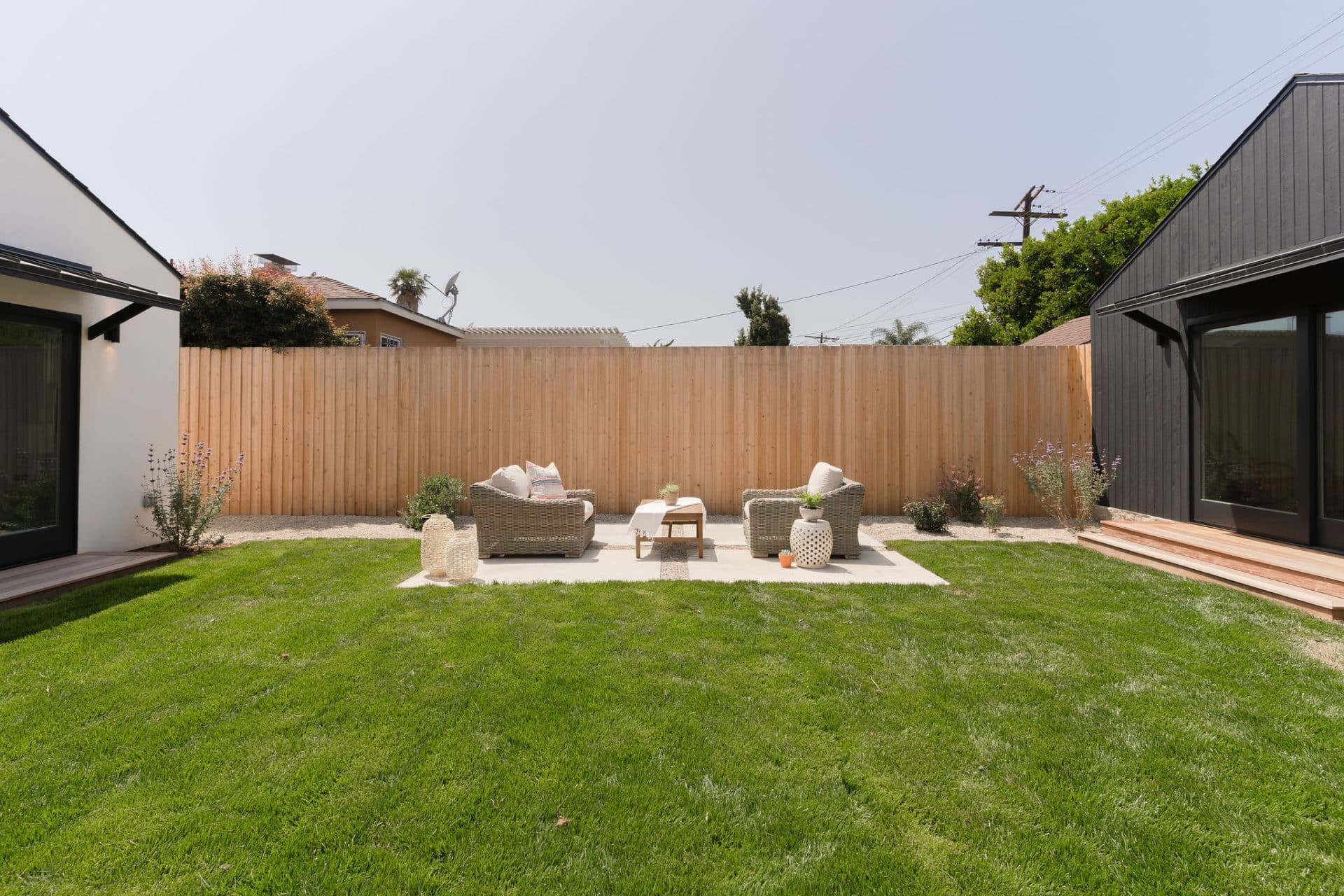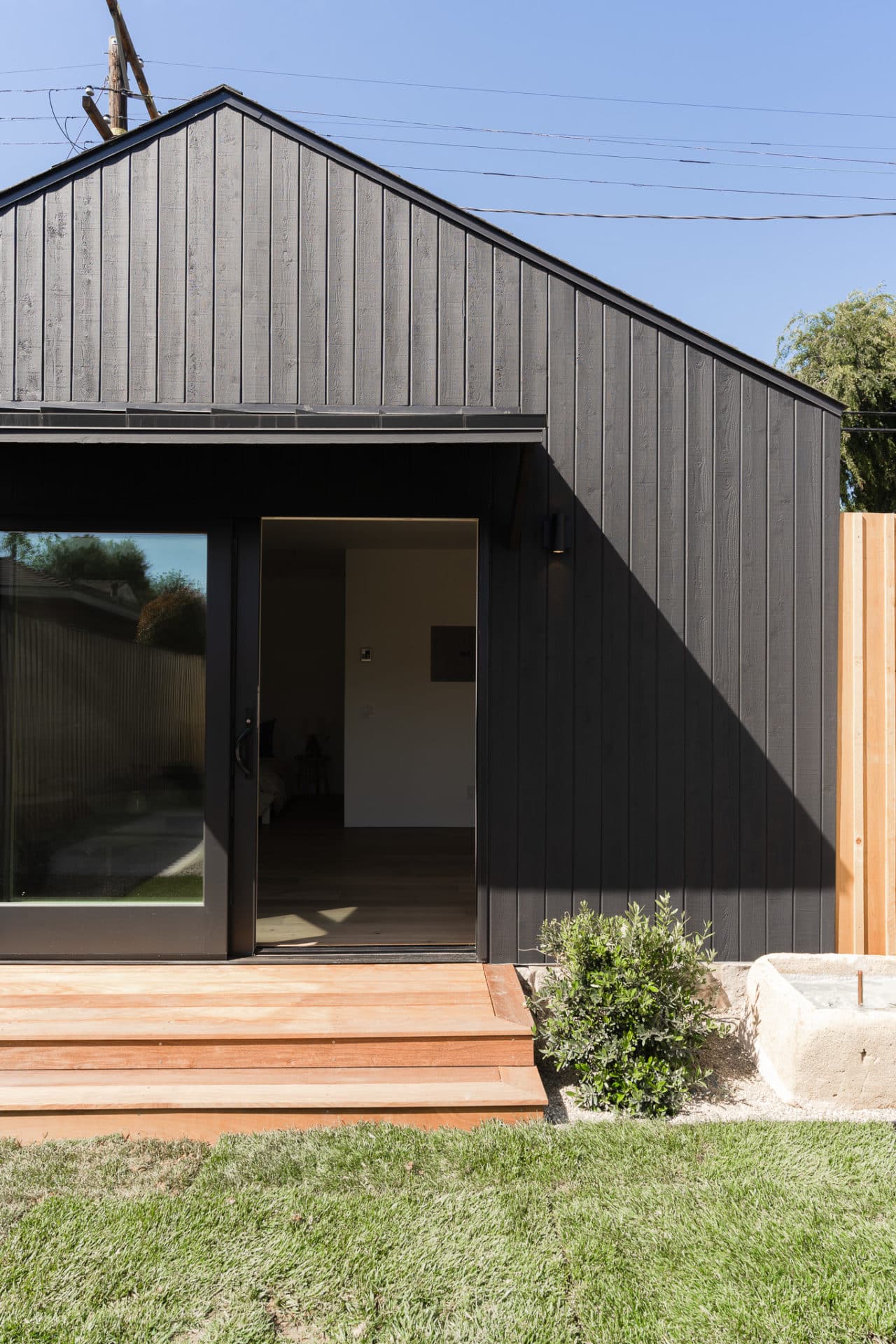 Across the yard, the guest house dressed in blackened redwood cedar cladding offers the perfect contrast to the smooth stuccoed main.
