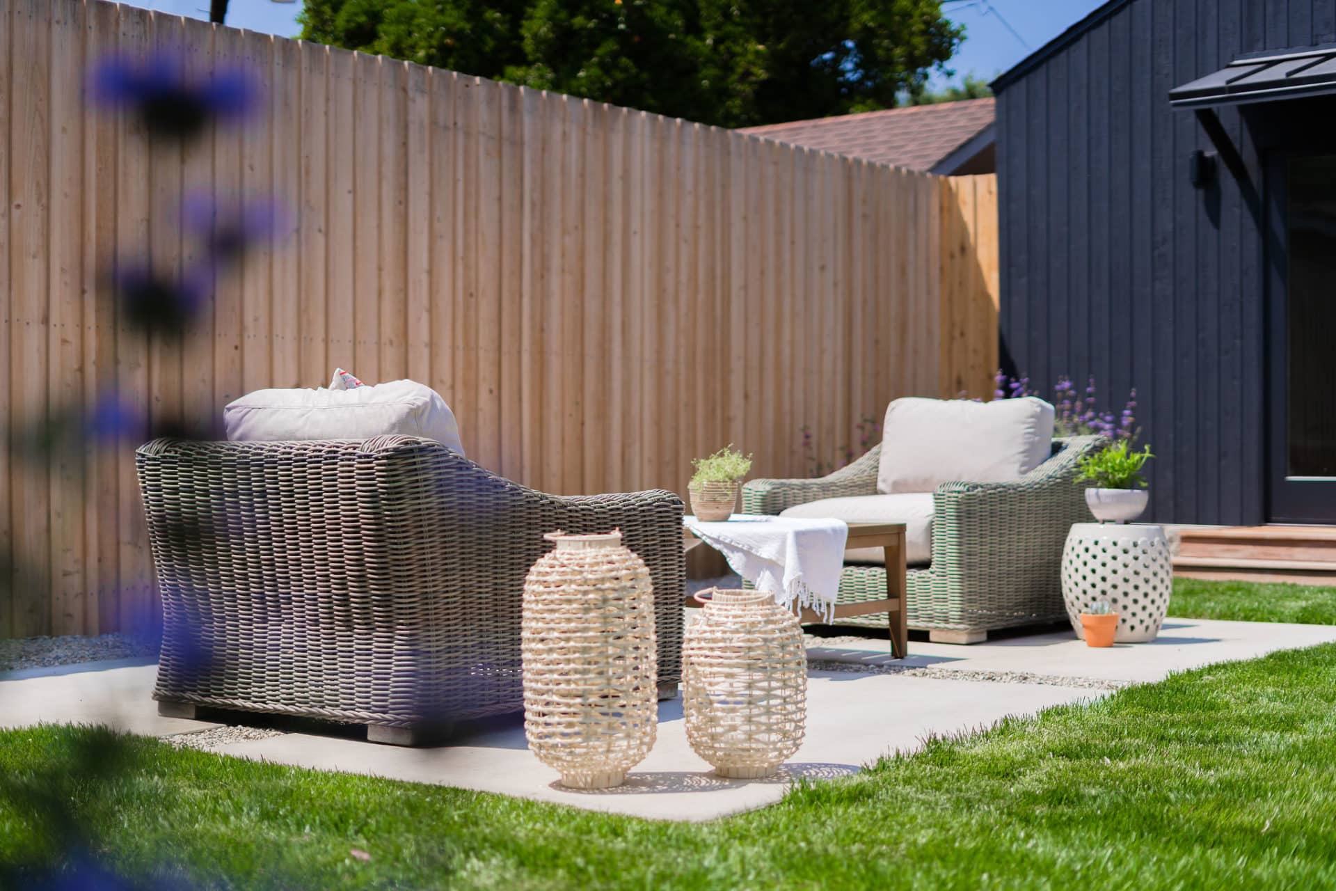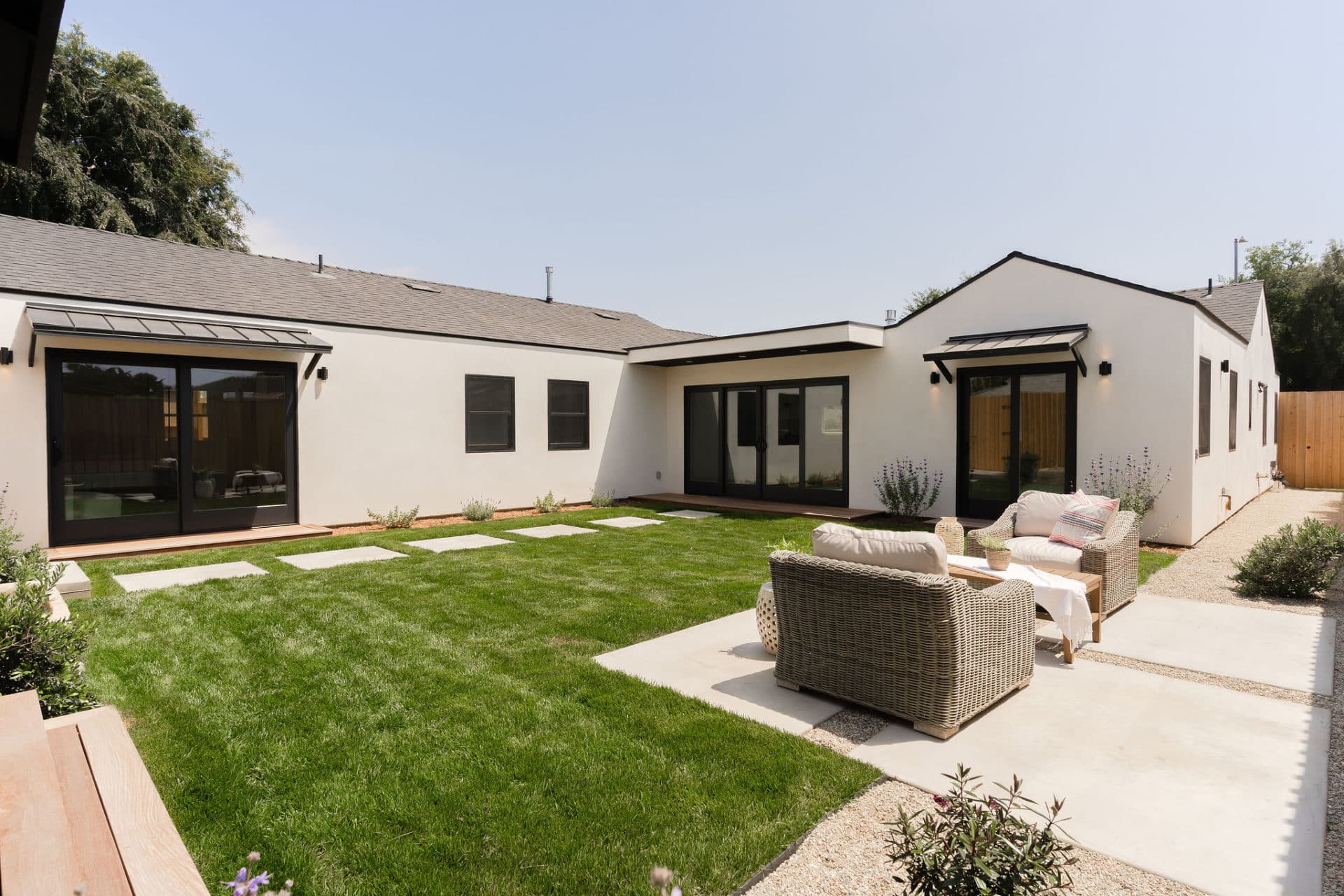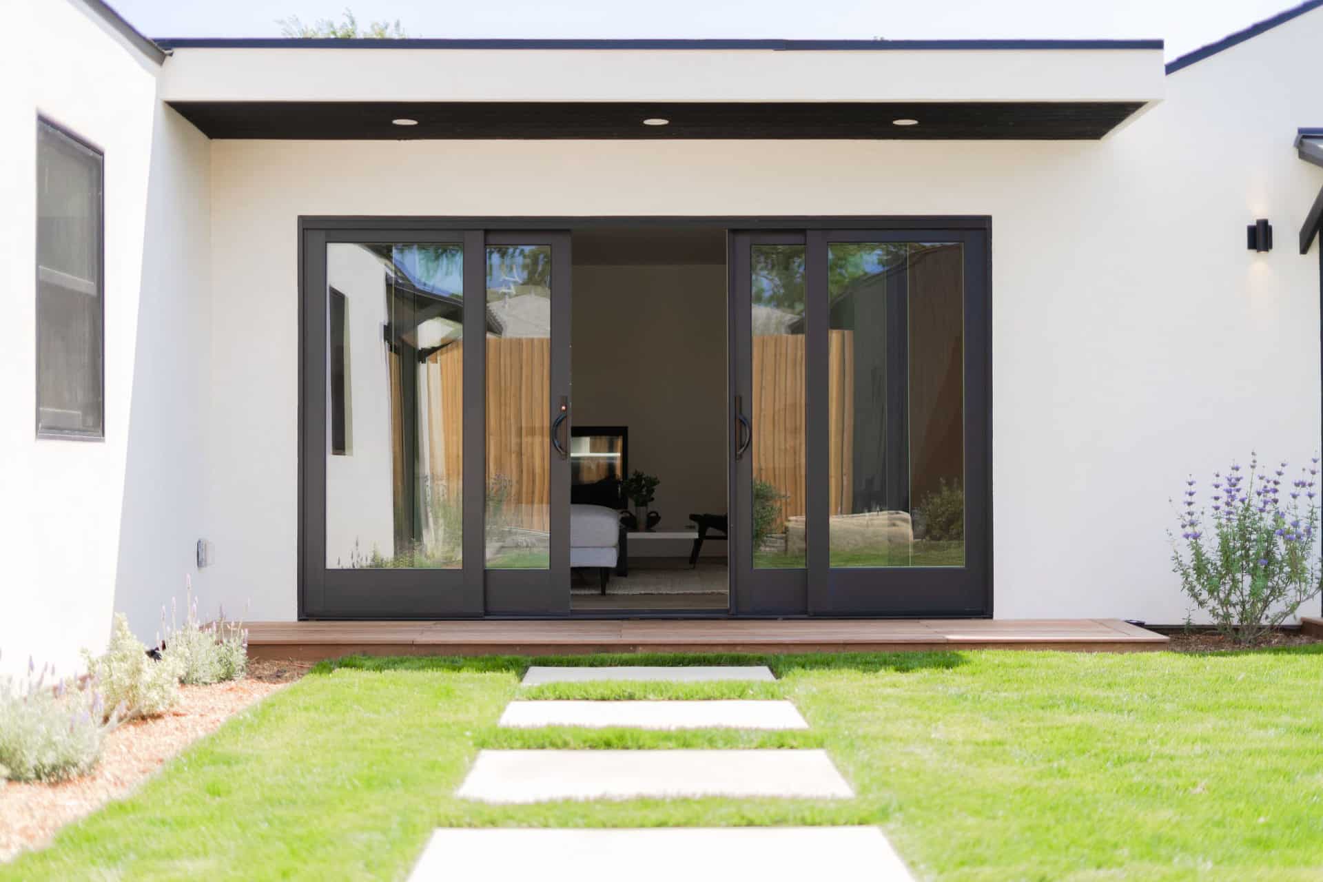 Across the yard, the guest house dressed in blackened redwood cedar cladding offers the perfect contrast to the smooth stuccoed main.