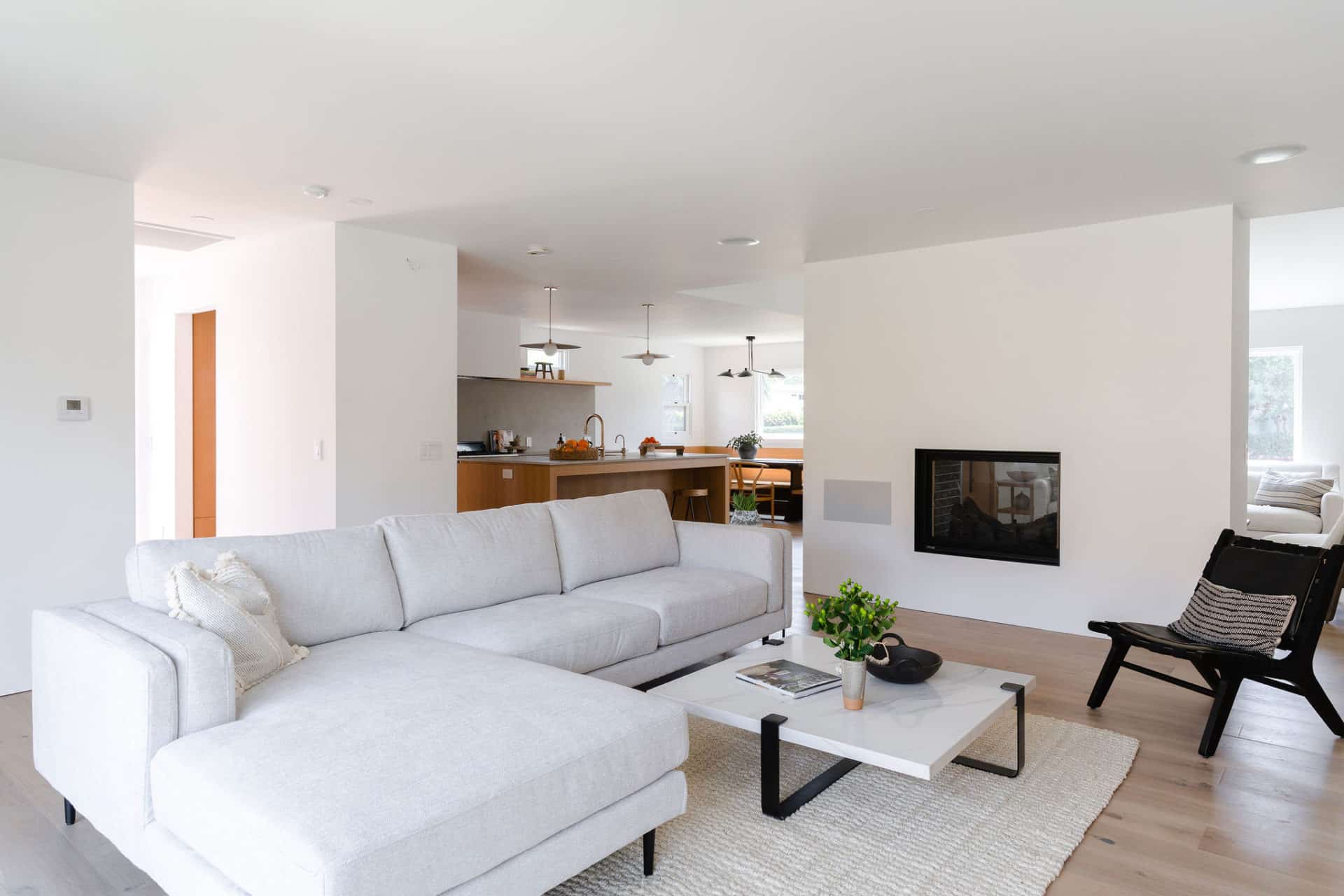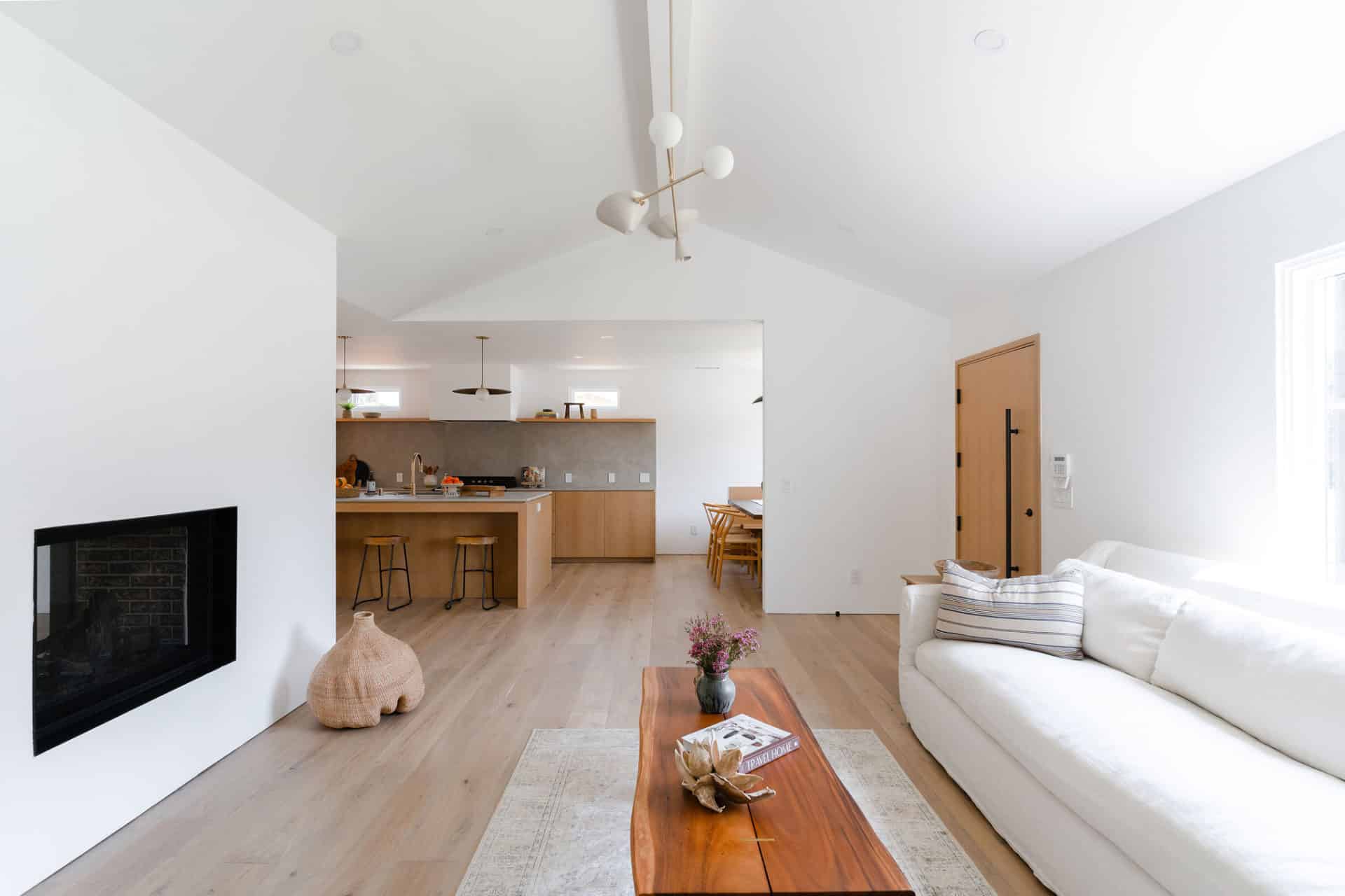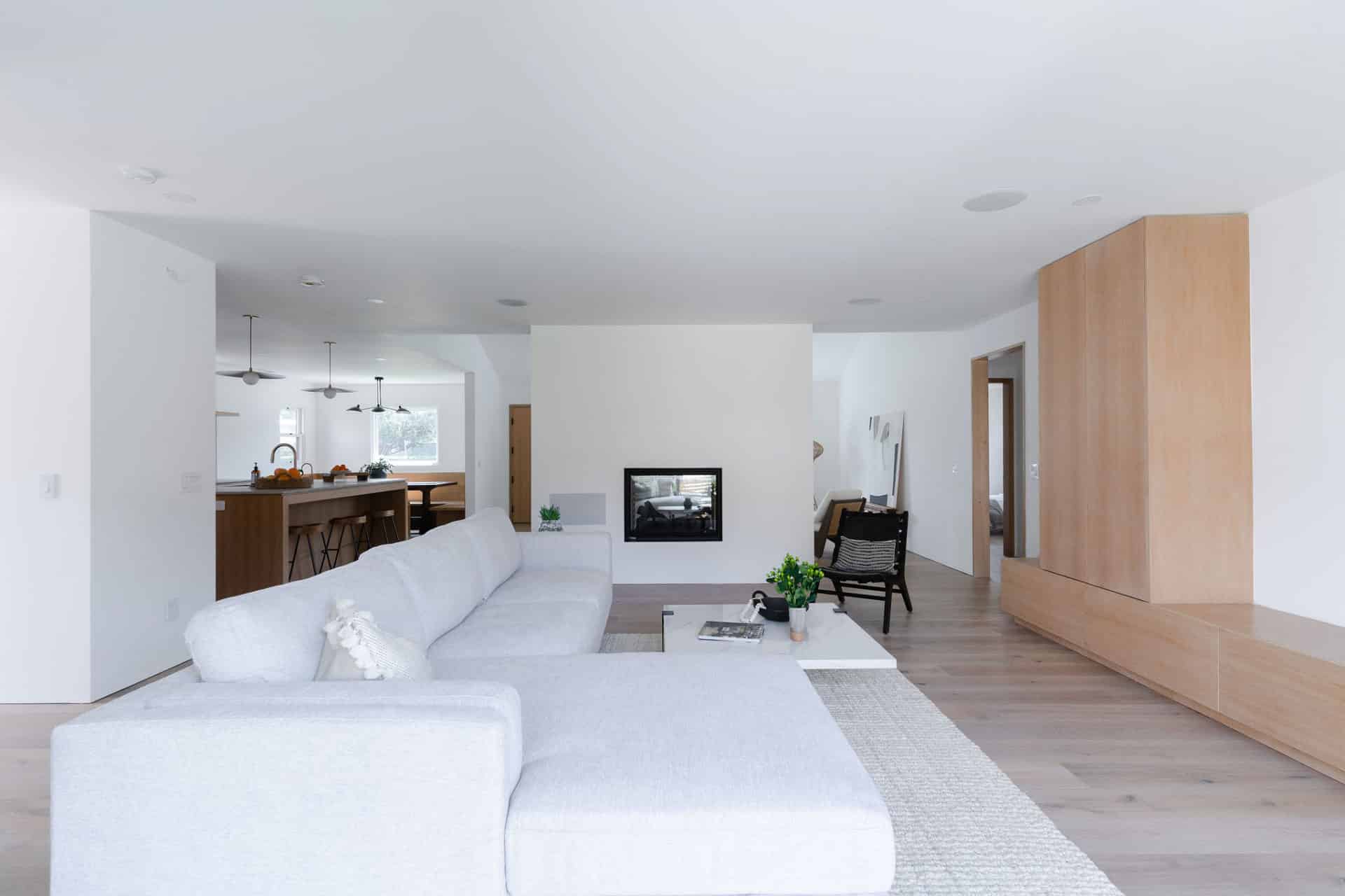Wide open floorplan masterfully curated with modern functionality in mind offers a living room + den separated by a new double-sided gas fireplace and boasting white washed oak floors, clean lines and modern simplicity.