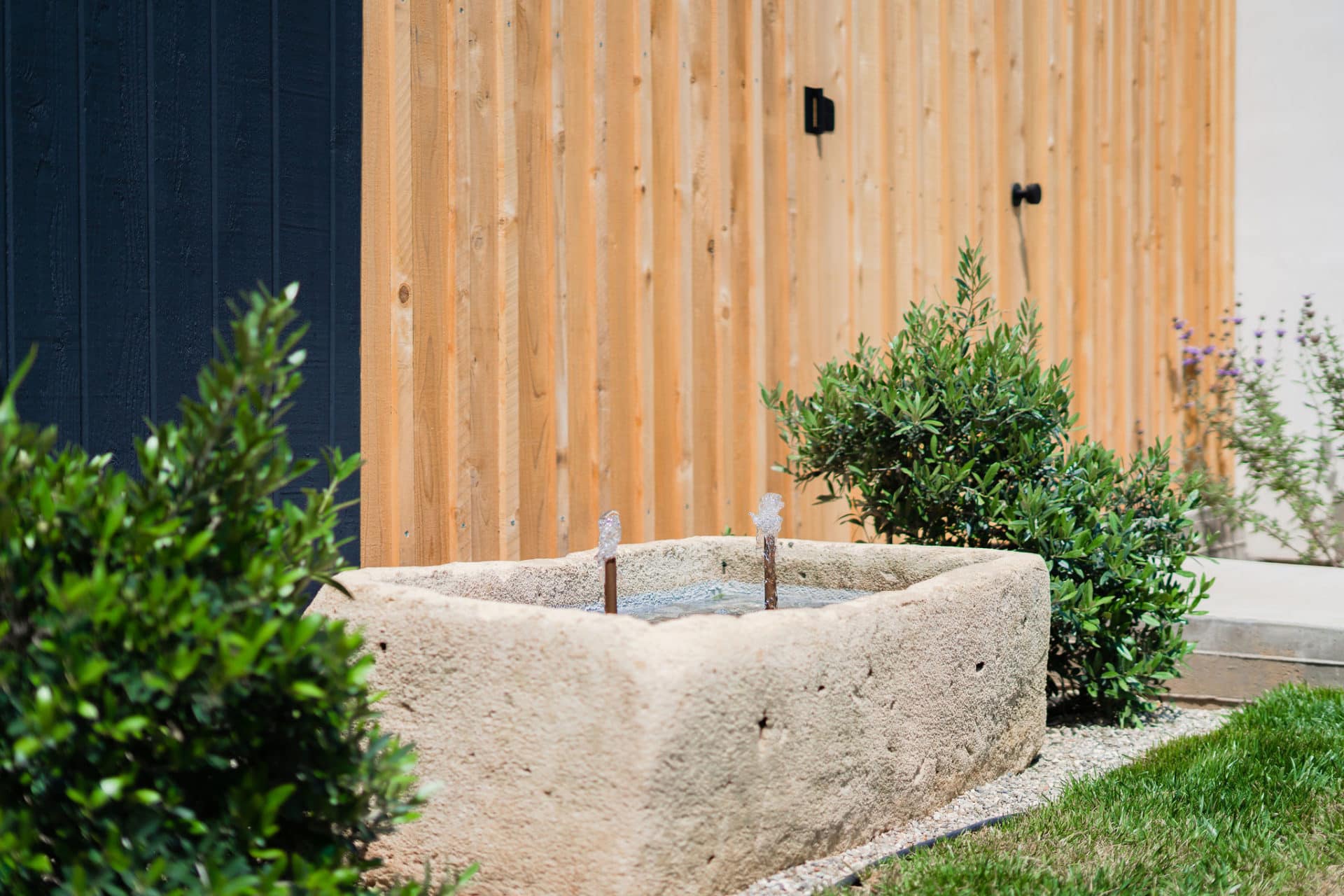 Outside of the studio a stone fountain offers soothing sounds creating a sanctuary feeling in the garden.