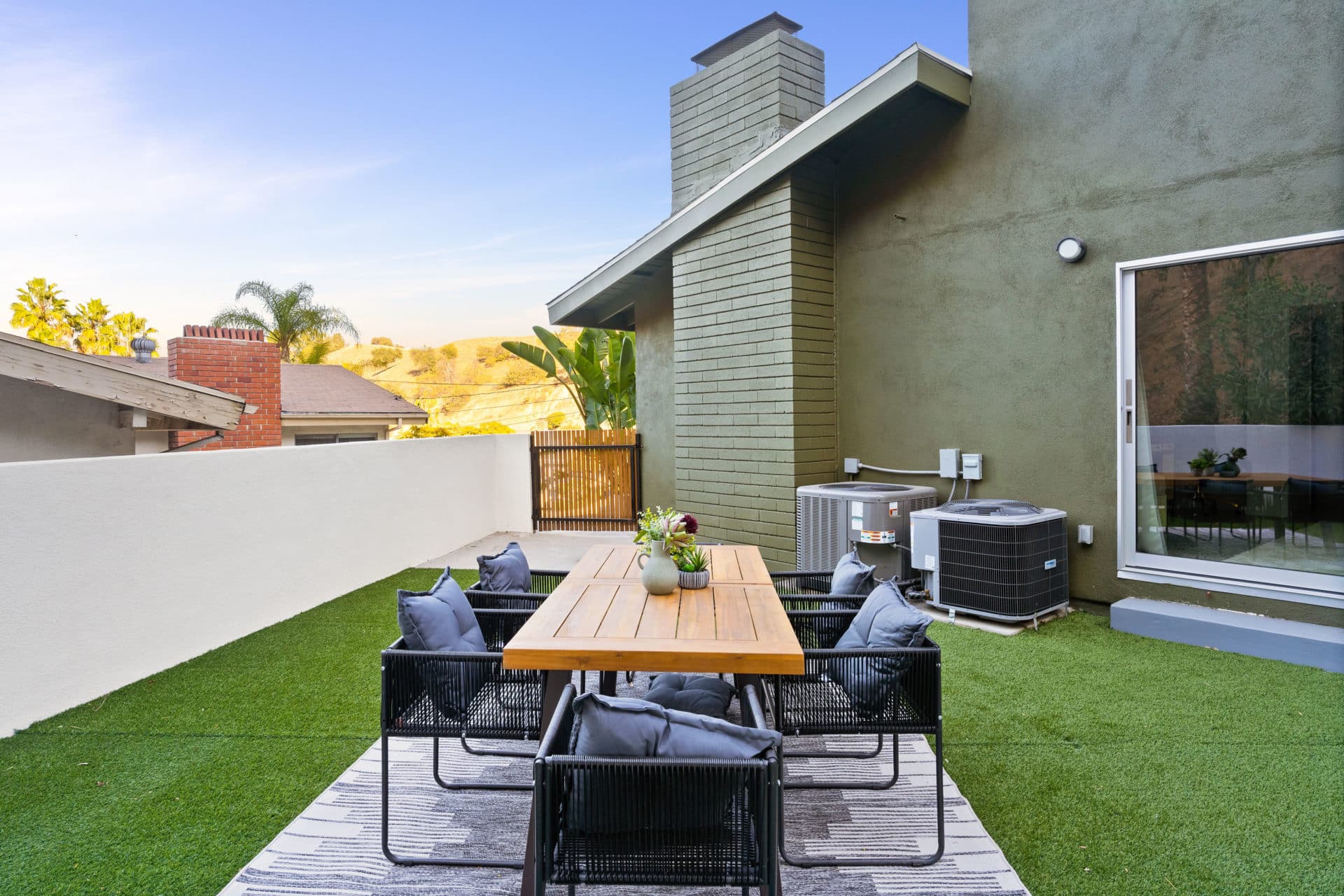 Enjoy twilight entertaining under the stars, tucked into the hillside, with stairs up to additional outdoor space.