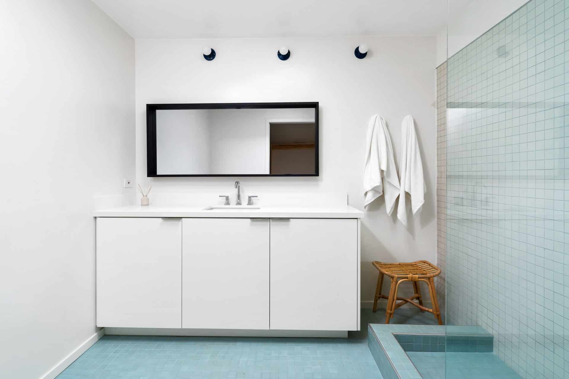 A few steps up to the master bedroom with picture windows and mountain views, tons of hanging storage, and freshly-tiled master bath w/oversized shower, new modern vanity and designer lighting.