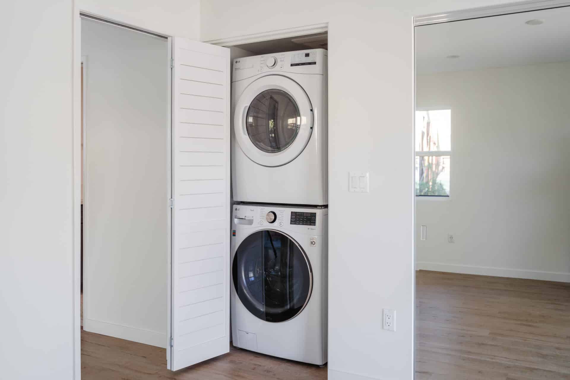 Brand new washer and dryer are conveniently stacked and concealed in a custom closet.
