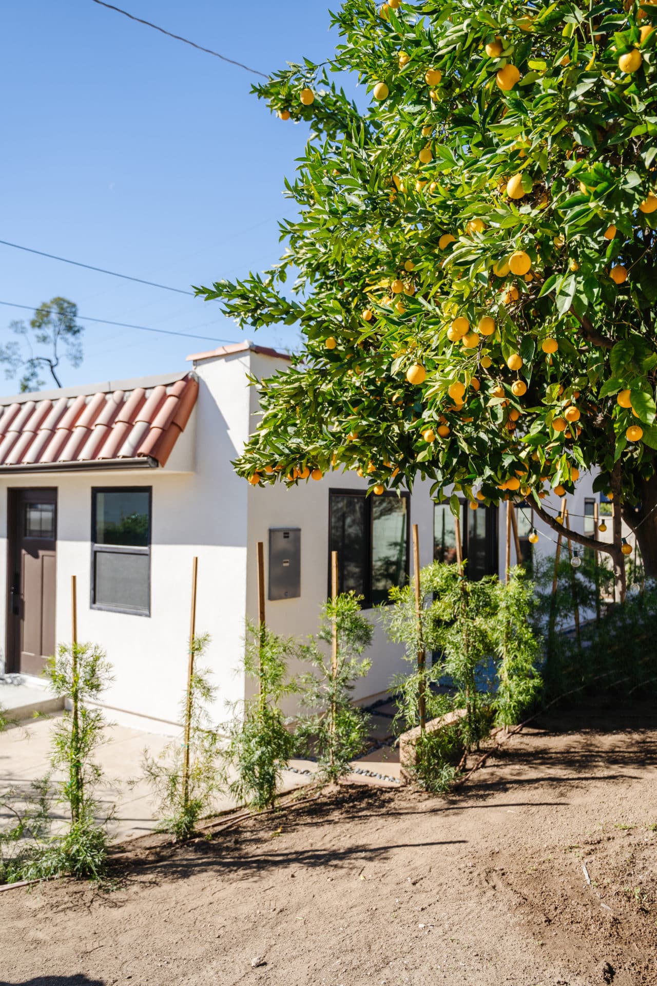 Approaching the lot from the street, curated landscaping serenely welcomes you home. The ADU shares the same barreled roof tile motif seen on the front house. A sweet wrought iron gate adds a vintage charm and privacy alongside newly planted hedges along the perimeter. Barn lighting adorns all entry ways.
