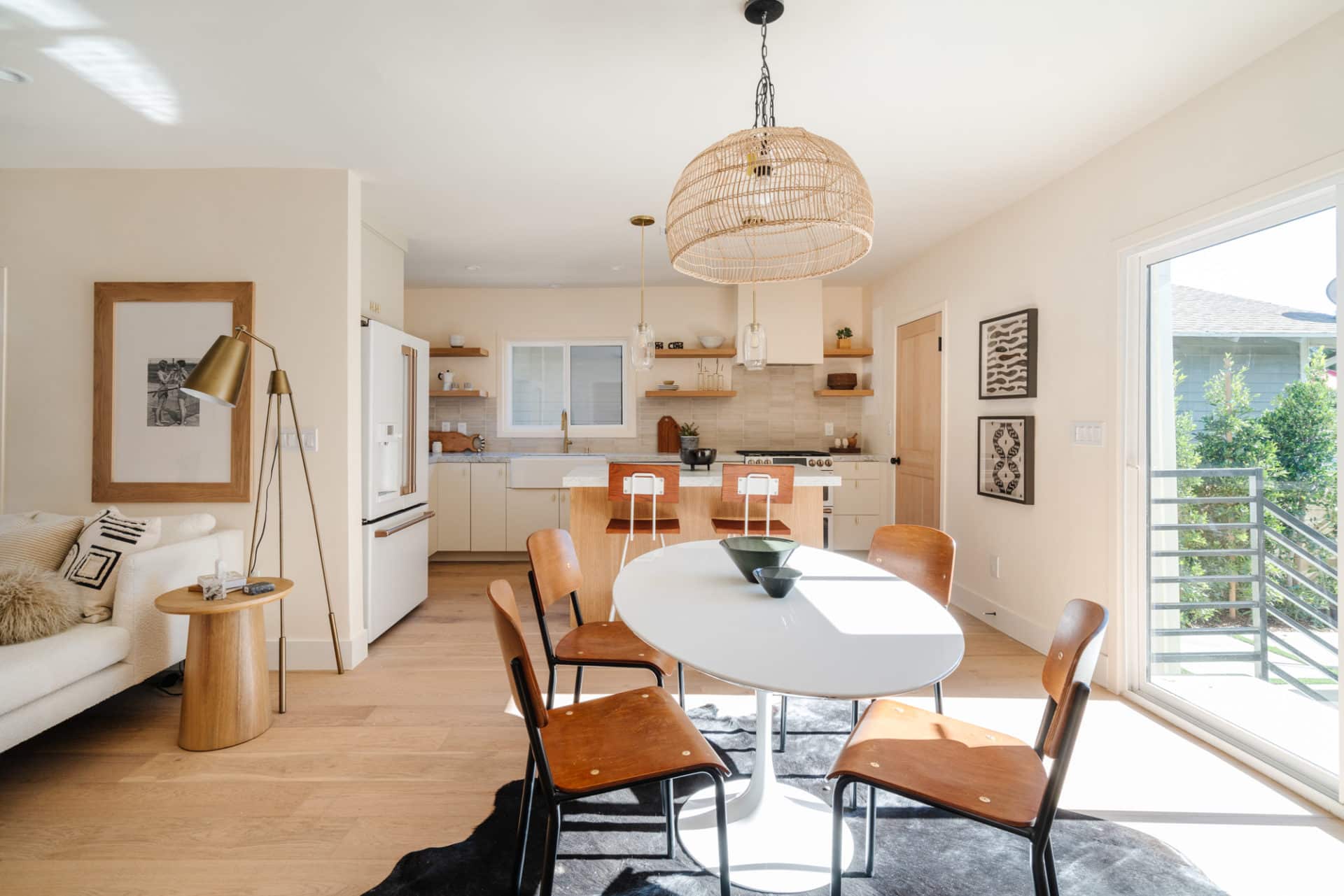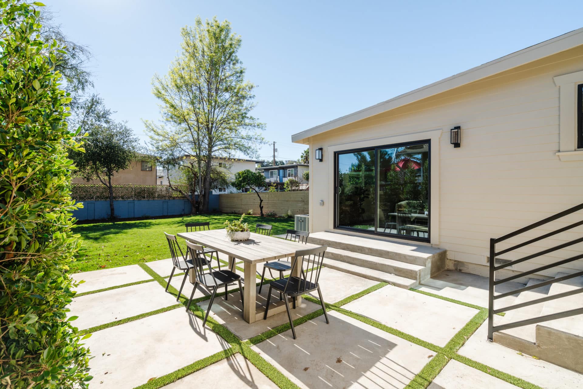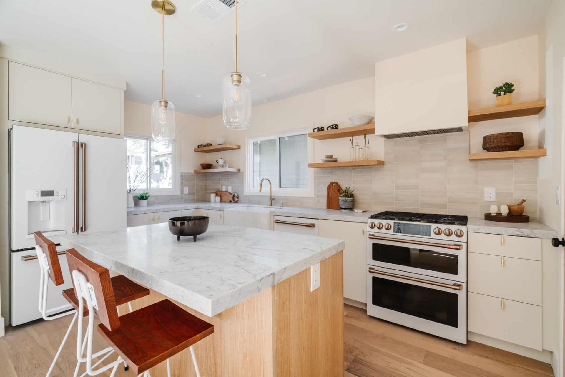 Walk into a bright and airy open layout, where new oak floors lead you from living to dining and a stylish creamy palette kitchen with center island, brushed brass finishes, new Café line appliances, and honed Carrara marble countertops. Sliding doors off kitchen + dining open out to the back patio, perfect for dining al fresco with friends and family – the layout is truly an entertainer’s dream!