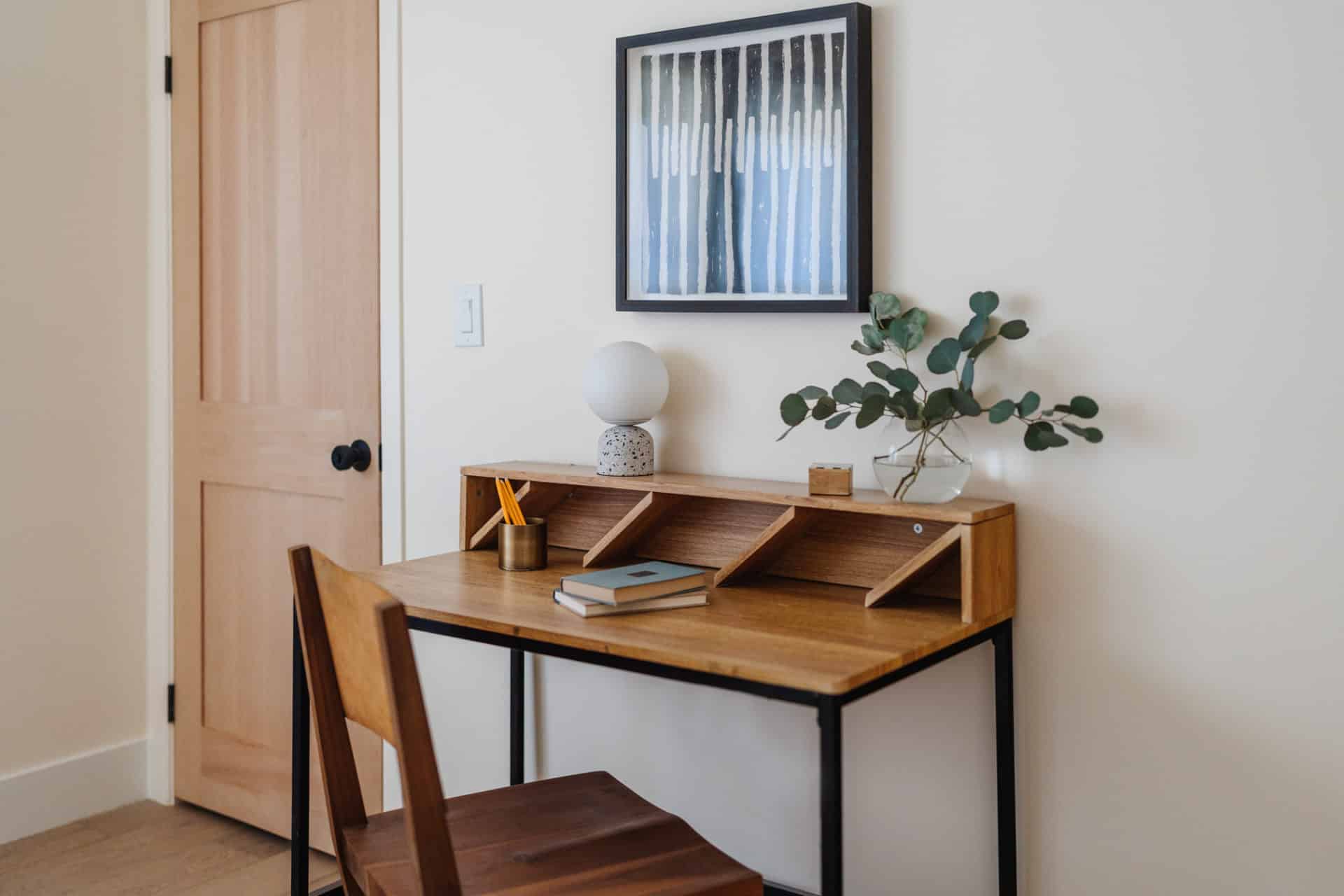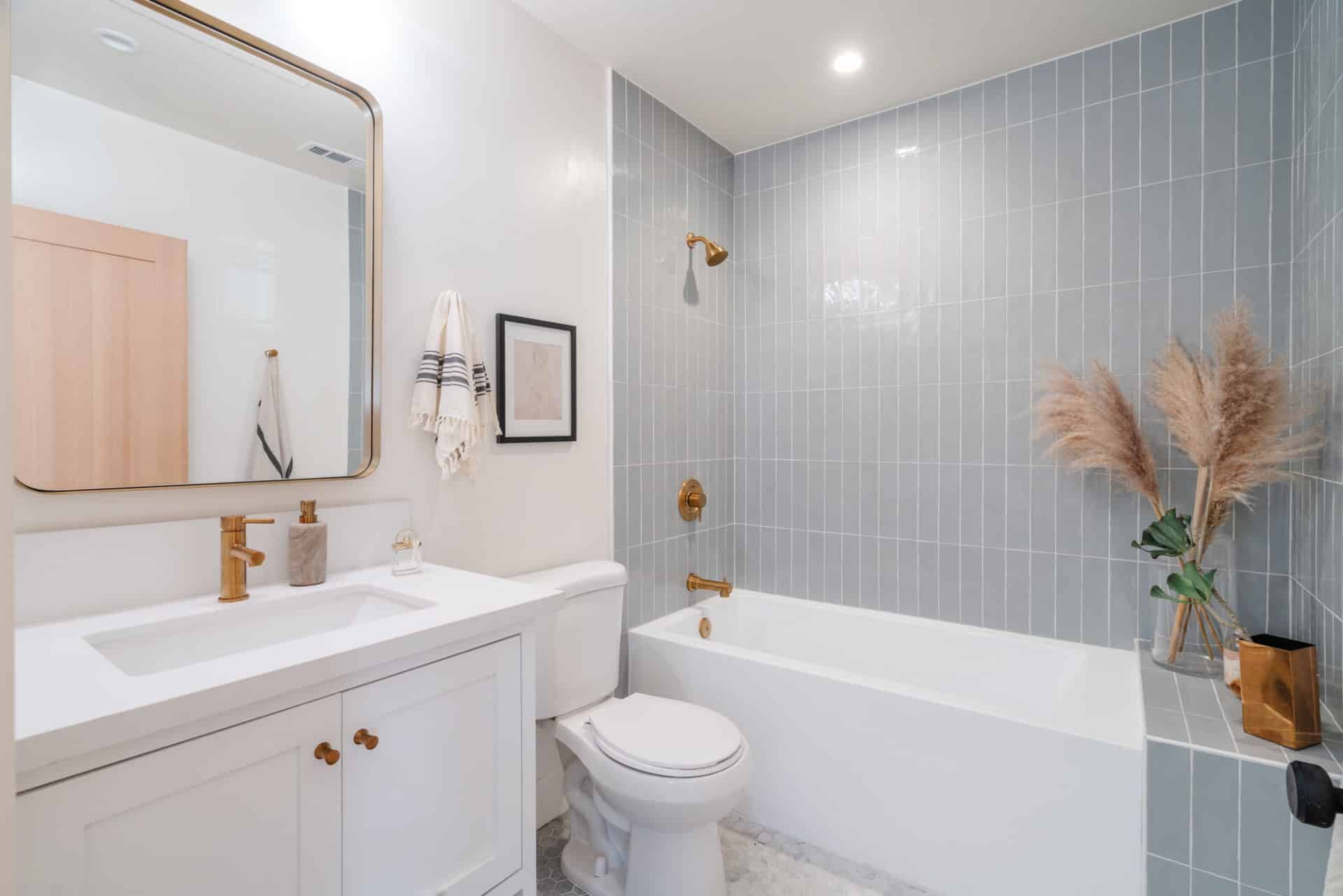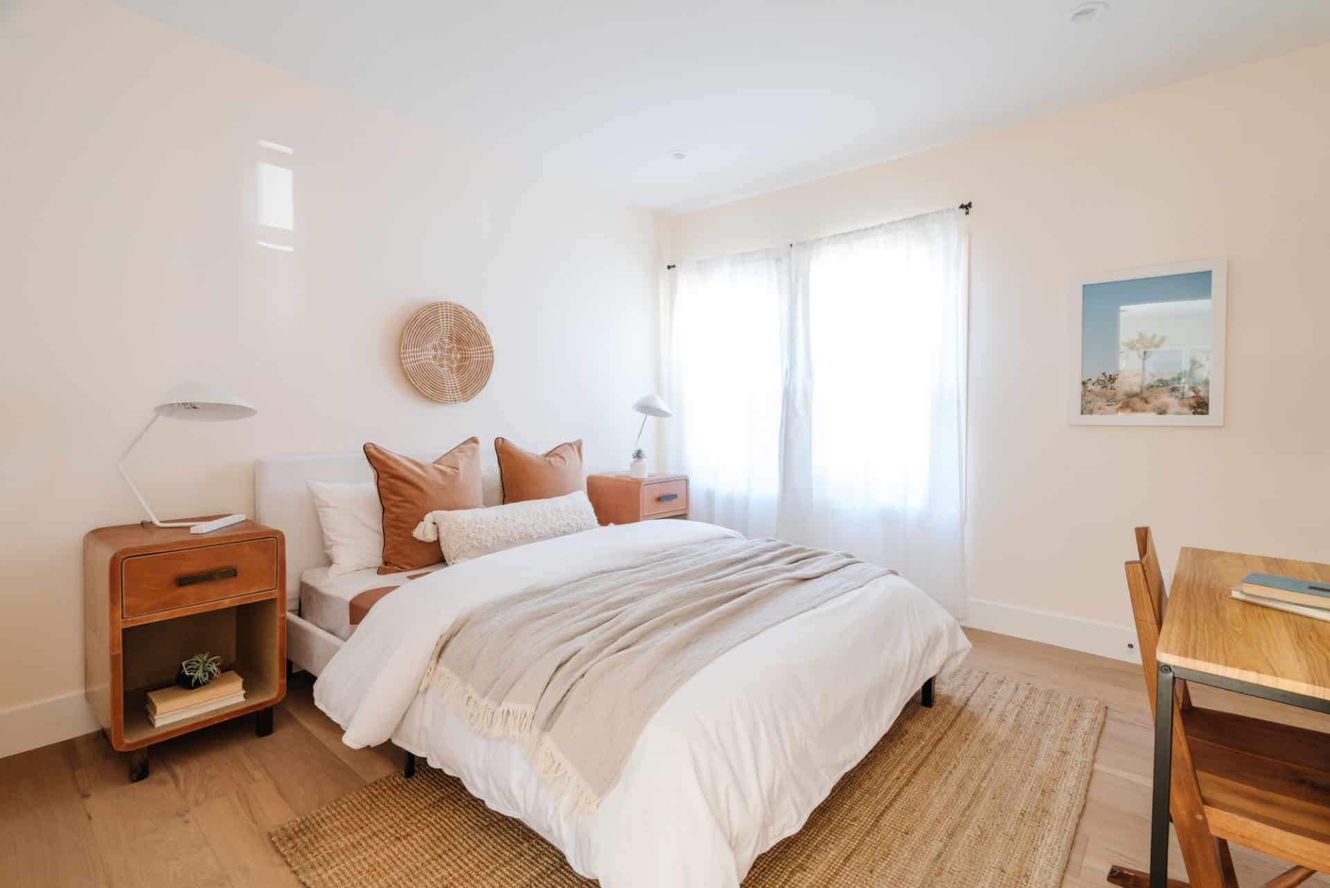 Walk into a bright and airy open layout, where new oak floors lead you from living to dining and a stylish creamy palette kitchen with center island, brushed brass finishes, new Café line appliances, and honed Carrara marble countertops. Sliding doors off kitchen + dining open out to the back patio, perfect for dining al fresco with friends and family – the layout is truly an entertainer’s dream!