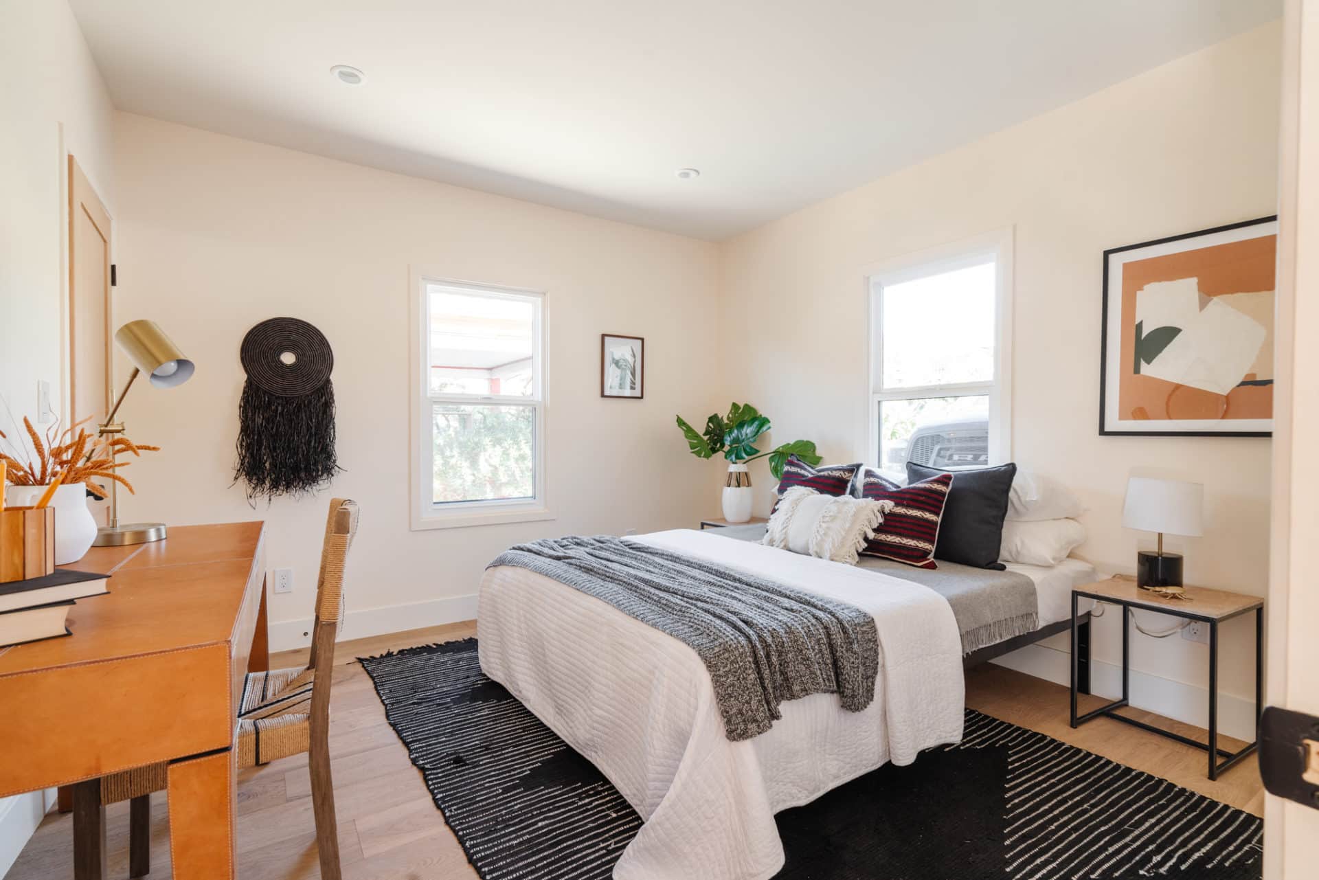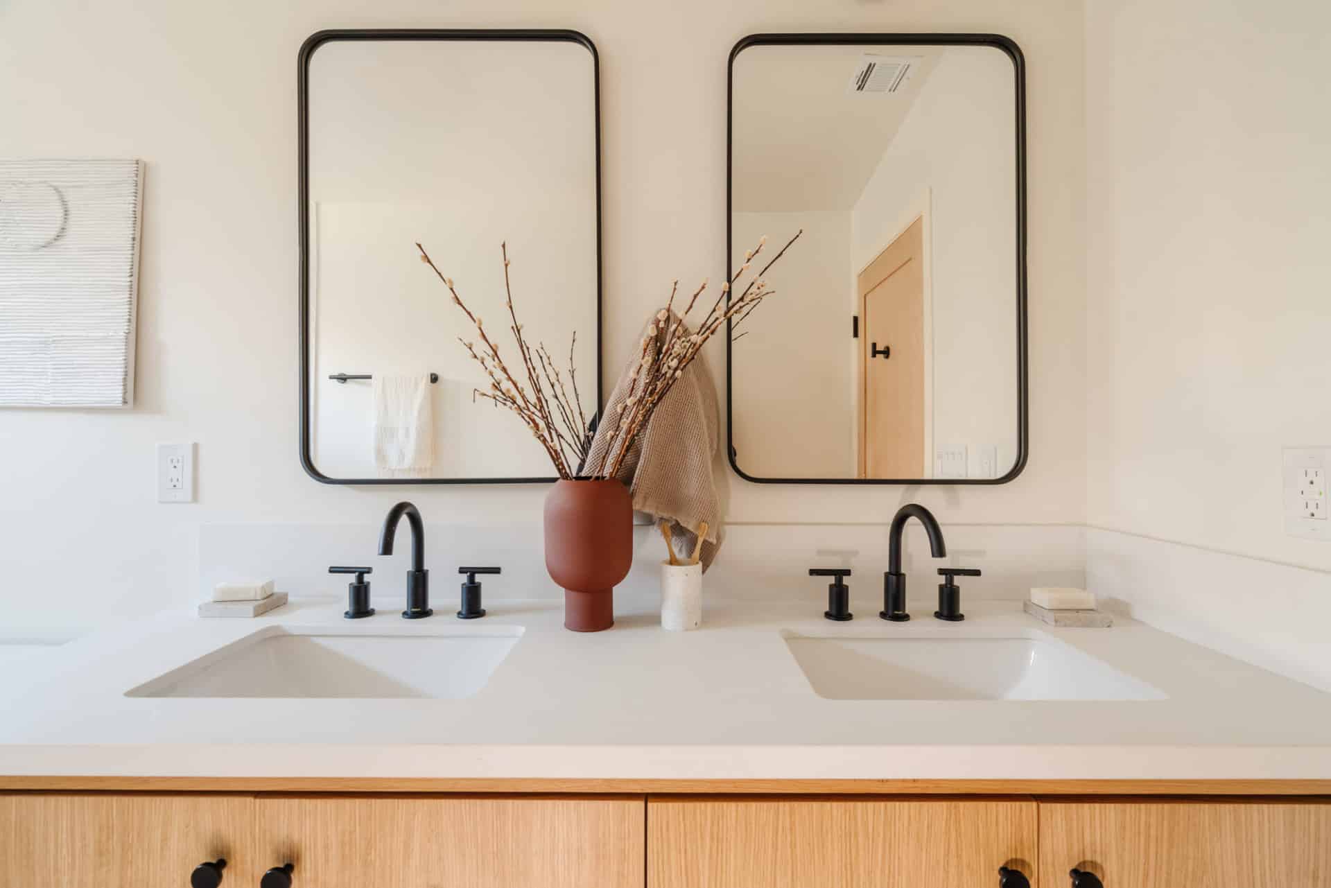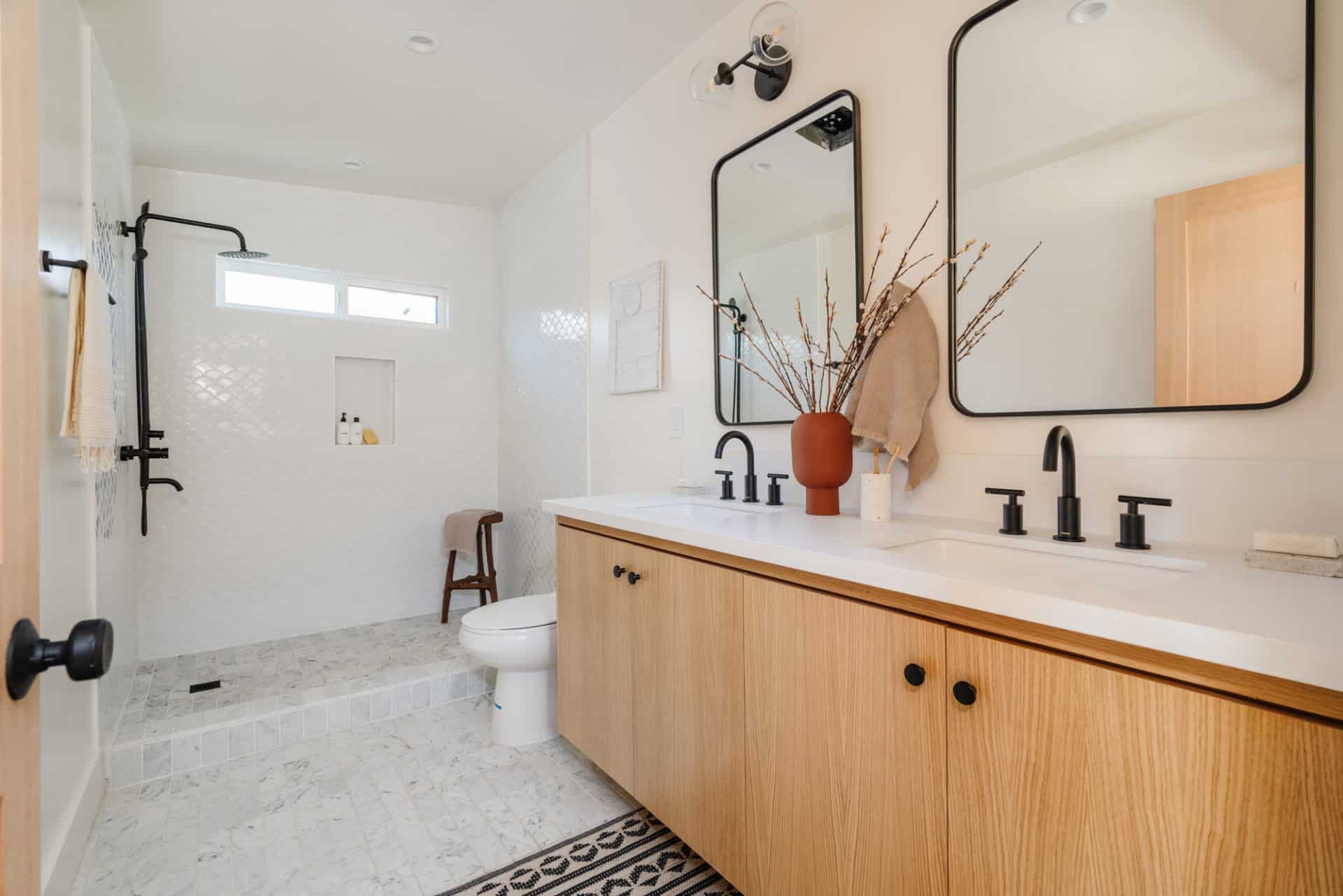 Home features 3 bedrooms + 2 bathrooms, including a spacious master suite at the rear with ensuite bath featuring dual vanity, chic matte black finishes, large shower, and stunning clamshell + marble tilework.