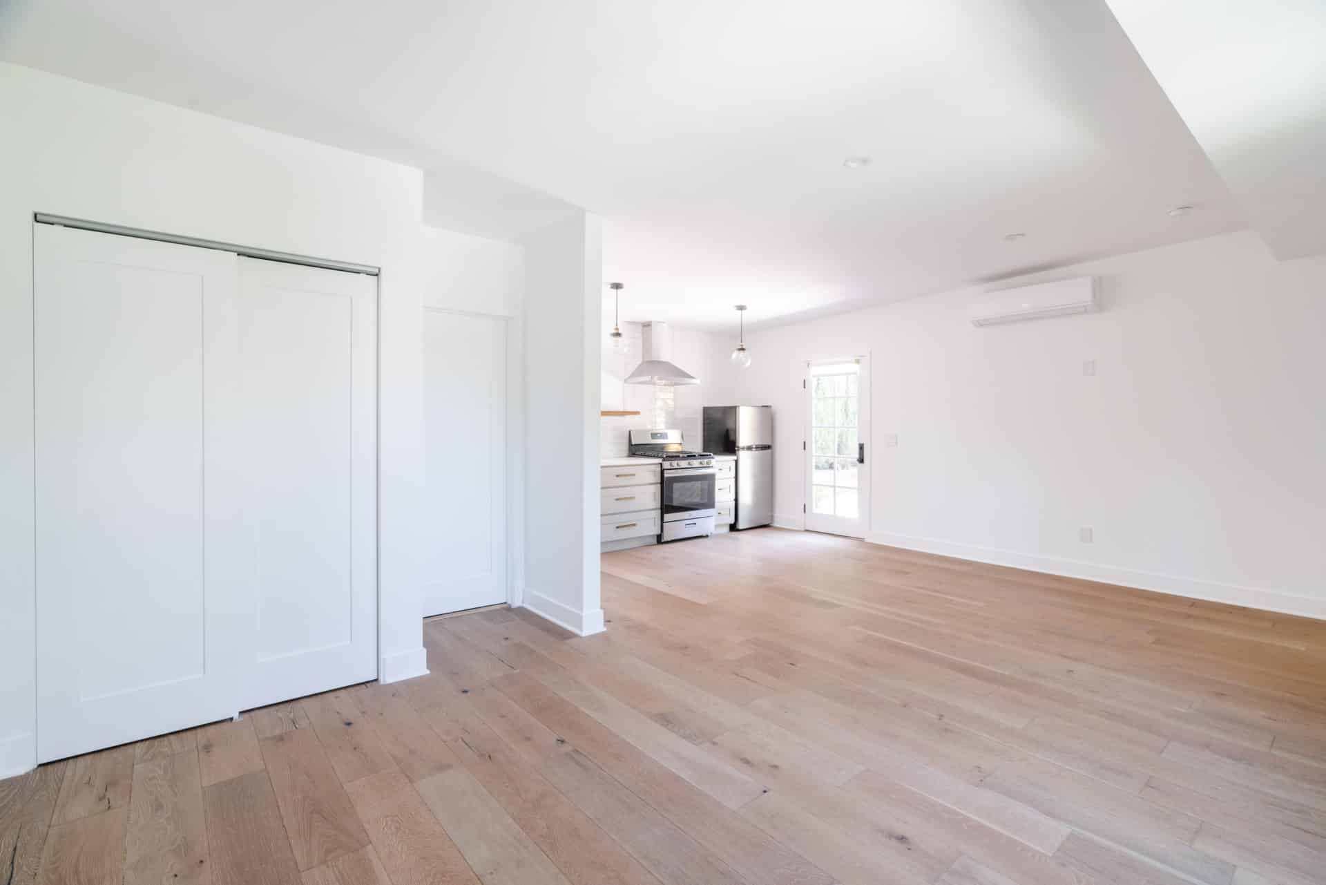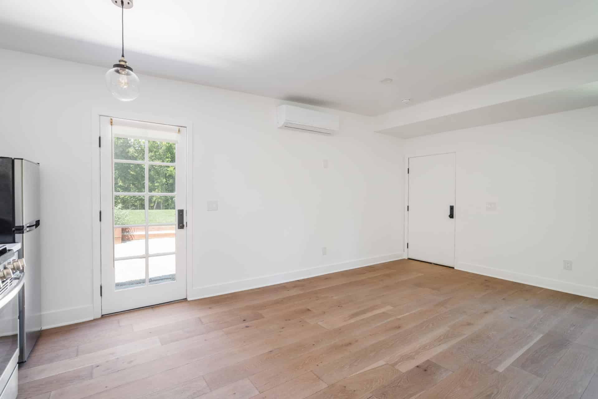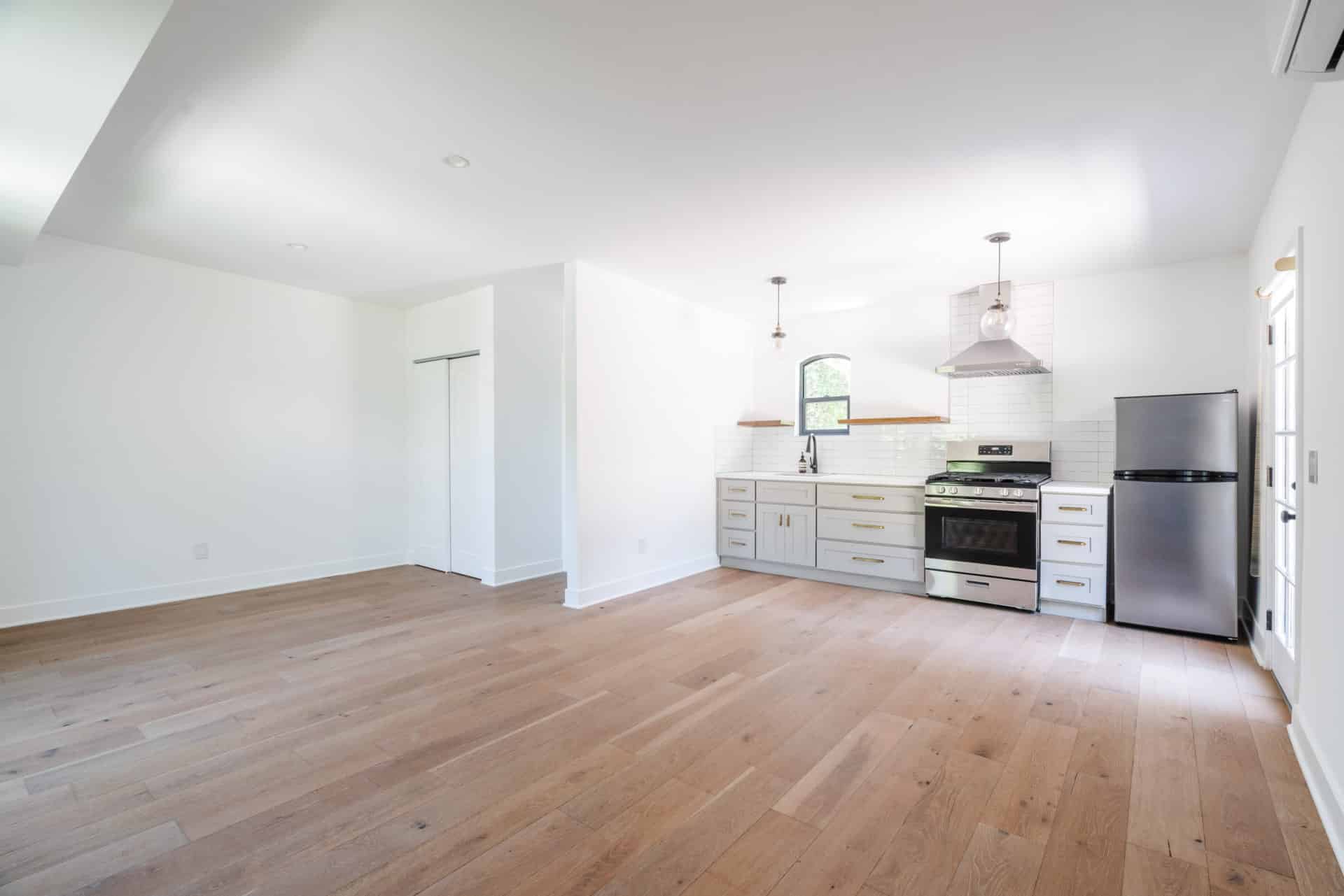 A functional yet compact chefs kitchen is equipped with stainless steel appliances alongside custom cabinetry with quartz countertop and timeless horizontal subway tiles. Wide plank engineered oak floors, recessed lighting, and black + brass finishes throughout. Split system HVAC unit is remote operated. Enjoy preparing coffee and breakfast within the natural light that peers through each morning. Glass pendants hang above adding the perfect glow as you prepare your evening meals.
