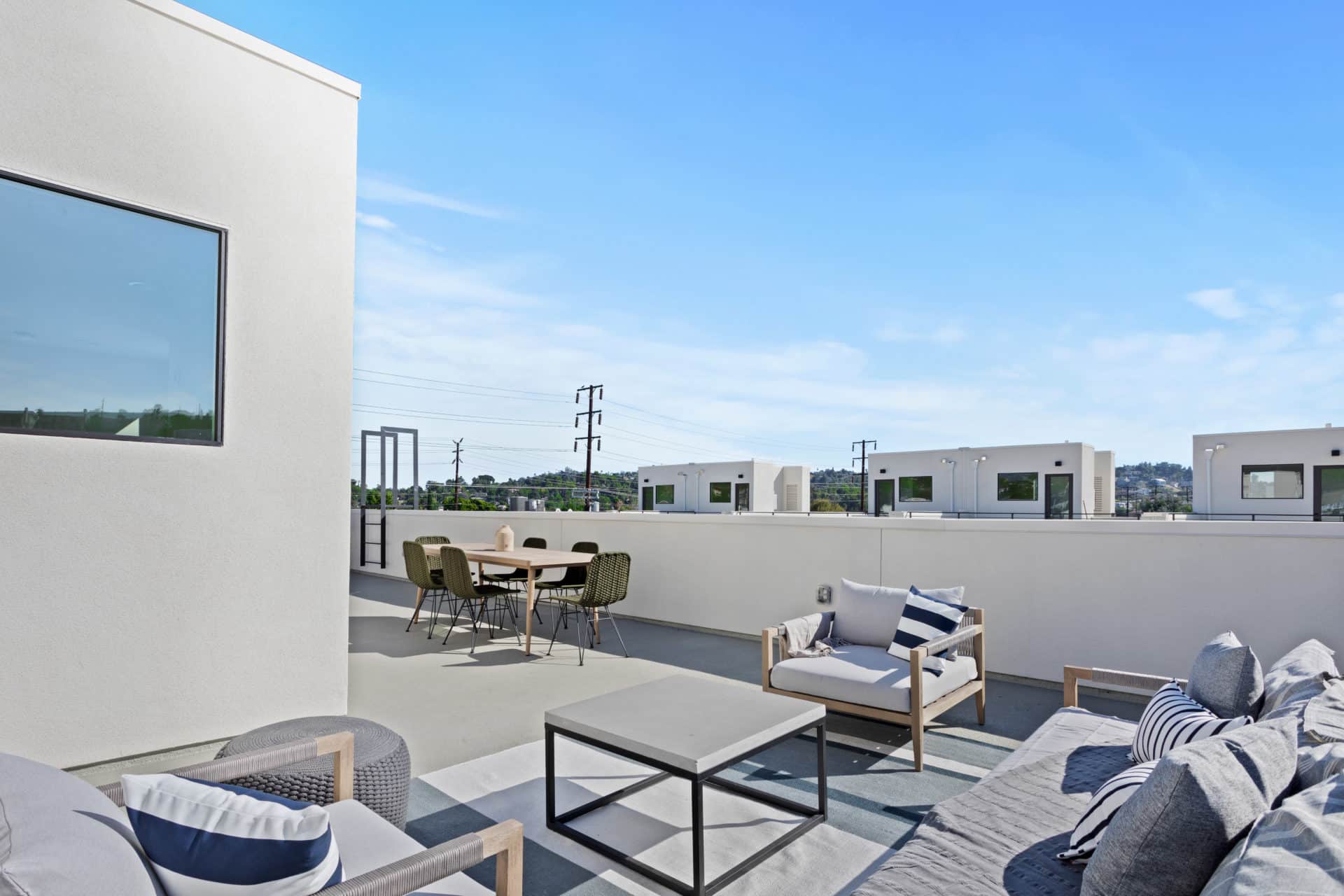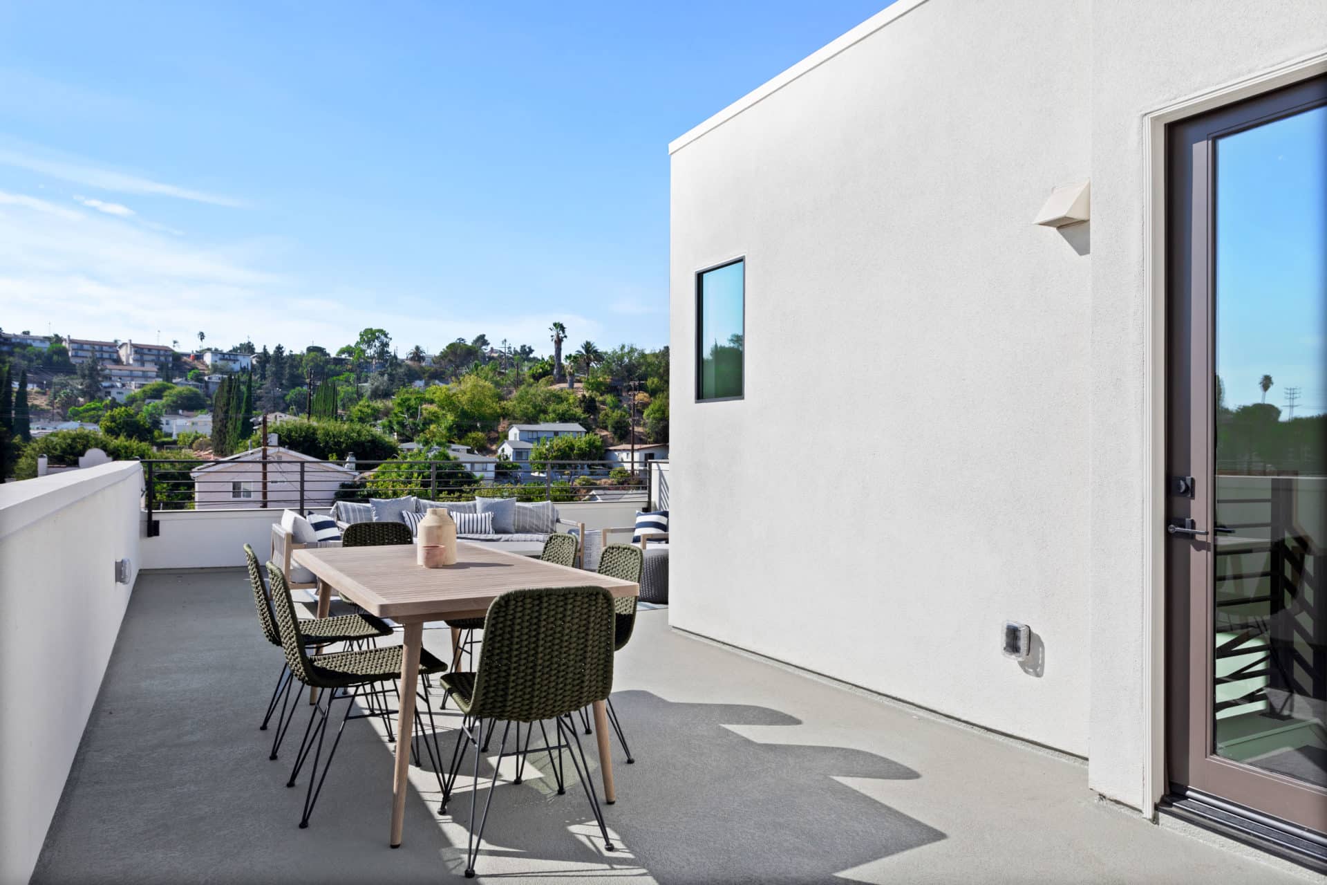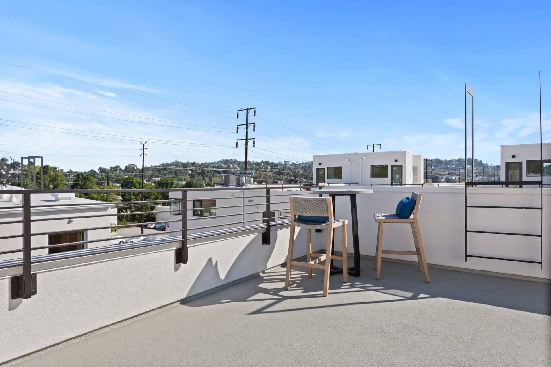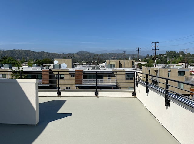 The spacious rooftop has room for dining, grilling, and lounging with views of the San Gabriel Mountains and twinkly lights of Eagle Rock.