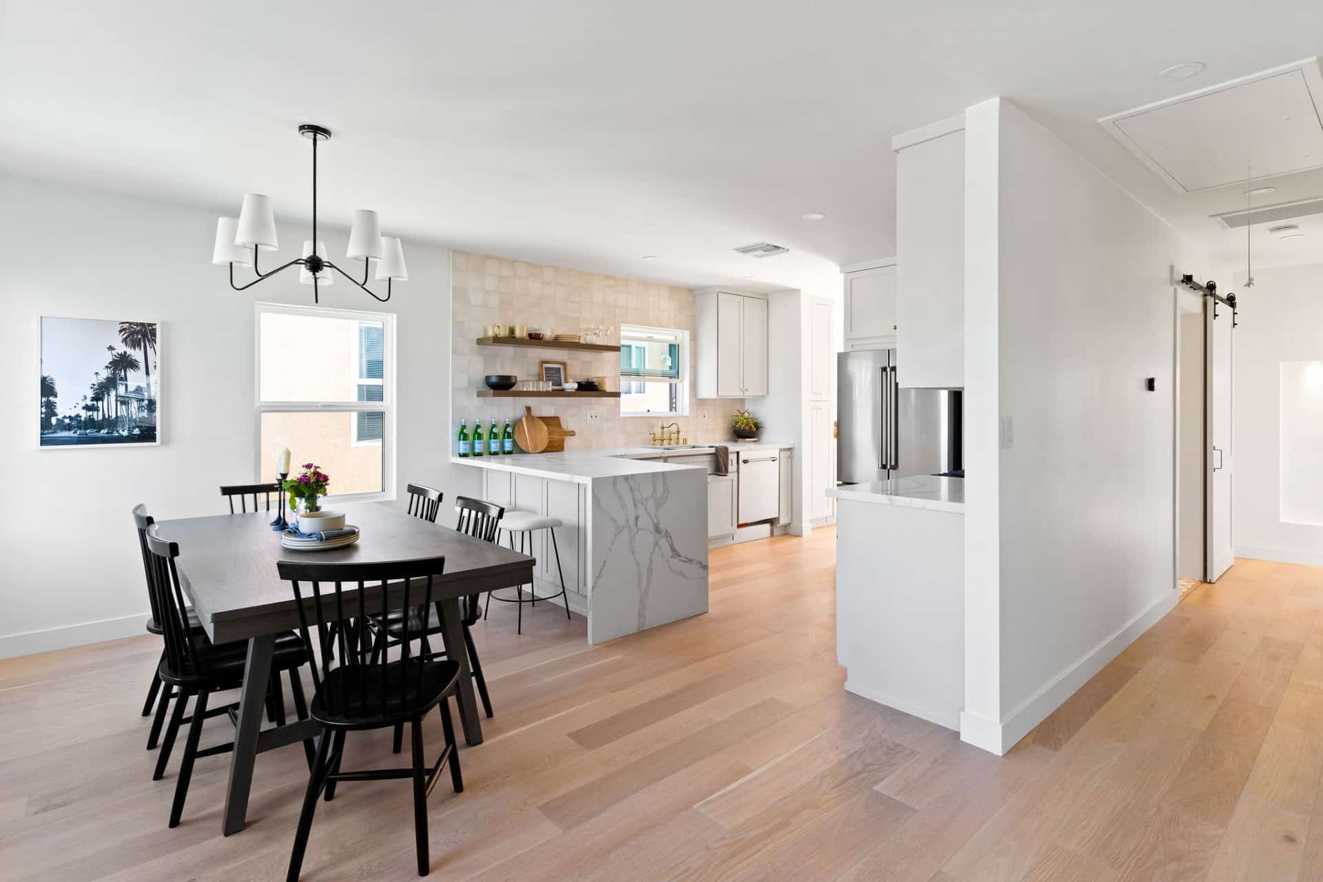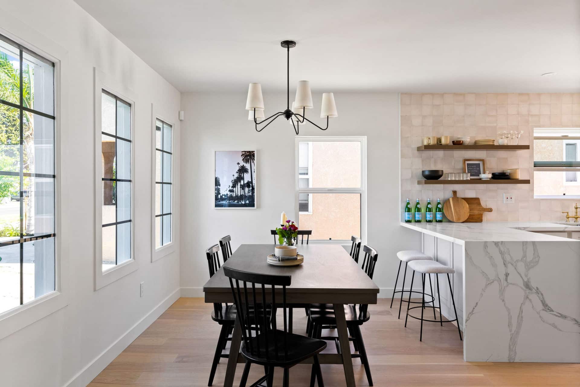 The open floorplan enjoys a seamless transition into the kitchen/dining. The dining area sets the scene for bright breakfasts and lunches together in front of beautiful statement windows.