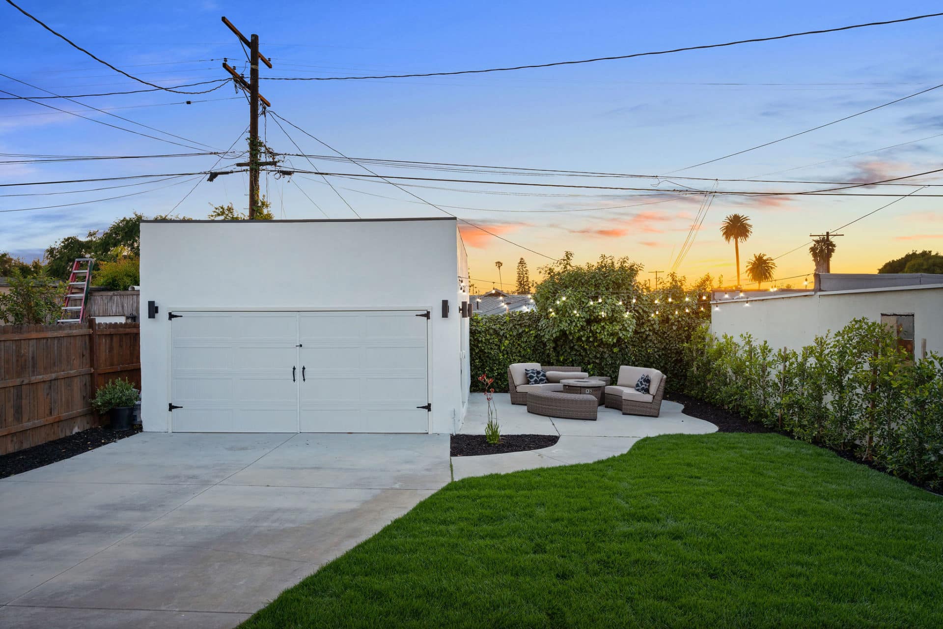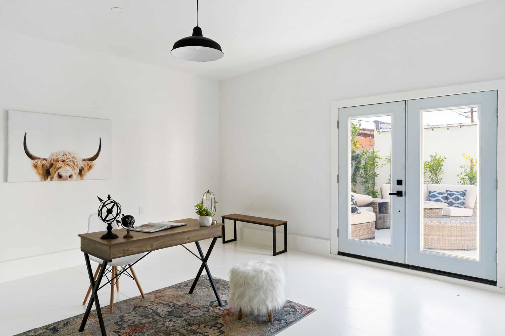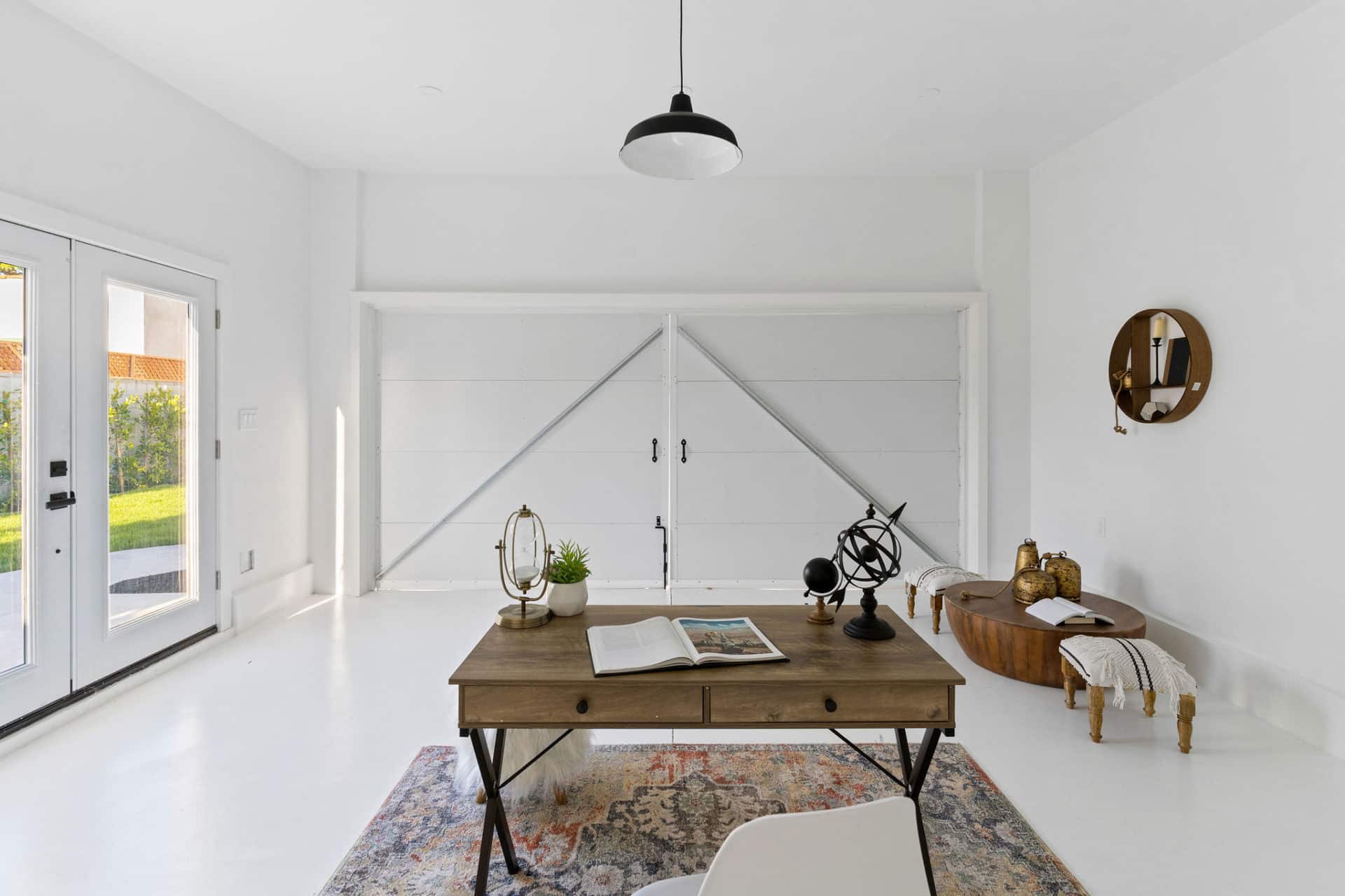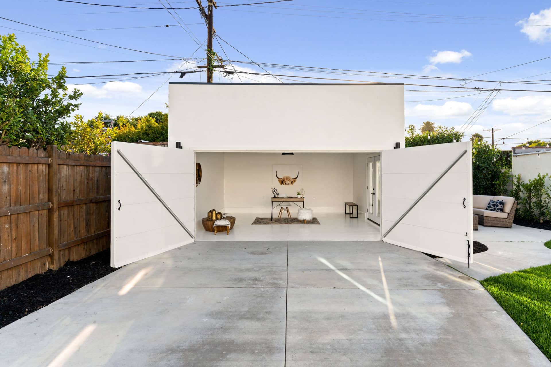 The finished garage with high ceilings and french doors to the patio offers an opportunity for a space to work from home, or potential for ADU conversion to add income and help supplement the mortgage.