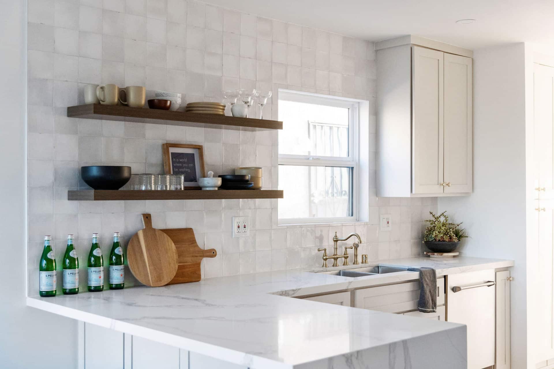 The custom kitchen is fitted with floor to ceiling cabinetry with tons of storage, new built-in appliances and floating shelves to showcase your finest dishes.