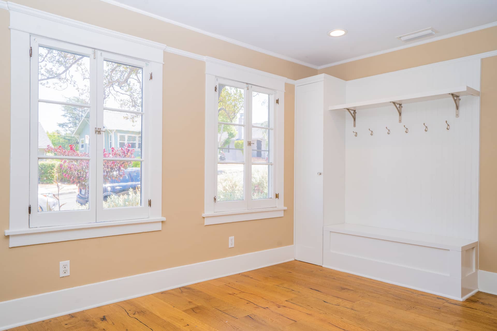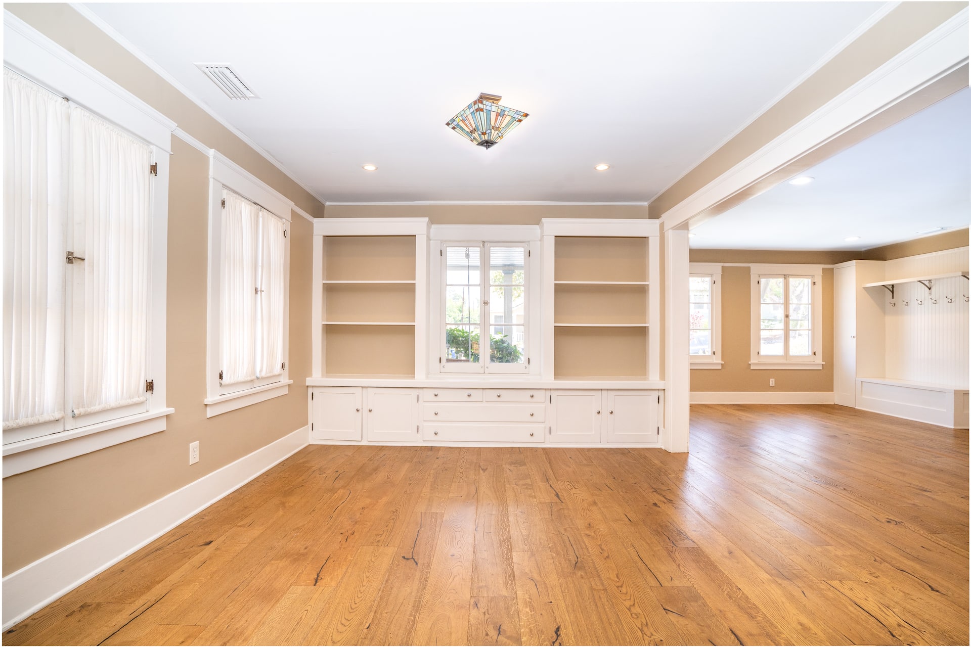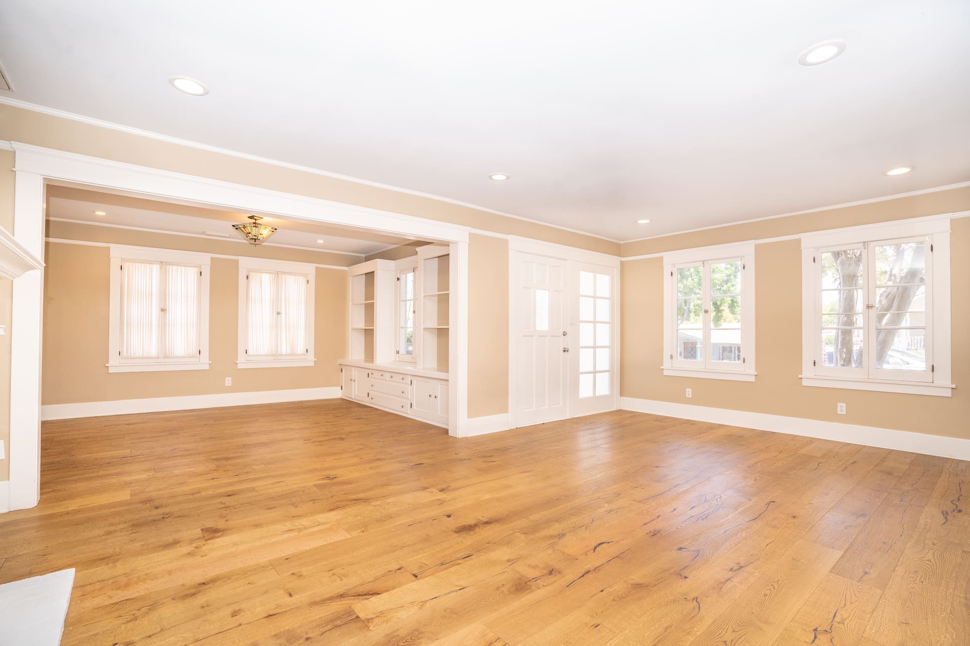 Greeted by a foyer with a built-in bench and coat rack that opens to an open-concept living room featuring a decorative fireplace, built-in bookcase, and original character windows. Across the wide plank oak hardwood floors enter the oversized dining room that includes an entire wall with built-in shelving/storage and banquet seating.