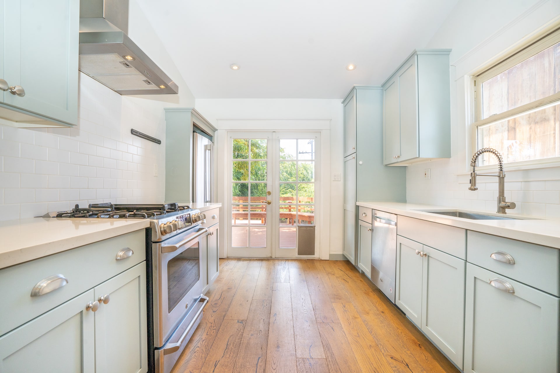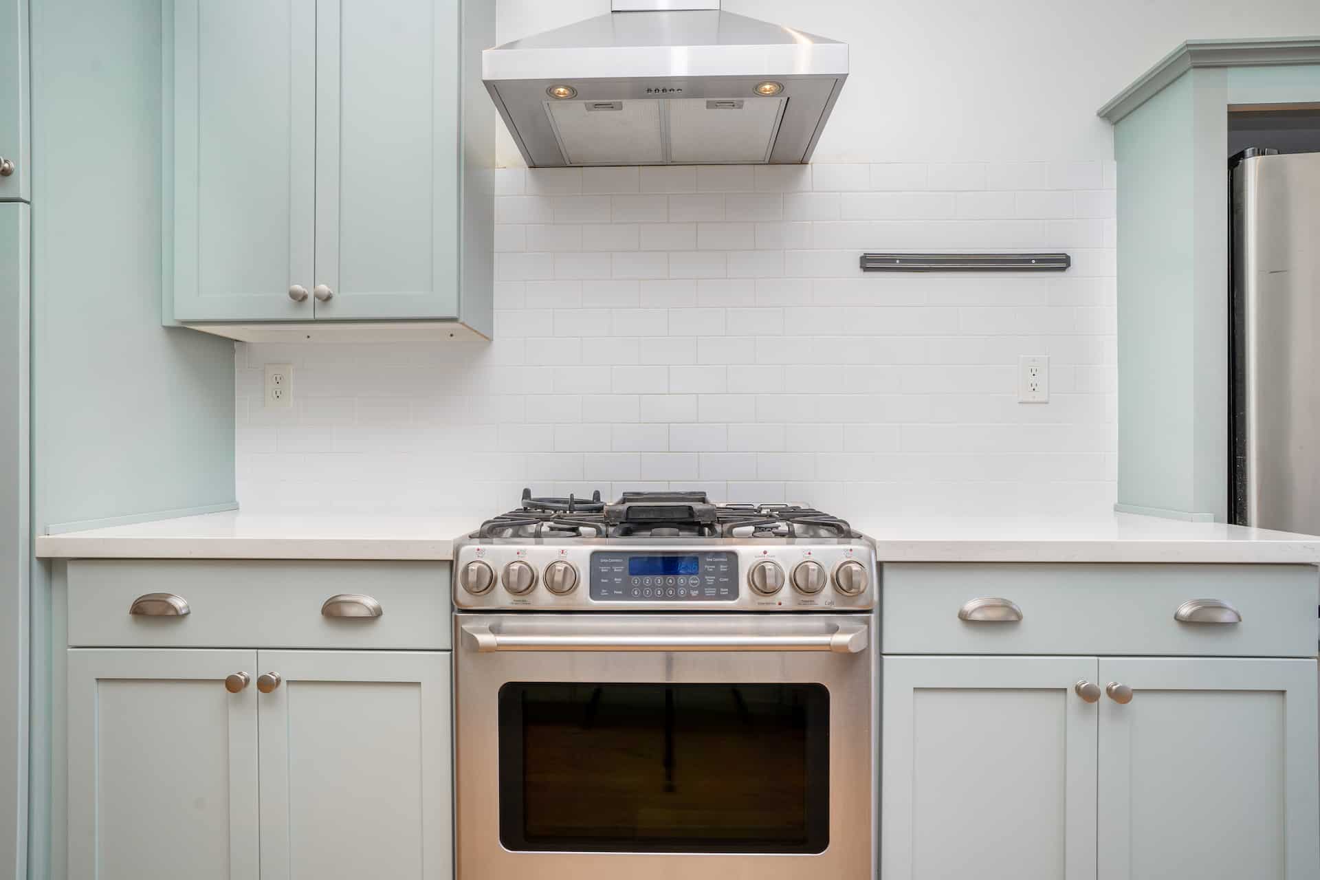 The recently renovated galley kitchen blends from the dining room and has been tastefully updated with new cabinetry, a double-tiered pull out spice rack, and stove.