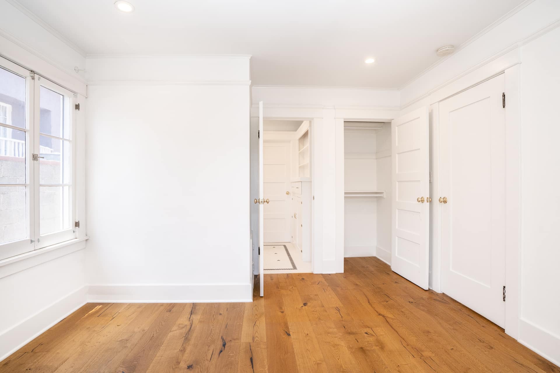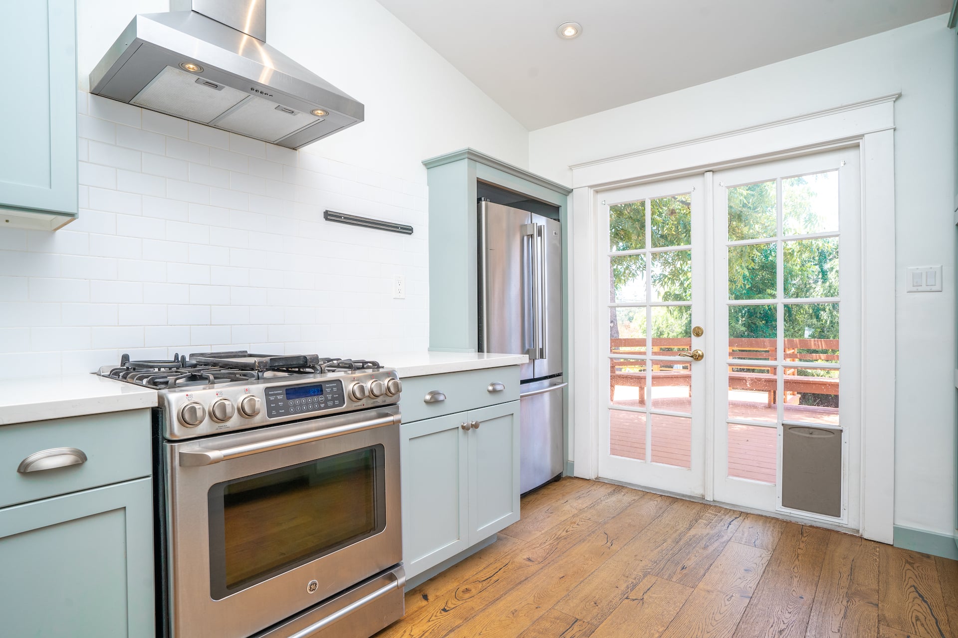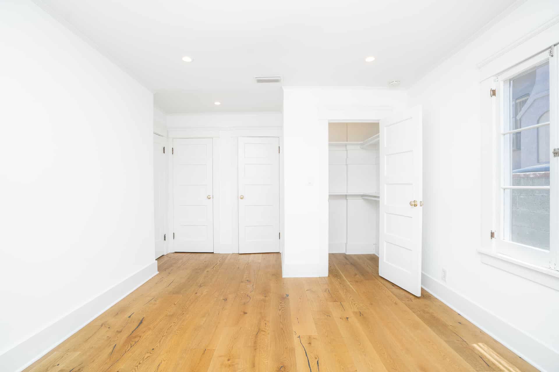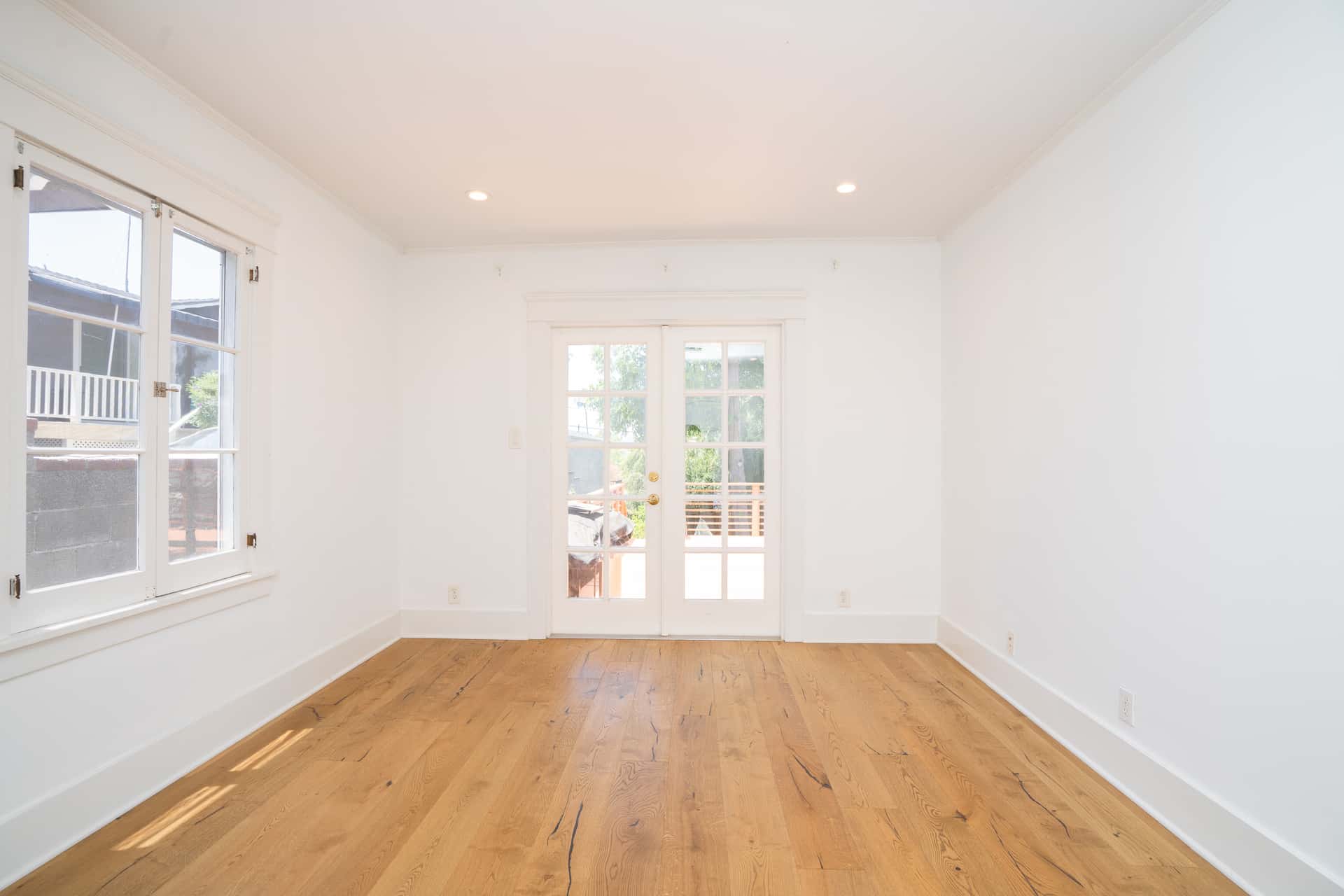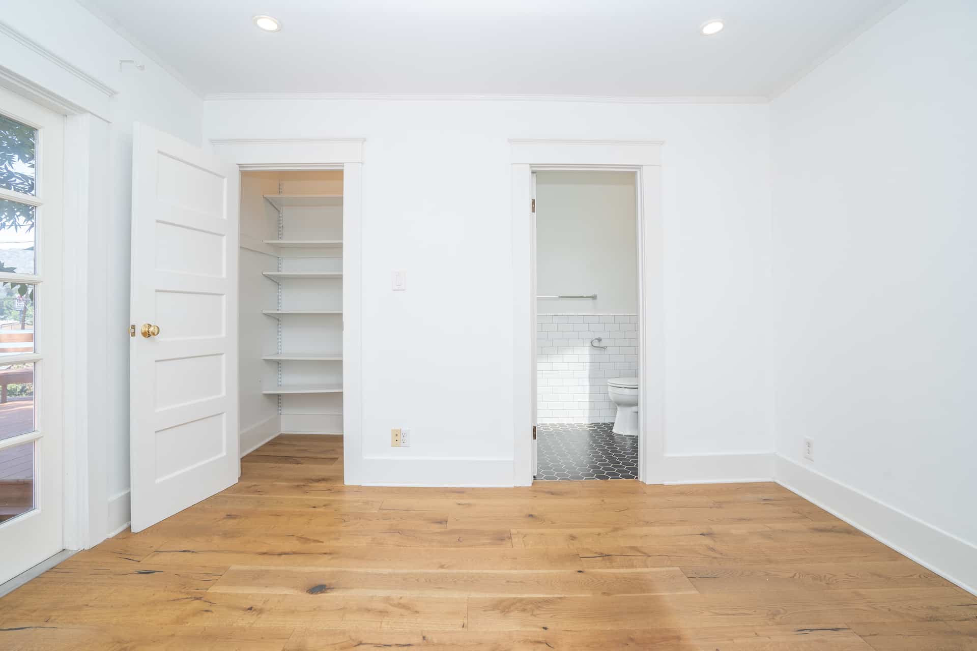 Natural light from the French doors to the deck pour into the primary bedroom.