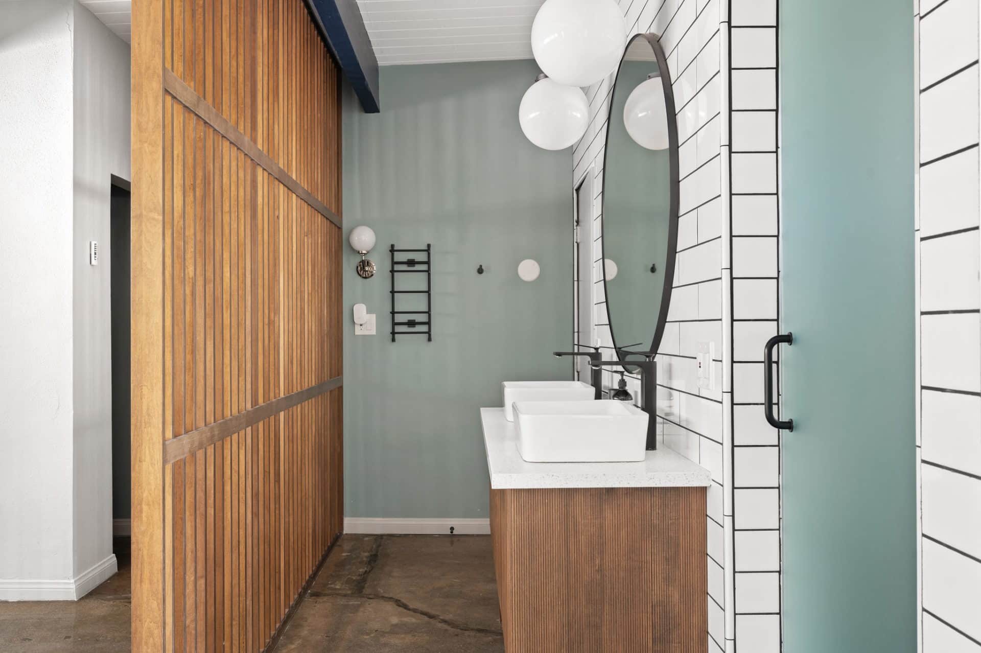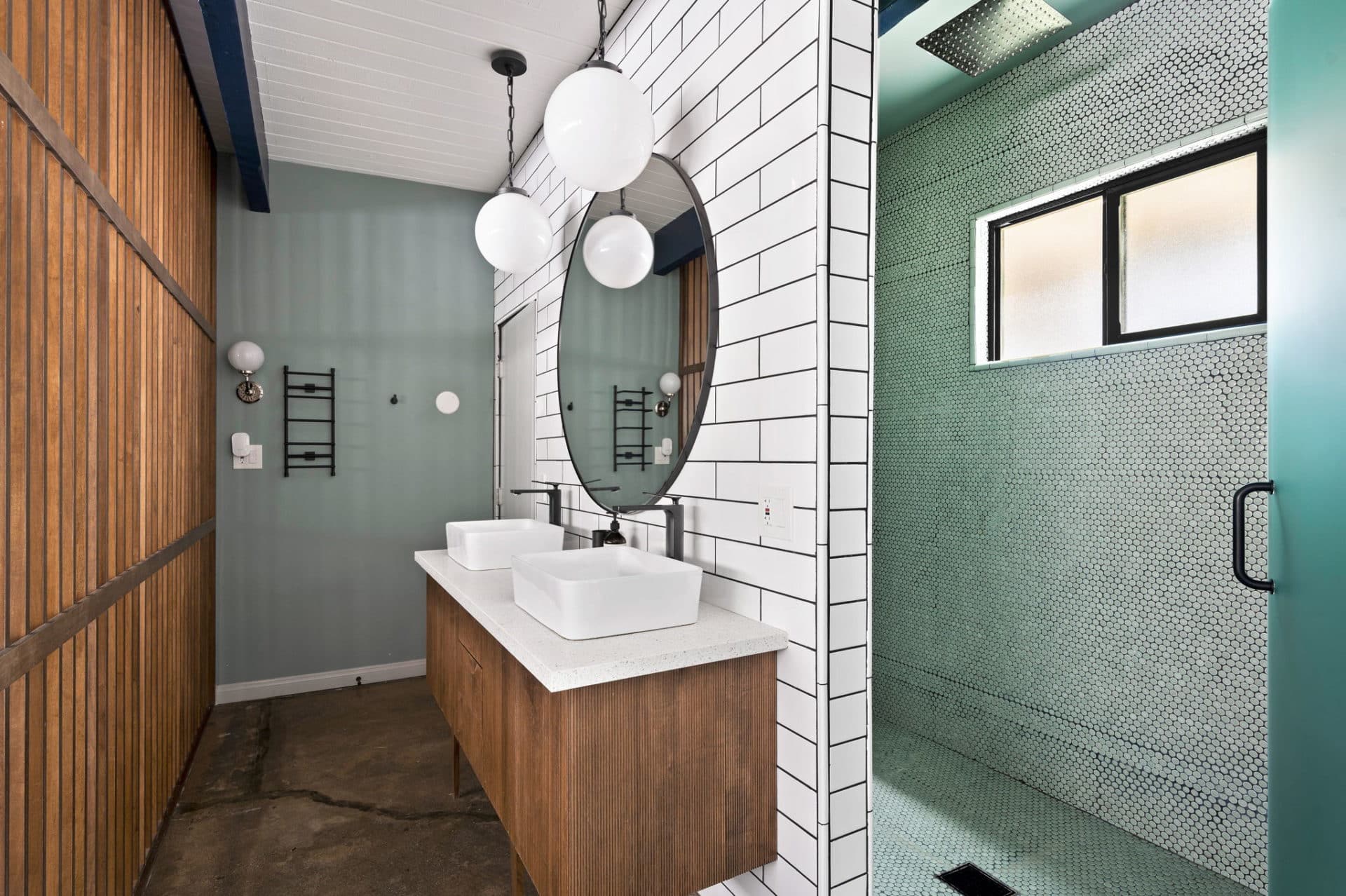 The living room and 4 generously sized bedrooms pop with unique mid-century accent walls, custom-designed wood paneling, and exterior doors.