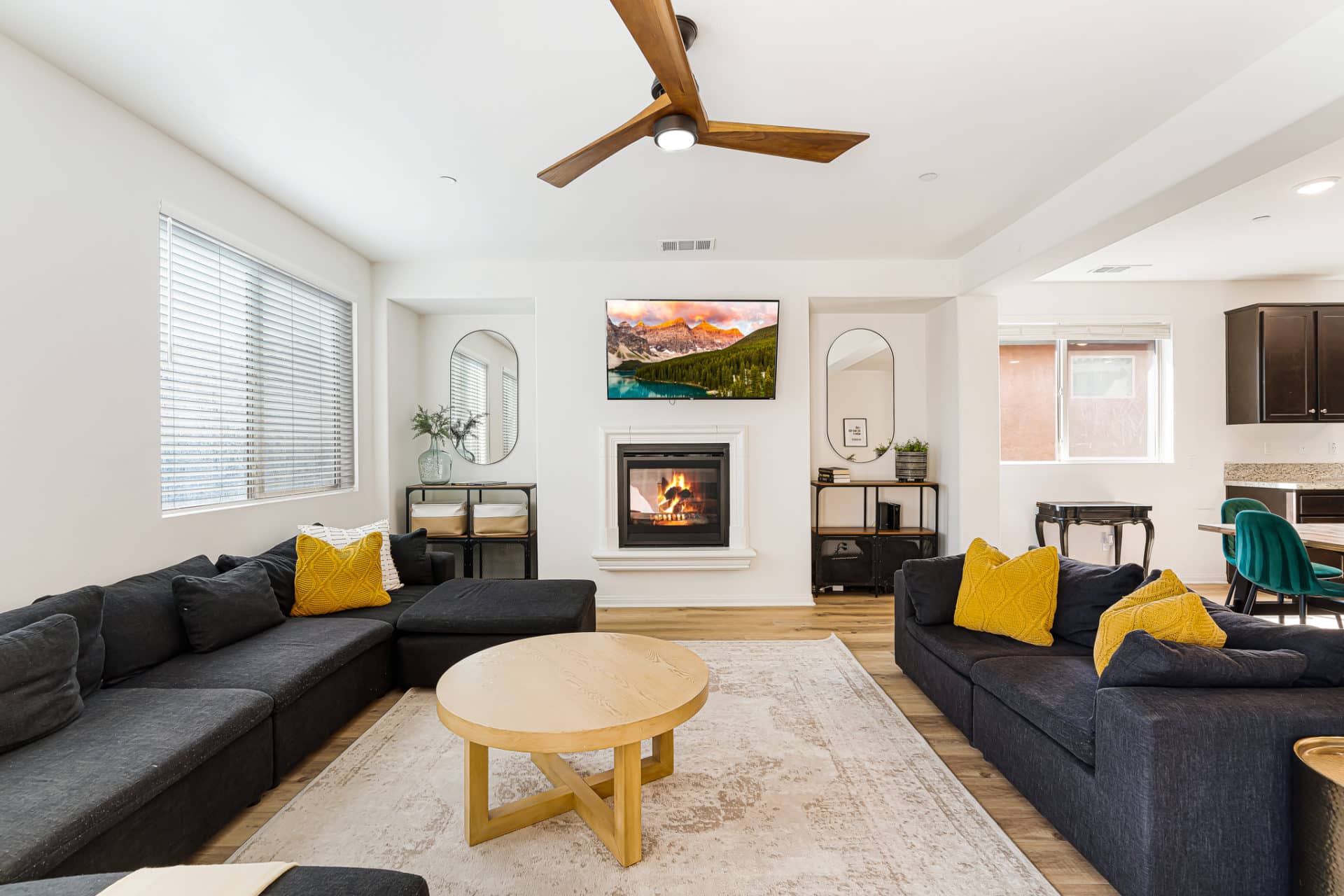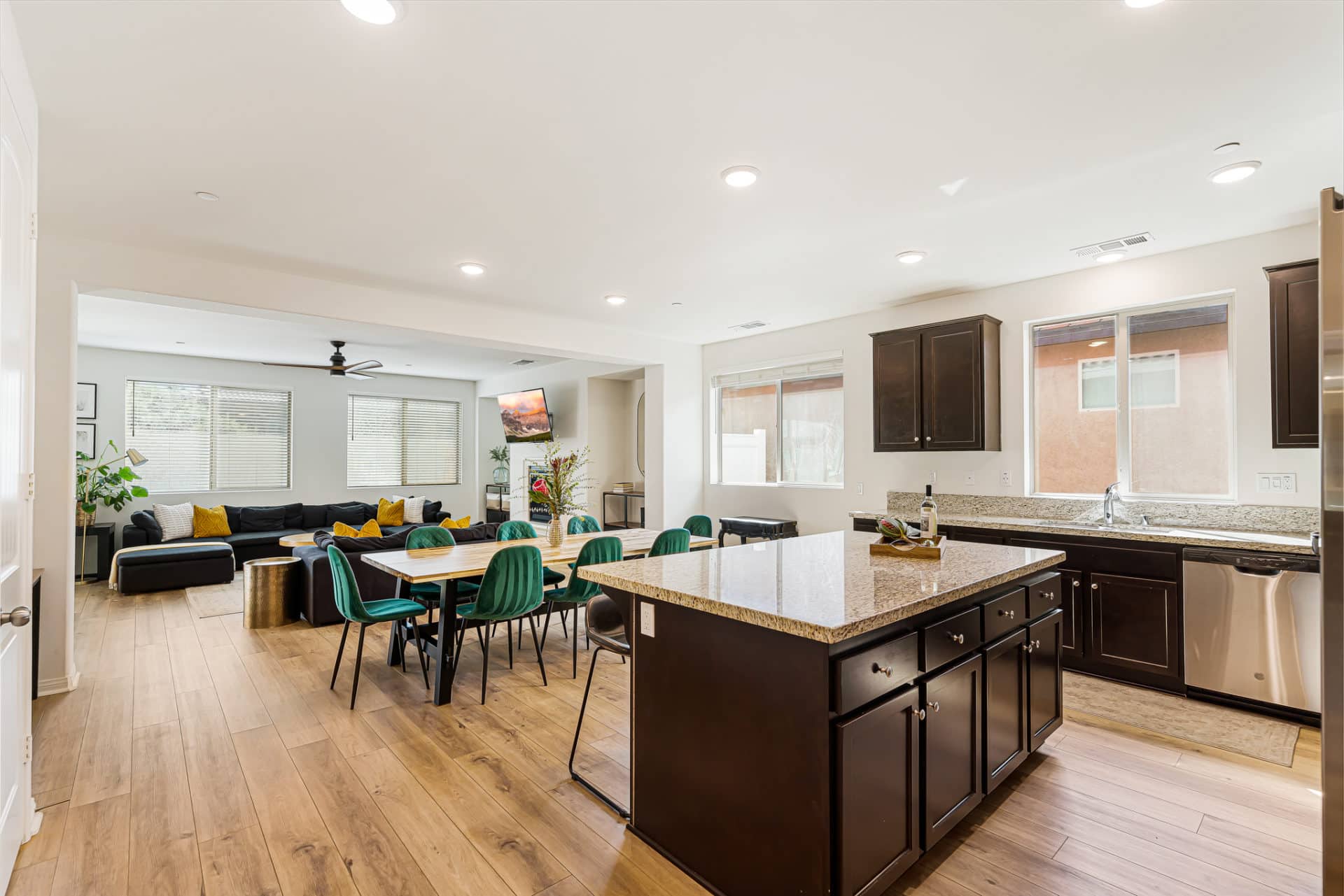 This light and airy 3 bedroom 2.5 bath home is a fully furnished, successfully running Airbnb. You are greeted with luxury vinyl plank white oak floors in the foyer boasting a custom wood slat feature wall that leads you into the open concept living, kitchen and dining area. The kitchen boasts granite countertops, large eat at island that seats four, and stainless steel appliances. The large dining area seats 8 guests comfortably and flows into the spacious living room. Which features a gas fireplace and sliding glass door that opens onto the backyard.