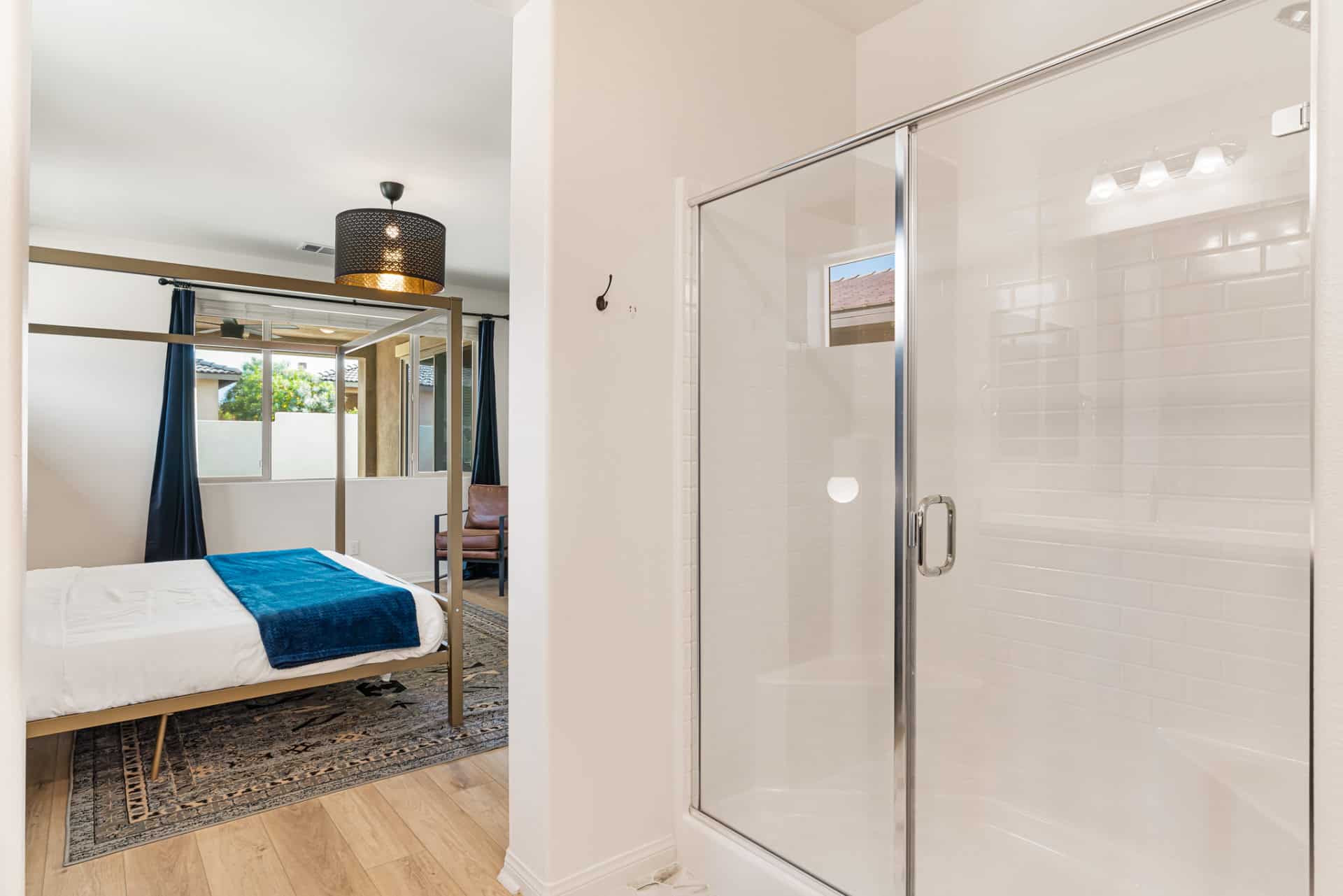 The primary en-suite bedroom showcases a custom geometric feature wall, large window overlooking the backyard, dual sinks on a spacious vanity, walk-in glass shower, and a large walk-in closet. Large laundry room with plenty of counter space and storage is found at the end of the hallway.