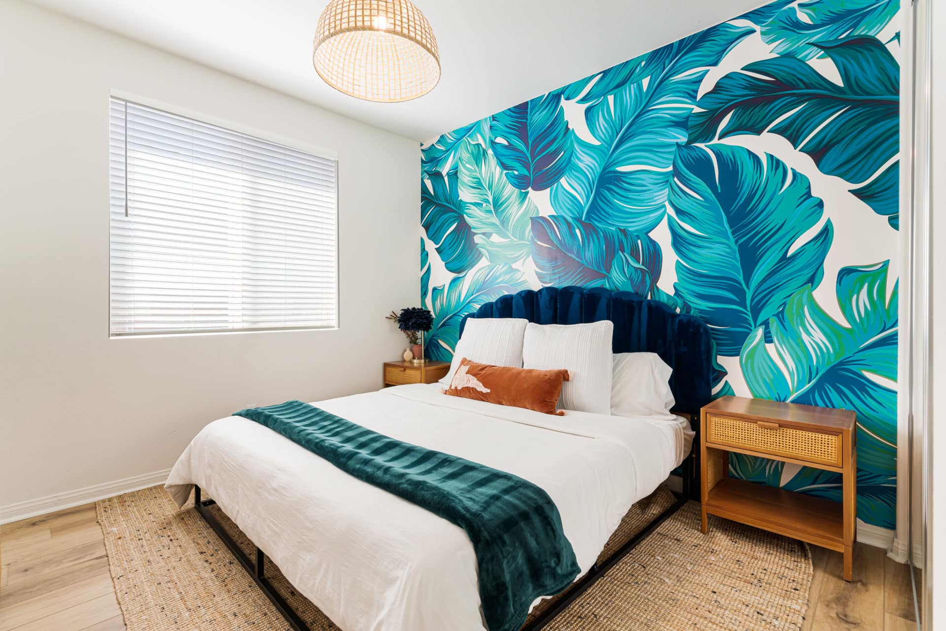 The second en-suite bedroom features a playful banana leaf wallpaper, shower/tub and large vanity.