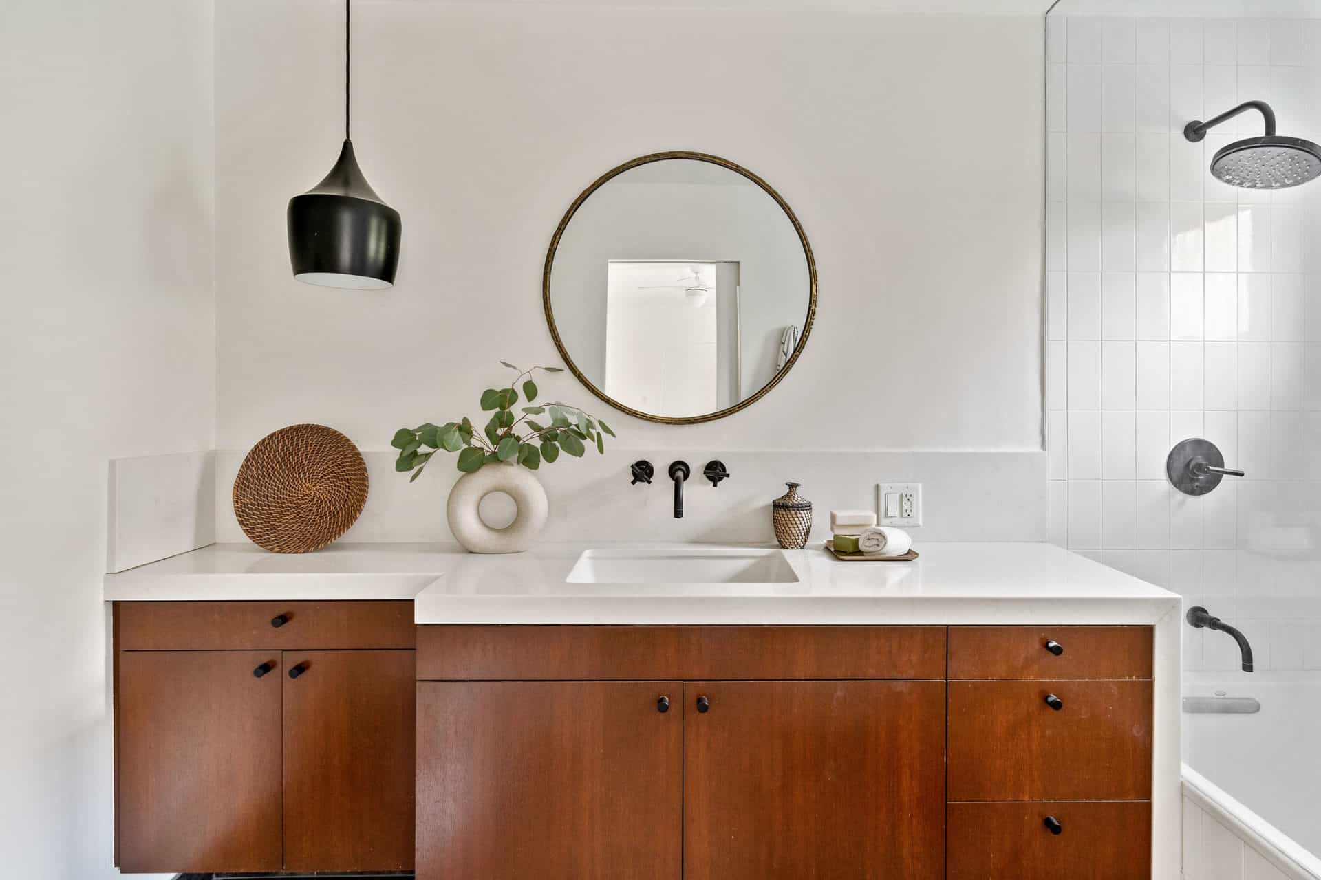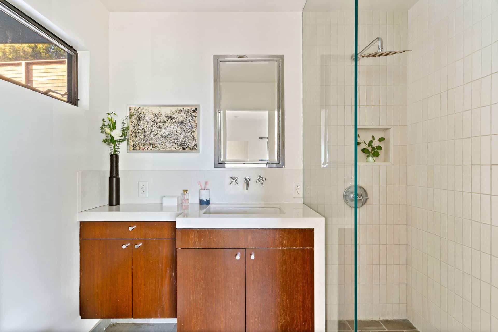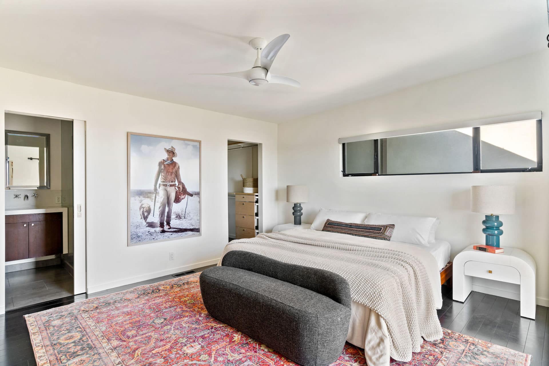 Upstairs, enjoy a large view-facing master suite, featuring walk-in custom closet, private balcony, and bath ensuite with mid-century wood vanity, stone counters, wall-mounted hardware and tile shower.