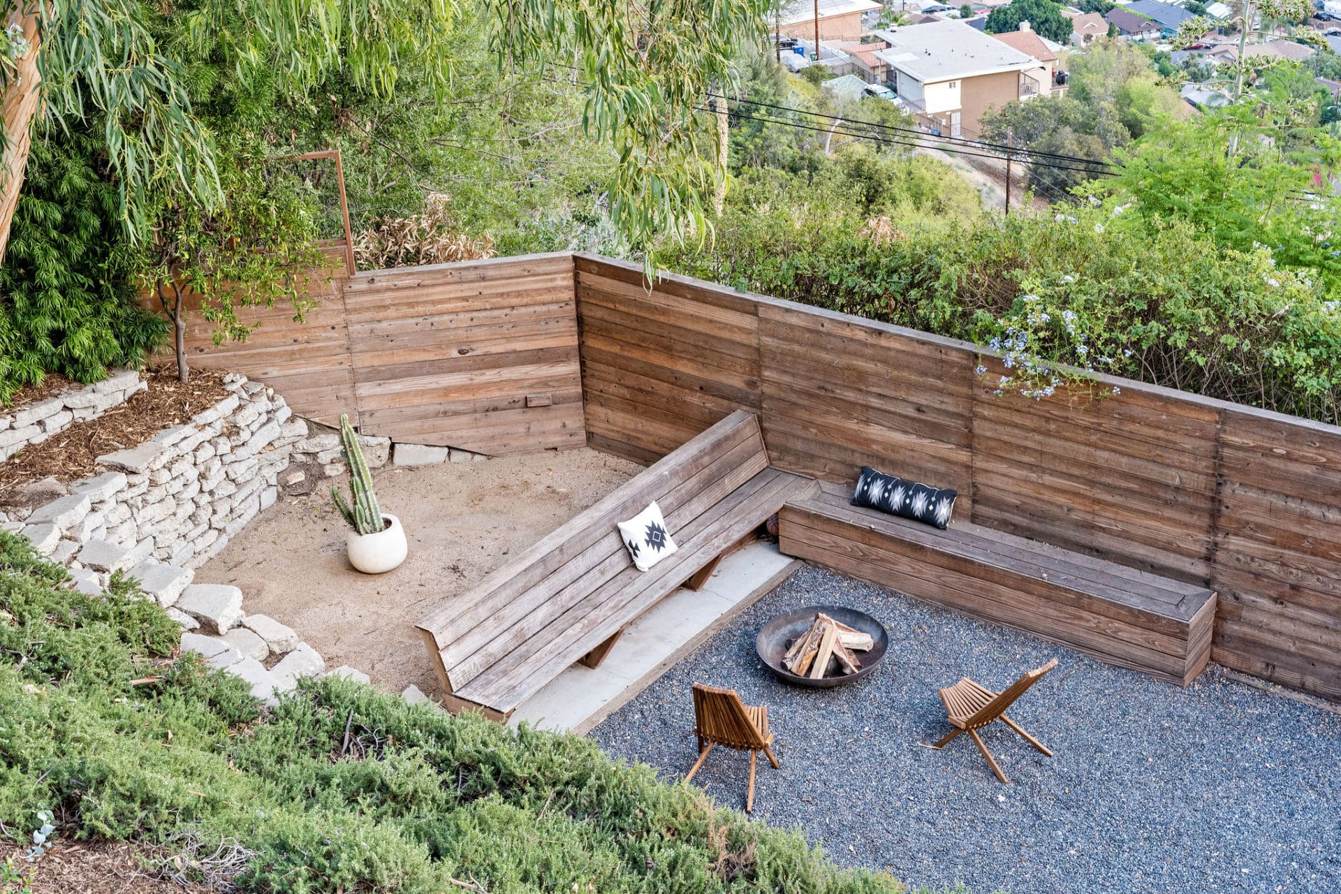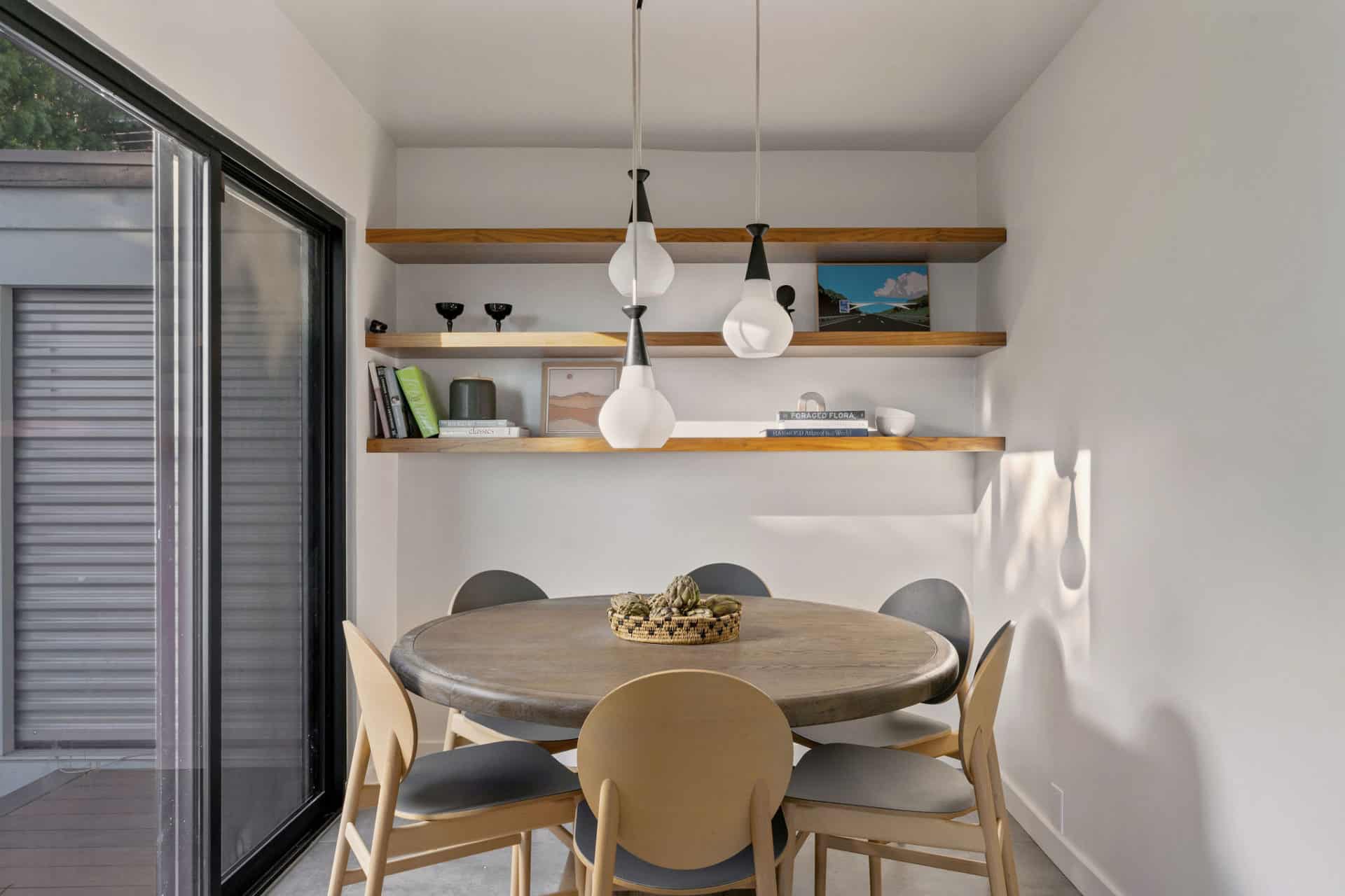 The dining nook features glass sliding doors that open to a pebbled patio—perfect for al fresco dining and panoramic sunsets.